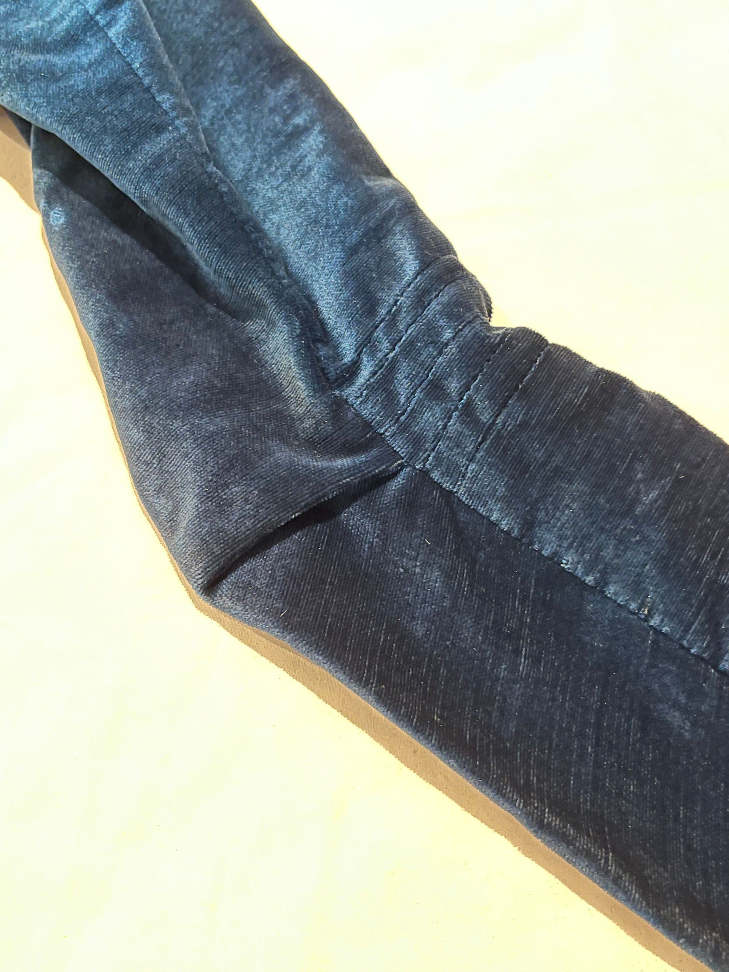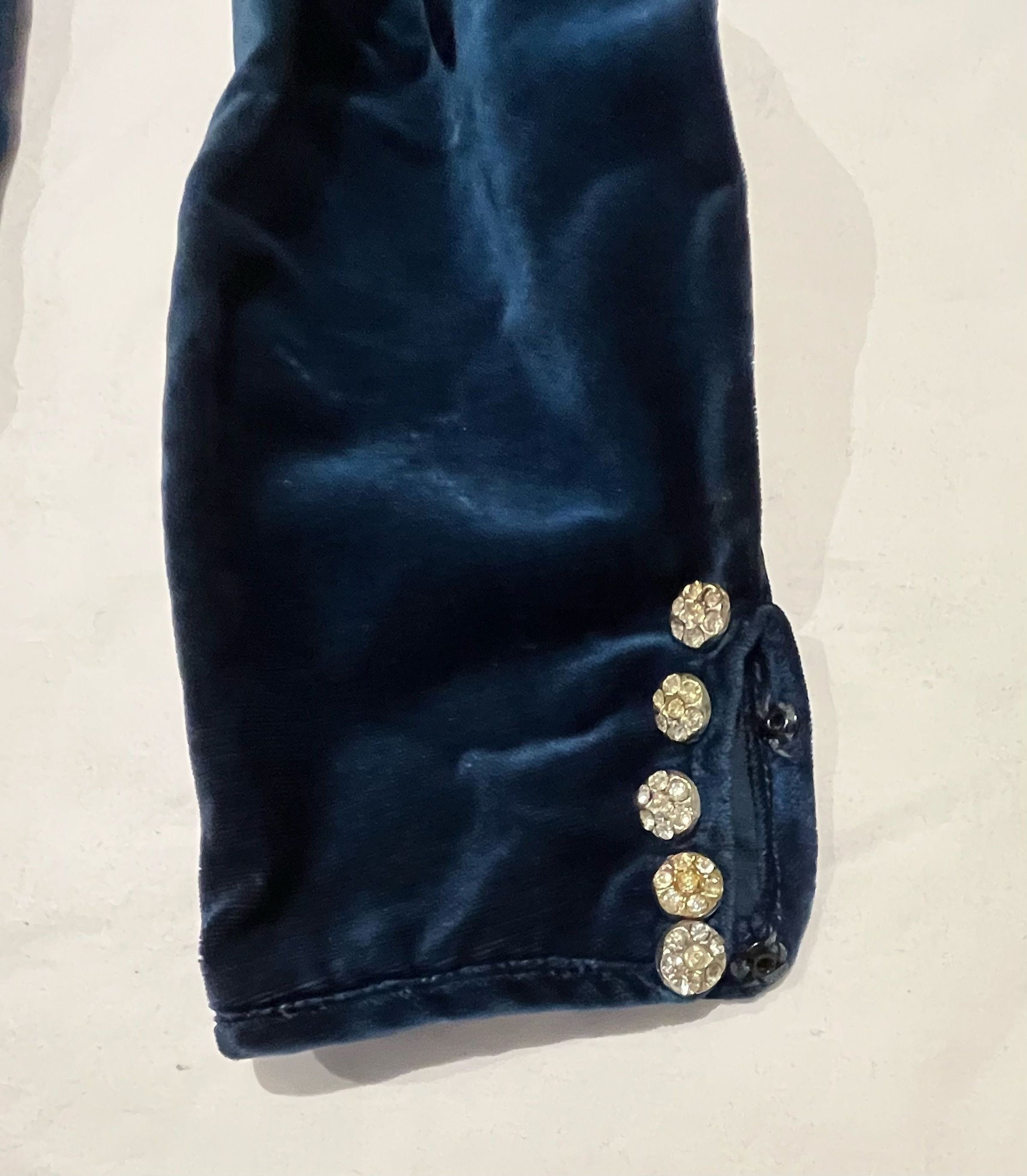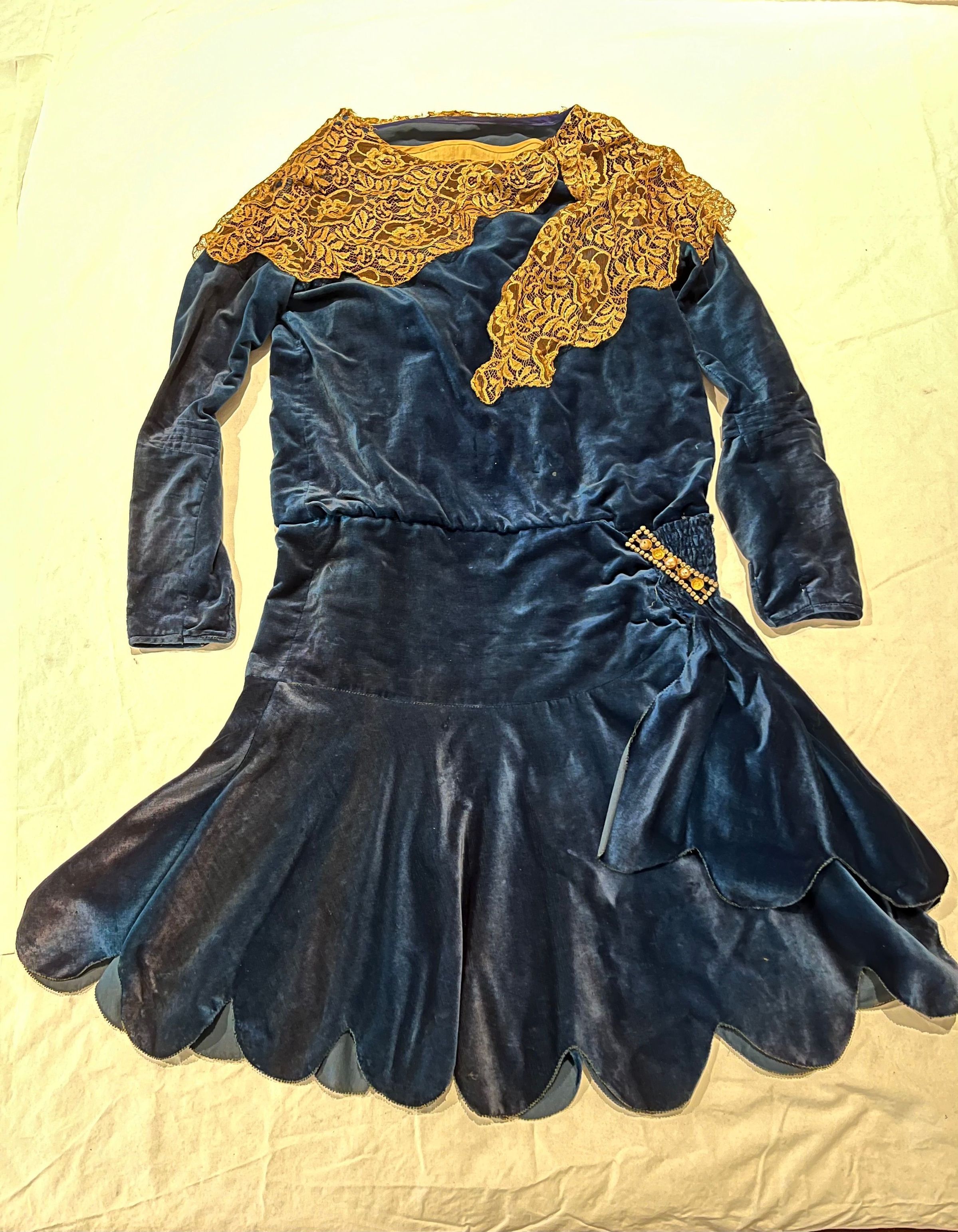 Blue velvet dress, dropped waist, attached skirt with a scalloped hem with tricot edge. Boat neckline is trimmed with an asymmetrical gold lace with a flower leaf pattern and netting. Long narrow sleeves open at the cuff that snap at the wrist and decorated with five round buttons with rhinestones. At the elbow the sleeves have a pleat on the outside and a row of tucks on the inside. On the left side of the dropped waist, a piece of the same blue fabric is sewn on; it is gathered at the top three inches. Near the top it is decorated with a rectangular pin with rhinestones and gold beads, now two missing. Sleeveless cotton lining that goes down to the waist. The lace at the back of the neckline is 13 1/2 inches long.Dimensions