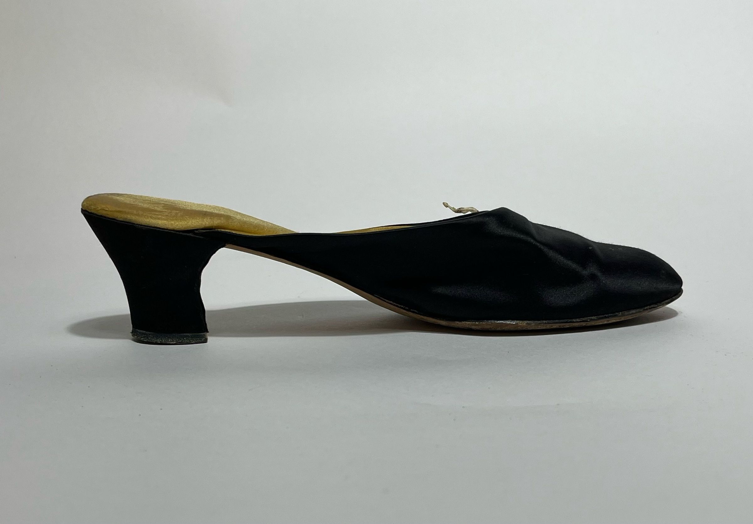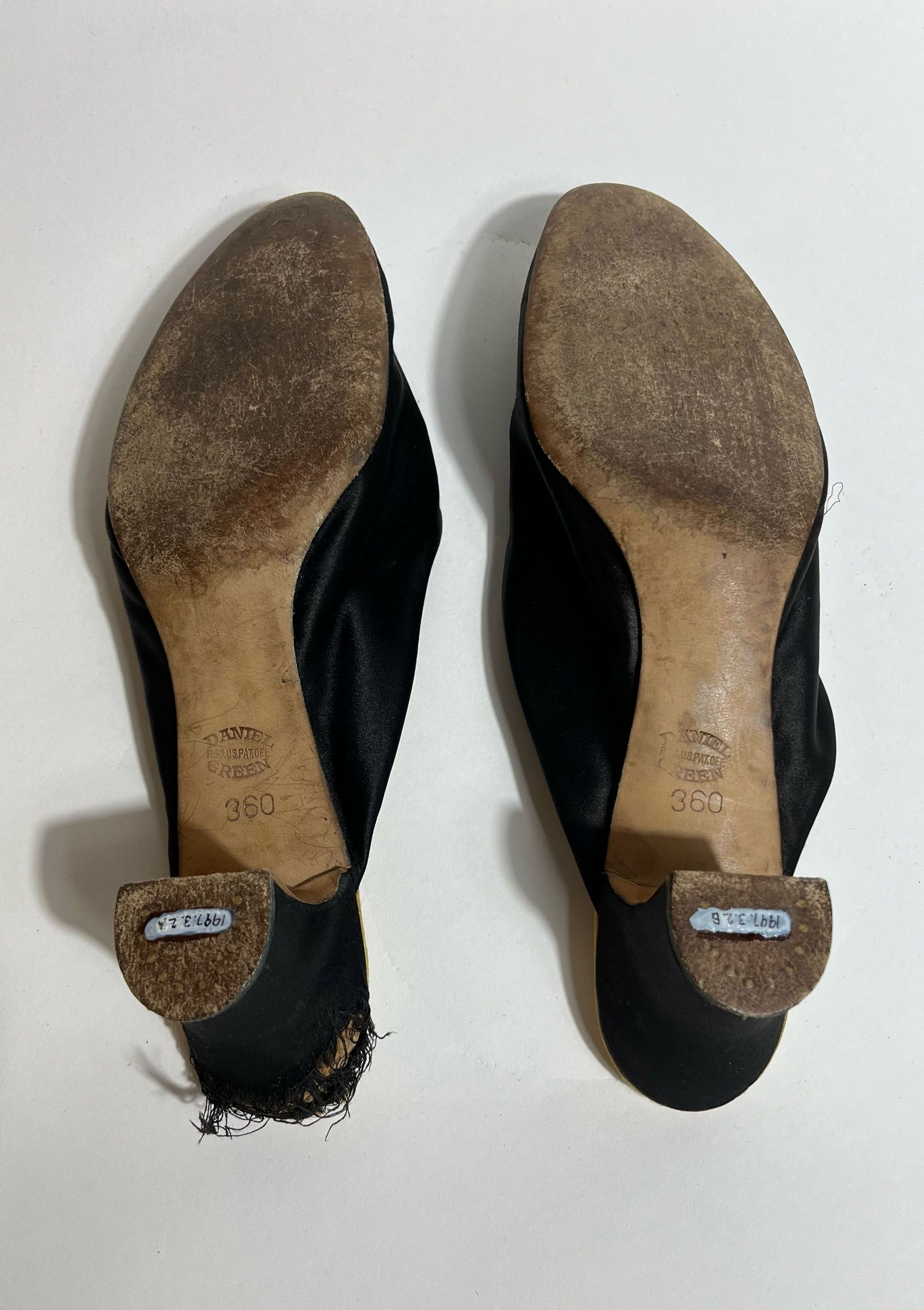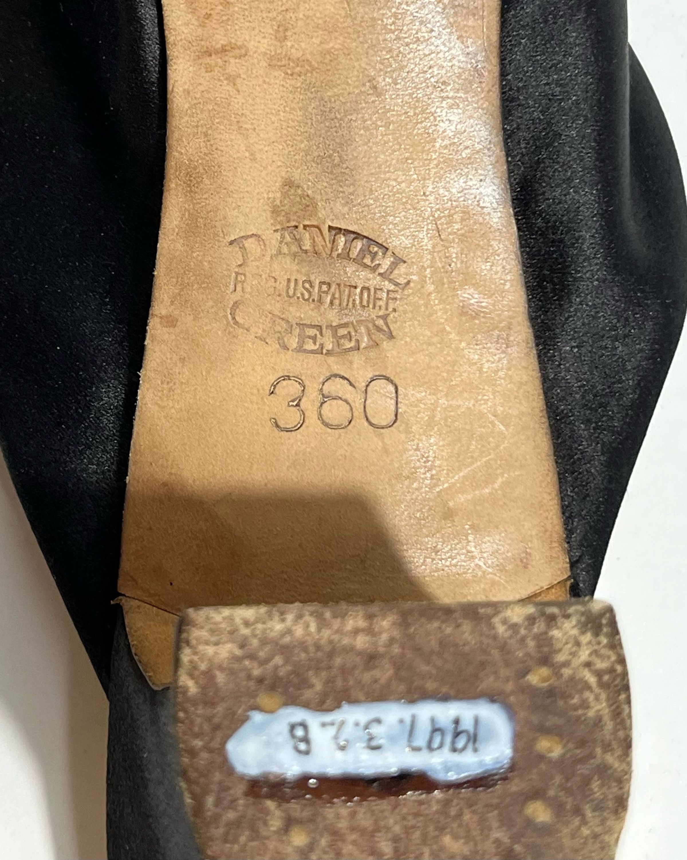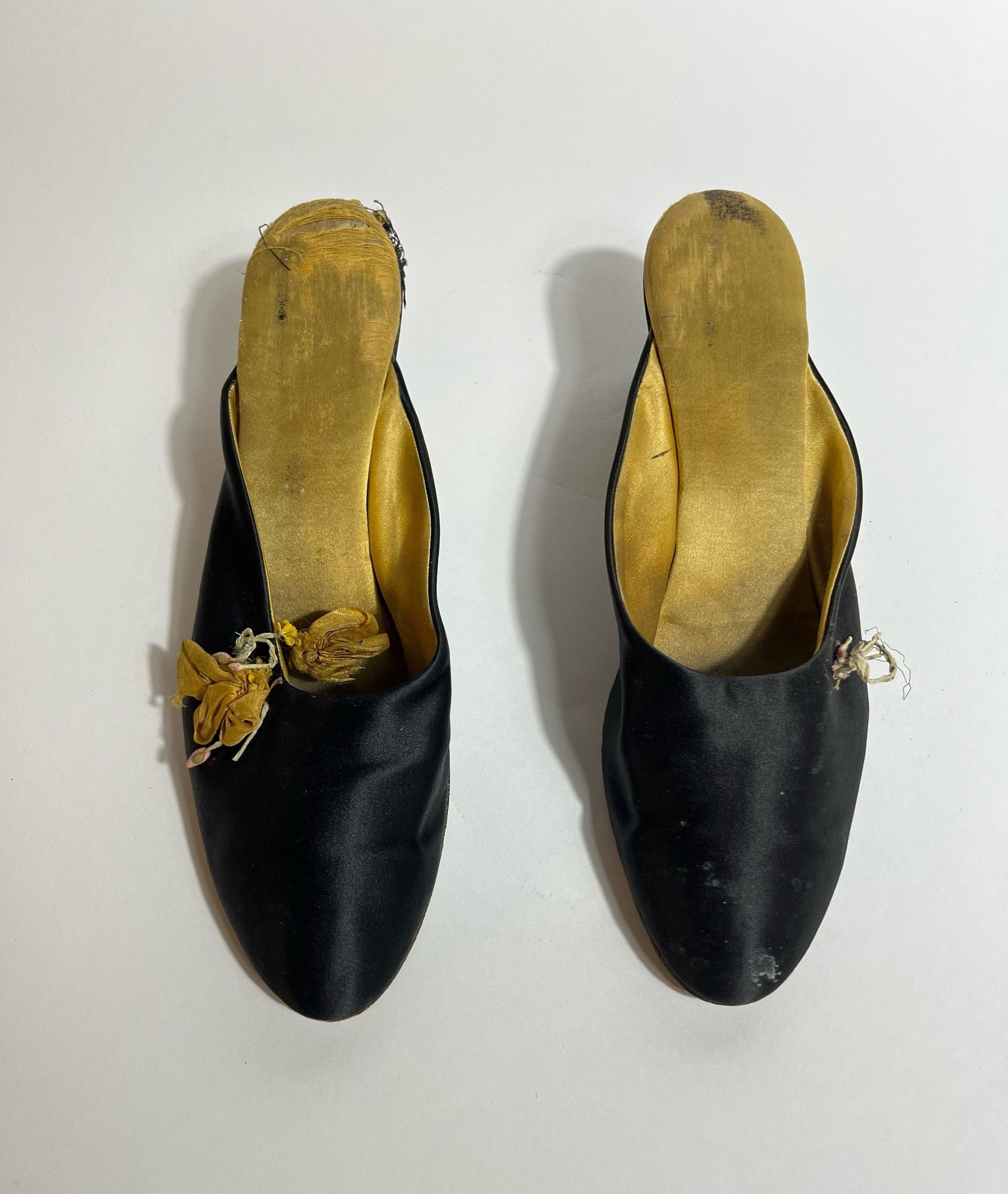 Black silk satin pumps with gold silk linings. Decorated with gold fabric flowers on the outside of the vamp on each shoe; one missing. Two-inch heels. Daniel Green shoe model 360.Dimensions
