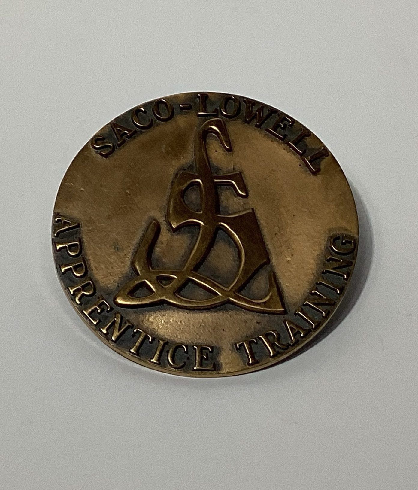 Round bronze plaque with the the interlocking S and L logo of the Saco-Lowell Shops in the center surrounded by "Saco-Lowell / Apprentice Training". The back of the plaque has two mounting screws.