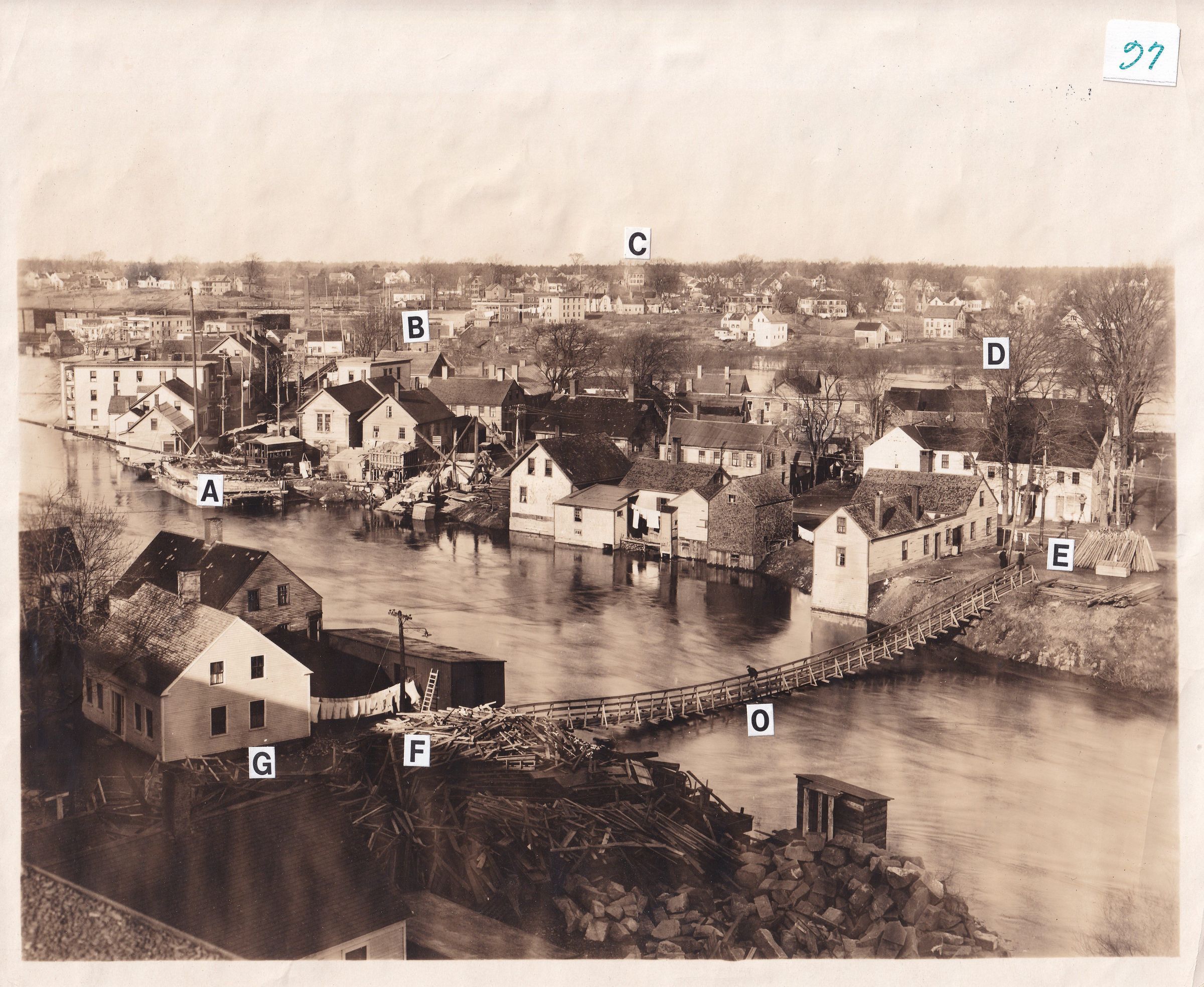 A footbridge over the Saco River. Somesville is the island on the far side of the river. There is no key with the photograph to identify the various locations indicated by letters affixed to the print.Made/Created