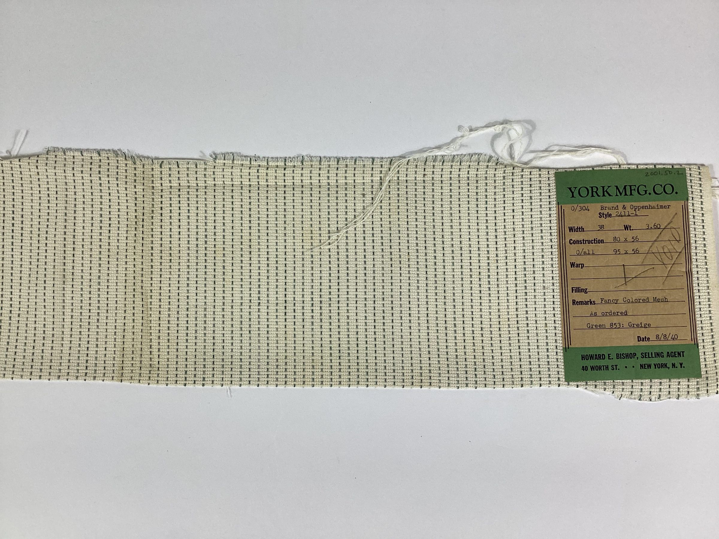 York Manufacturing Company fabric sample of fancy colored mesh in green and greige. The sample has a paper label which lists the customer number and name, style number, width and weight of the fabric, construction, reed size, type of warp and filling yarns, type of fabric, date, and name of the selling agent, Howard E. Bishop of 40 Worth Street, New York, NY.Materials