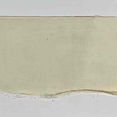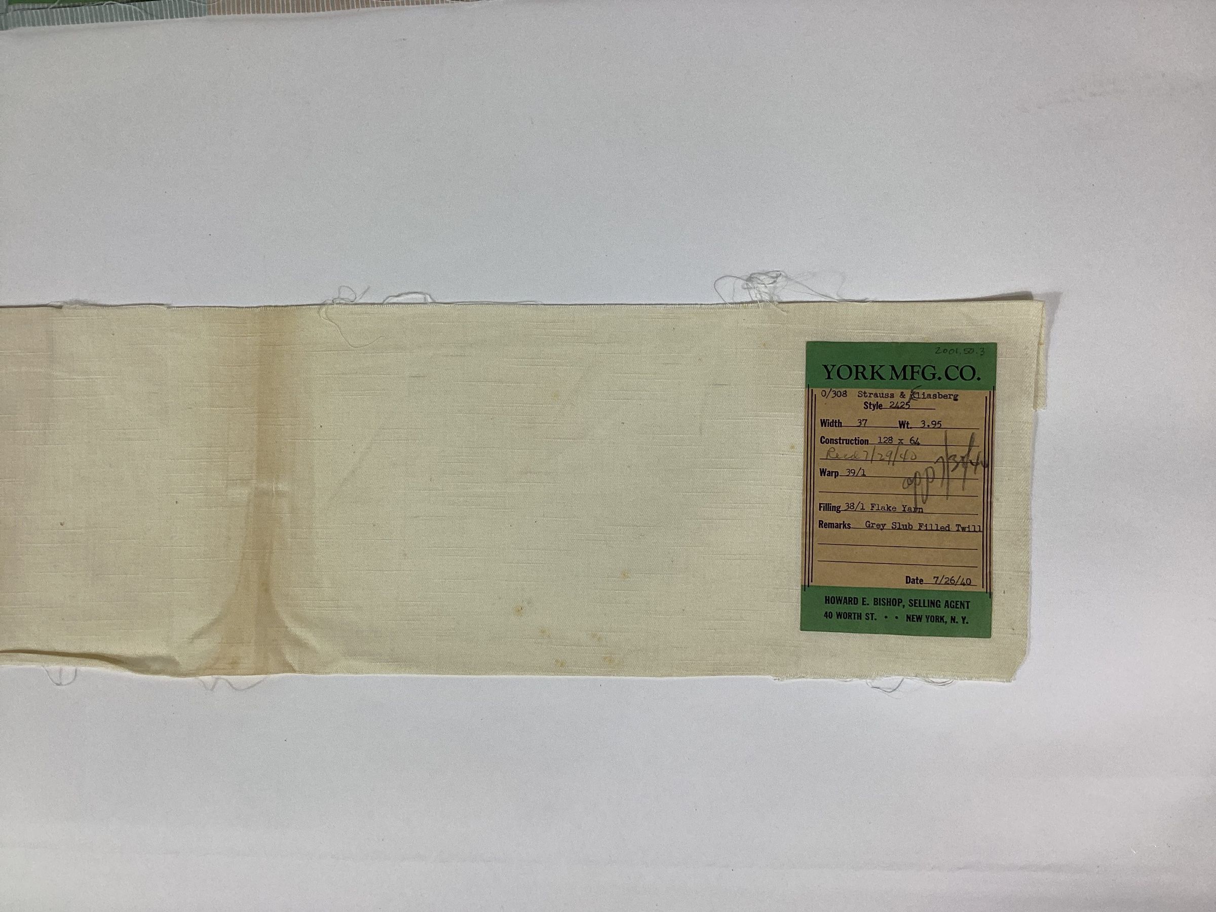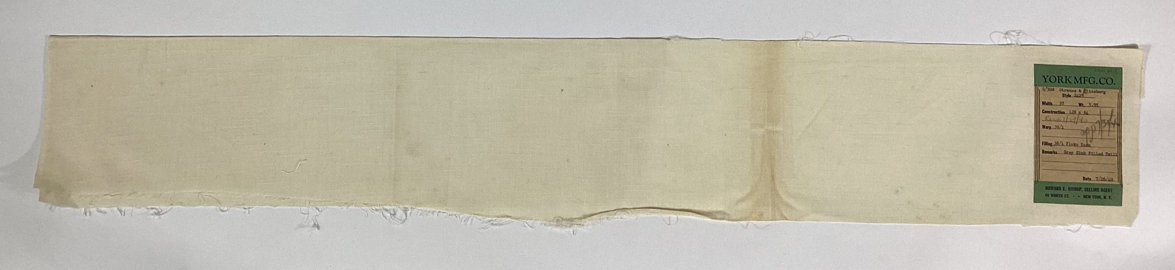York Manufacturing Company fabric sample of gray slub-filled twill. The sample has a paper label which lists the customer number and name, style number, width and weight of the fabric, construction, reed size, type of warp and filling yarns, type of fabric, date, and name of the selling agent, Howard E. Bishop of 40 Worth Street, New York, NY.Materials