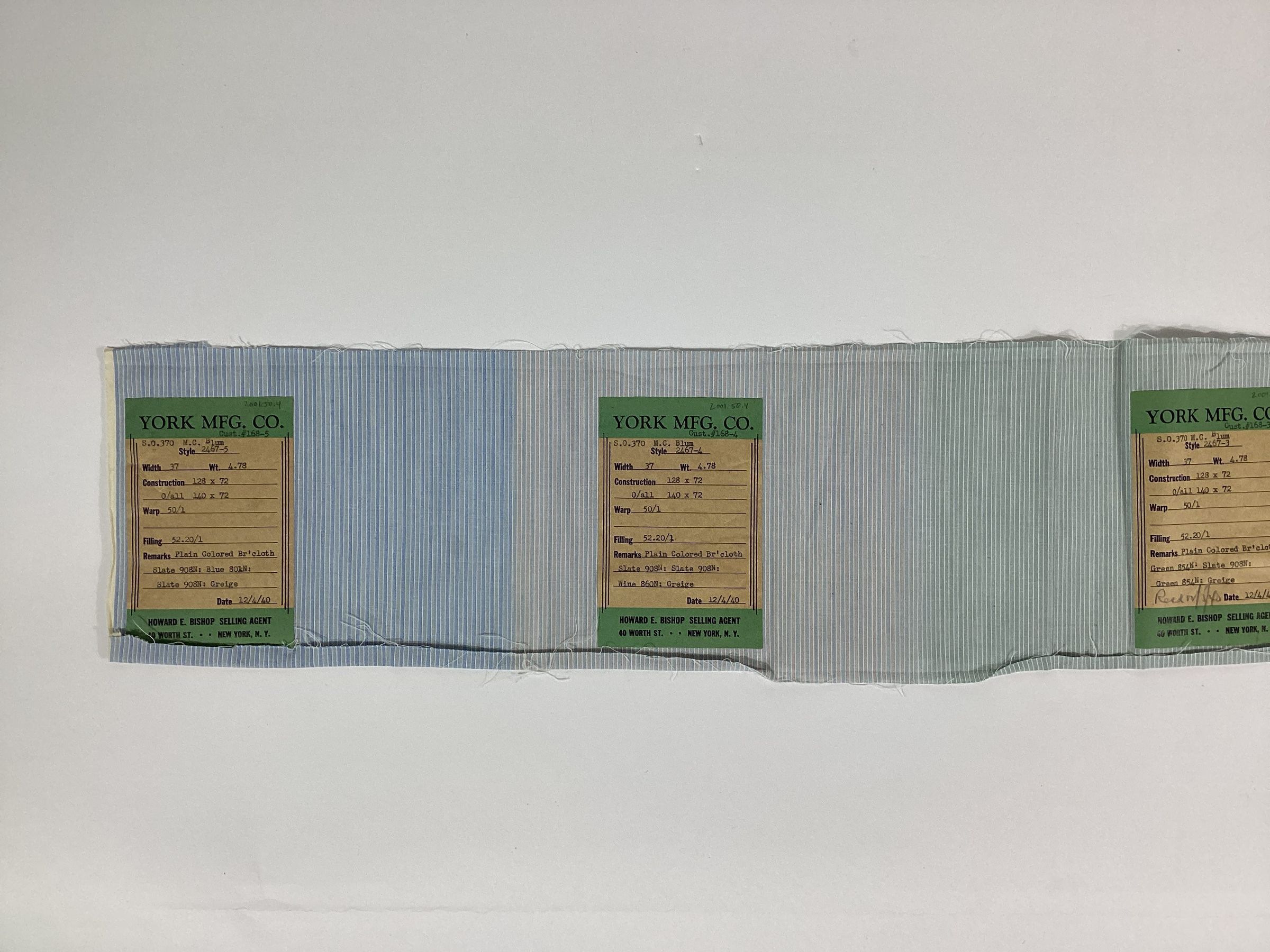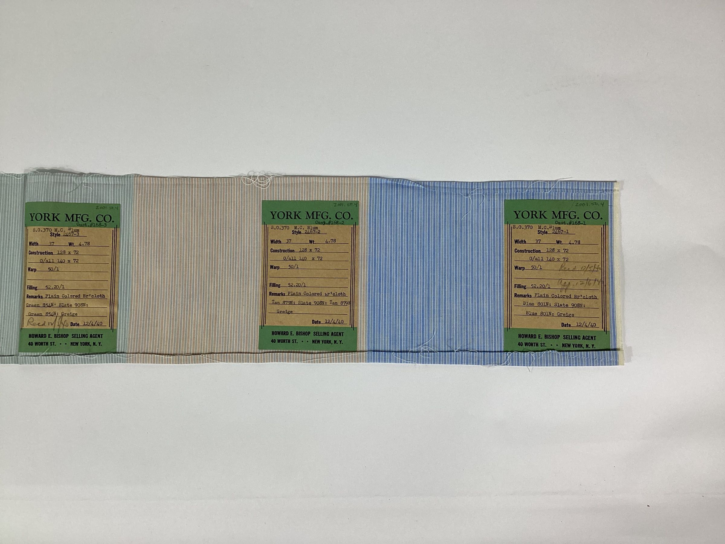 York Manufacturing Company fabric sample of plain colored broadcloth in a variety of colors. Each colorway has a paper label which lists the customer number and name, style number, width and weight of the fabric, construction, reed size, type of warp and filling yarns, type of fabric, date, and name of the selling agent, Howard E. Bishop of 40 Worth Street, New York, NY.Materials