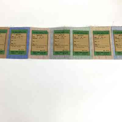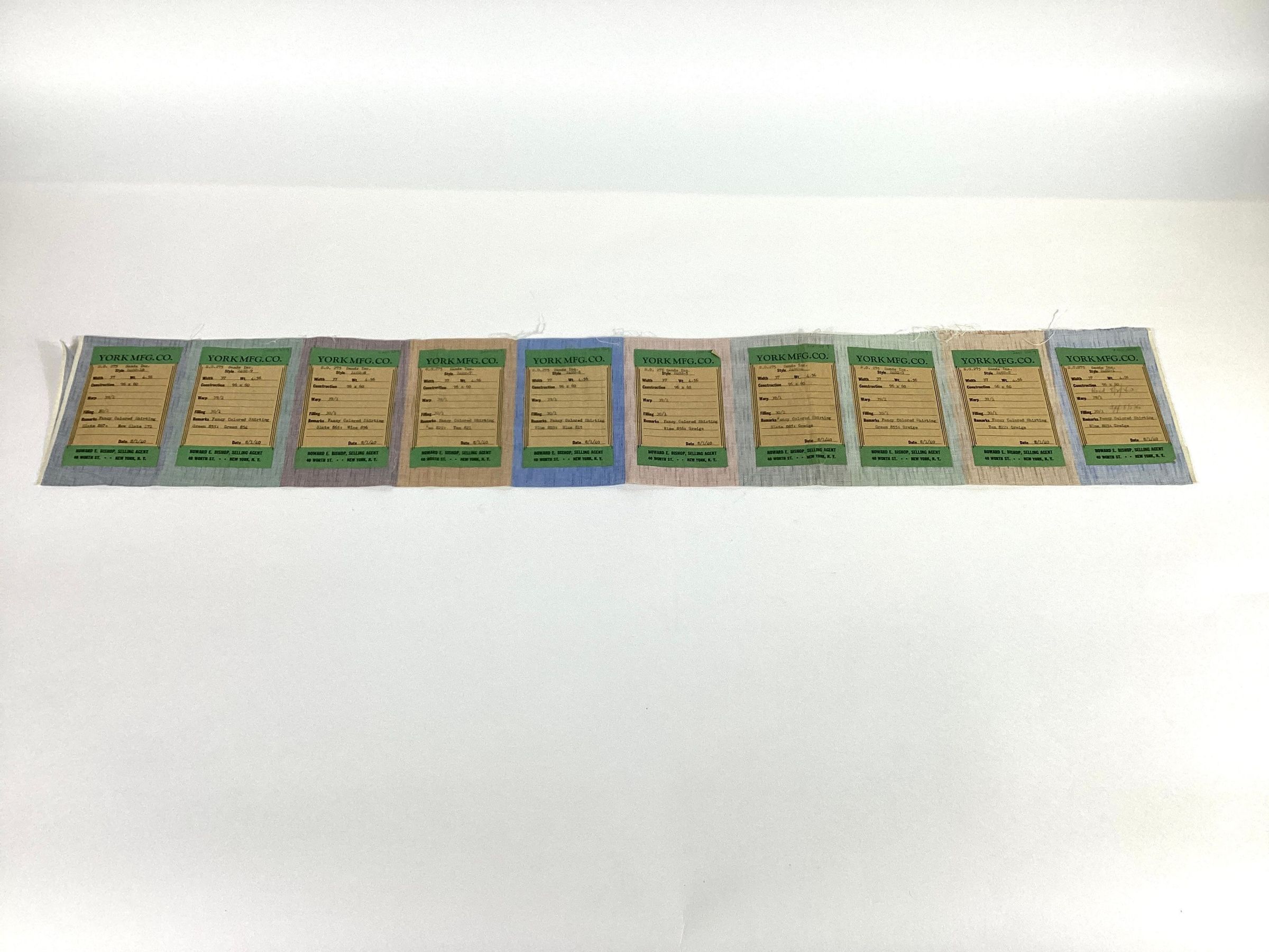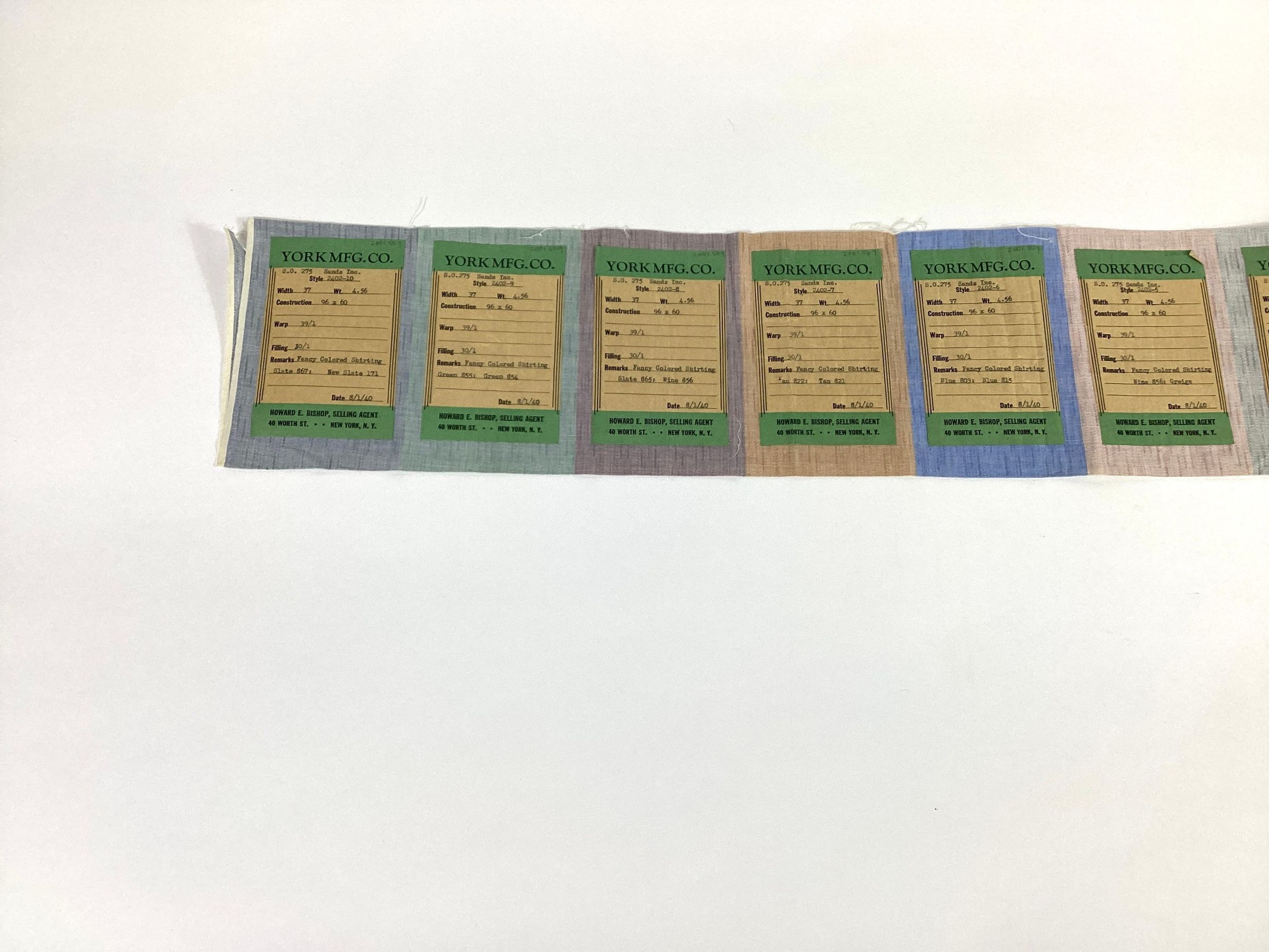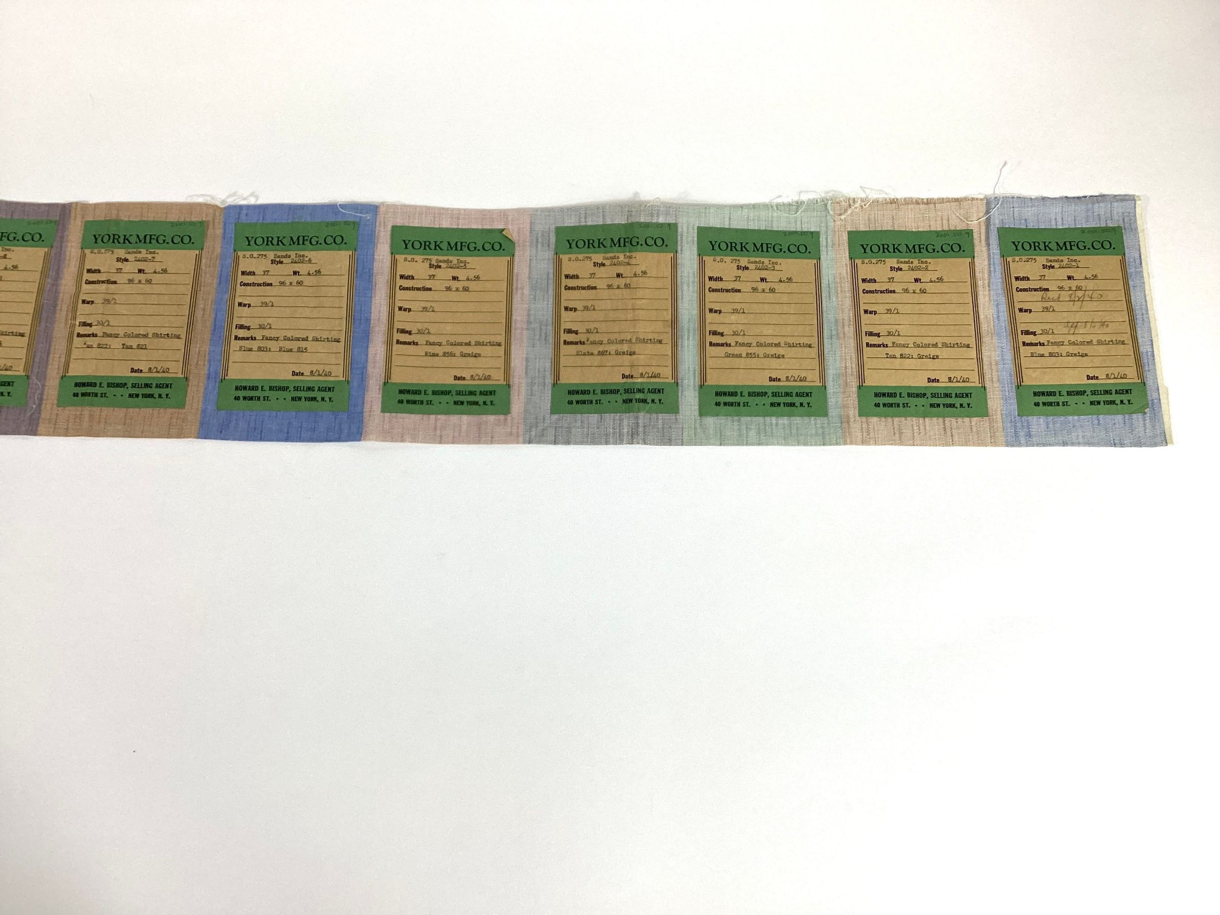 York Manufacturing Company fabric sample of plain colored shirting in a range of colors. Each colorway has a paper label which lists the customer number and name, style number, width and weight of the fabric, construction, reed size, type of warp and filling yarns, type of fabric, date, and name of the selling agent, Howard E. Bishop of 40 Worth Street, New York, NY.Materials