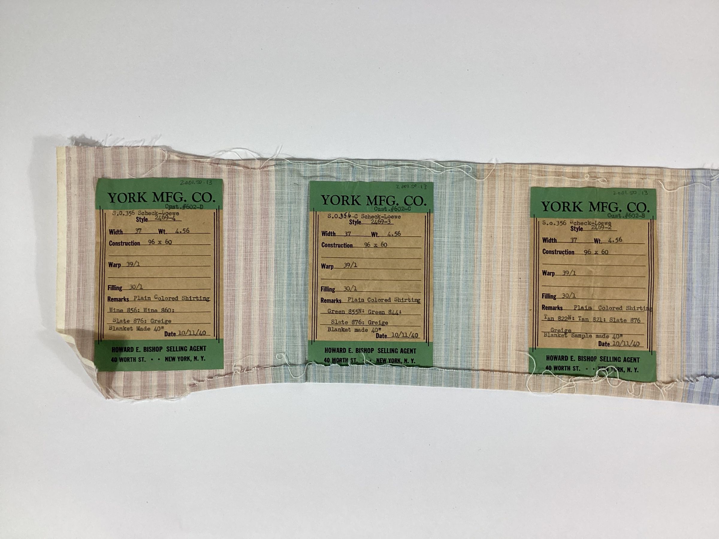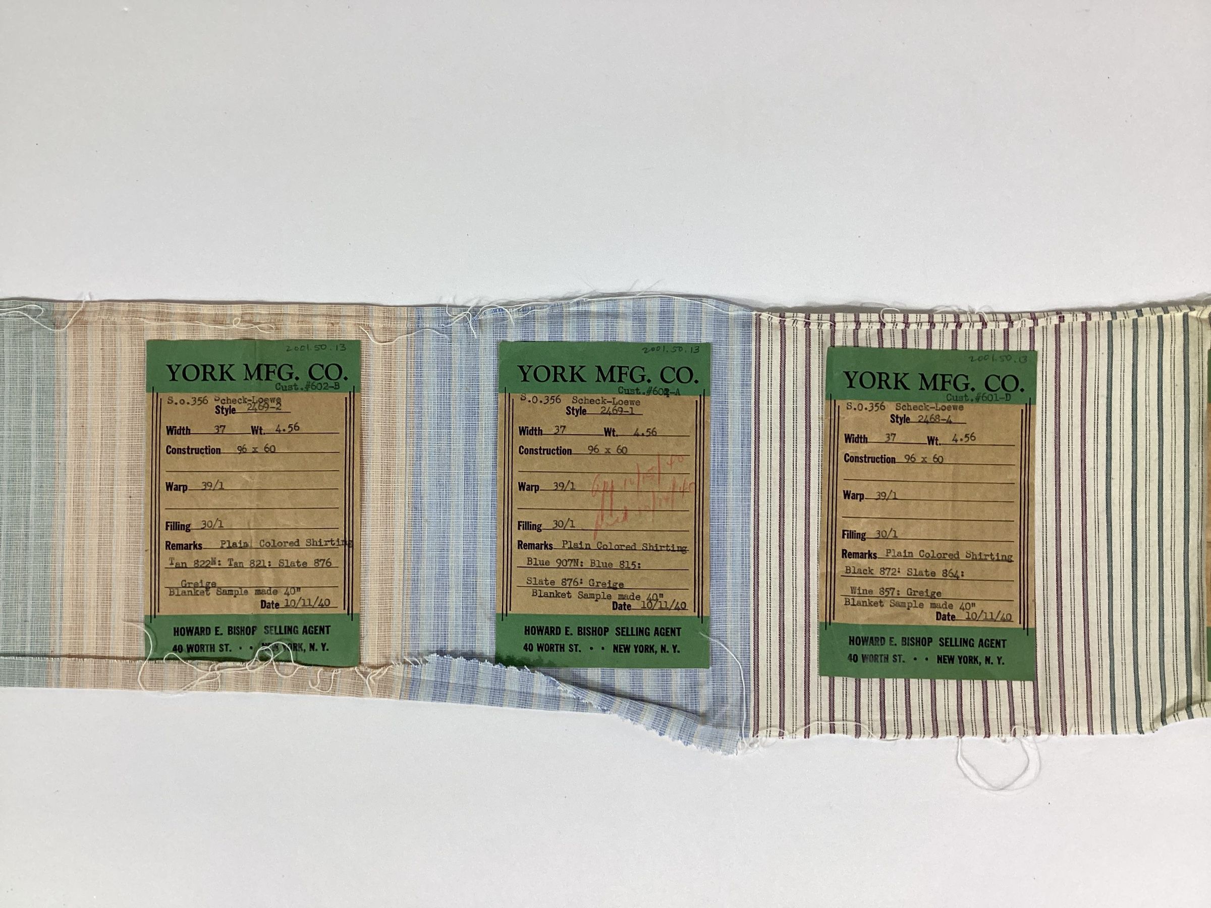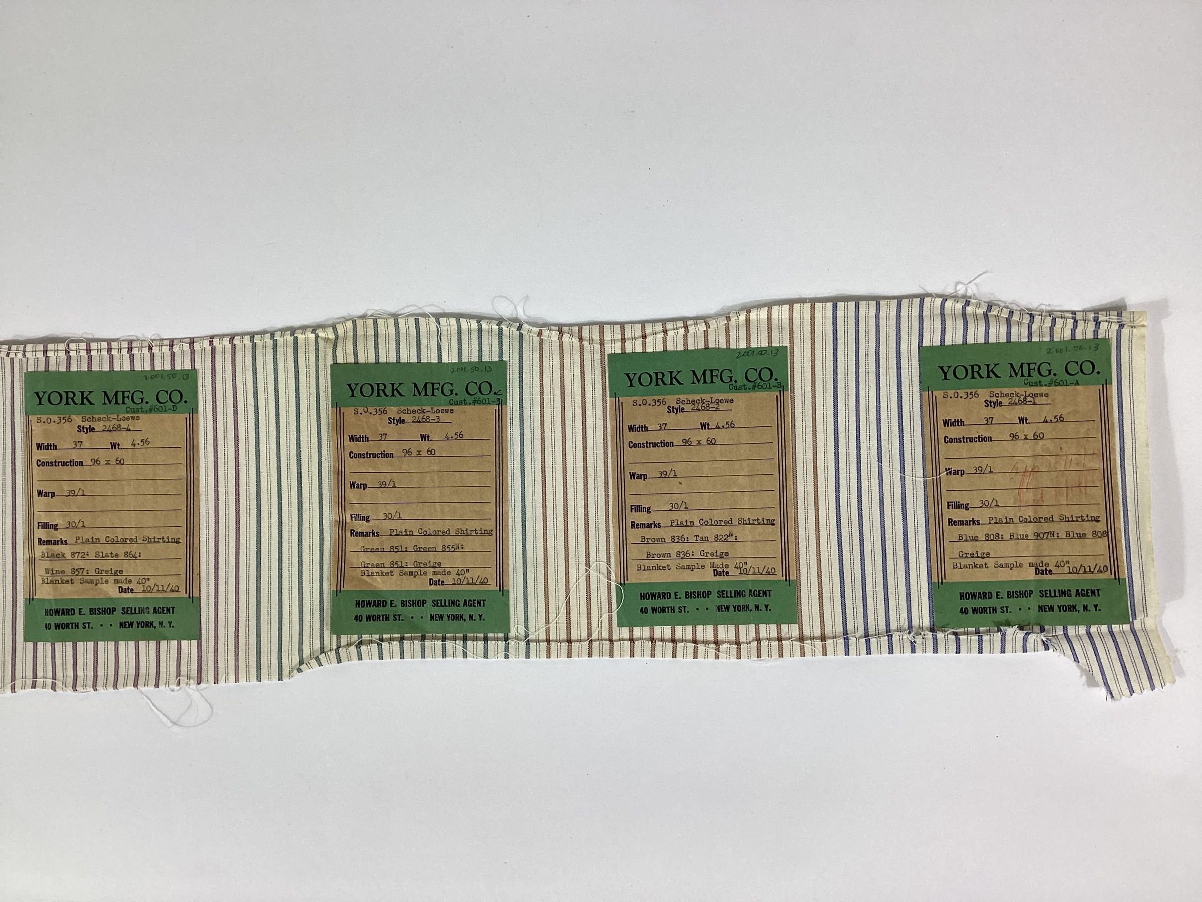 York Manufacturing Company fabric sample of plain colored shirting in a range of colors. Each colorway has a paper label which lists the customer number and name, style number, width and weight of the fabric, construction, reed size, type of warp and filling yarns, type of fabric, date, and name of the selling agent, Howard E. Bishop of 40 Worth Street, New York, NY.Materials