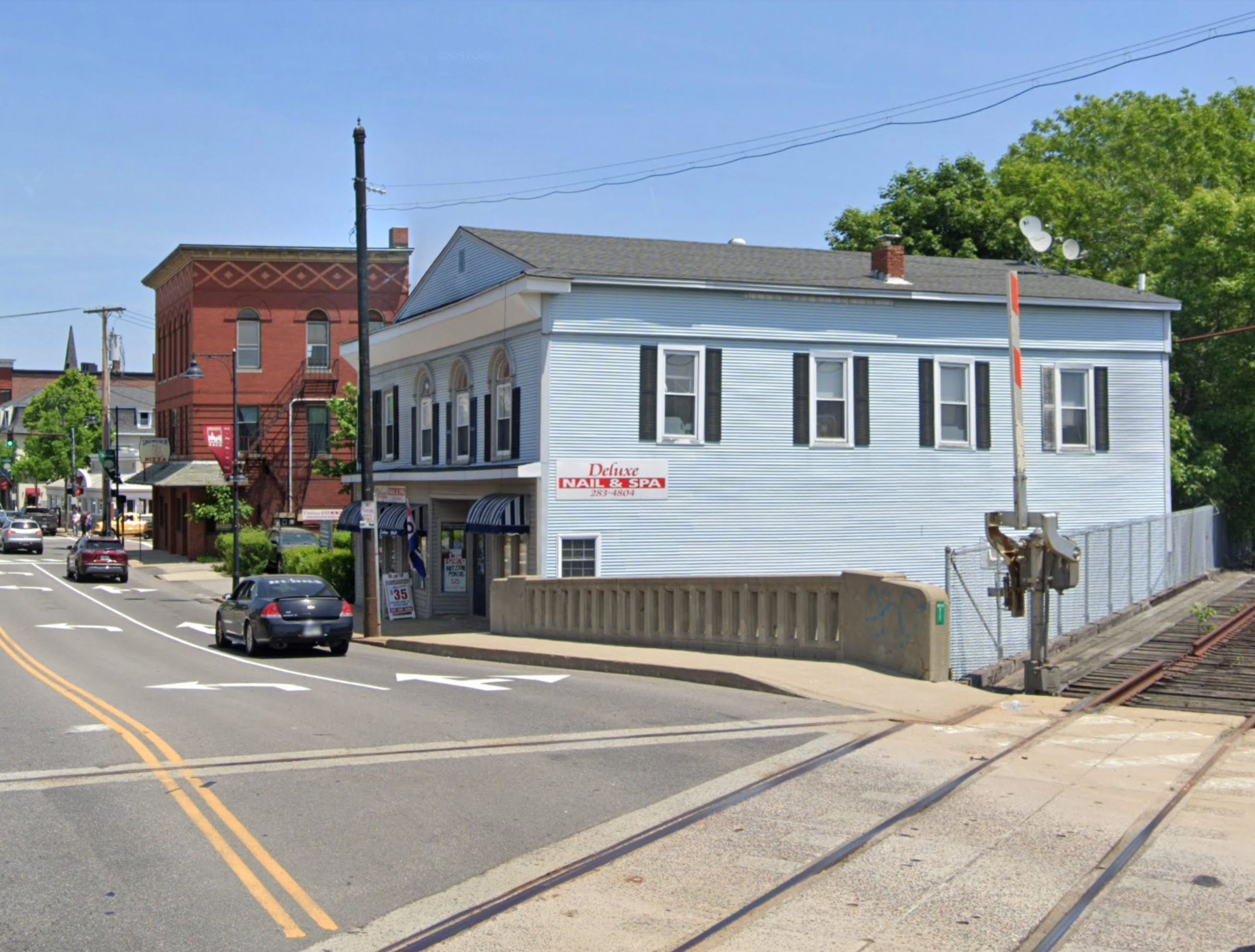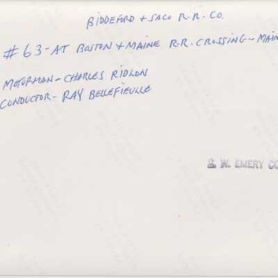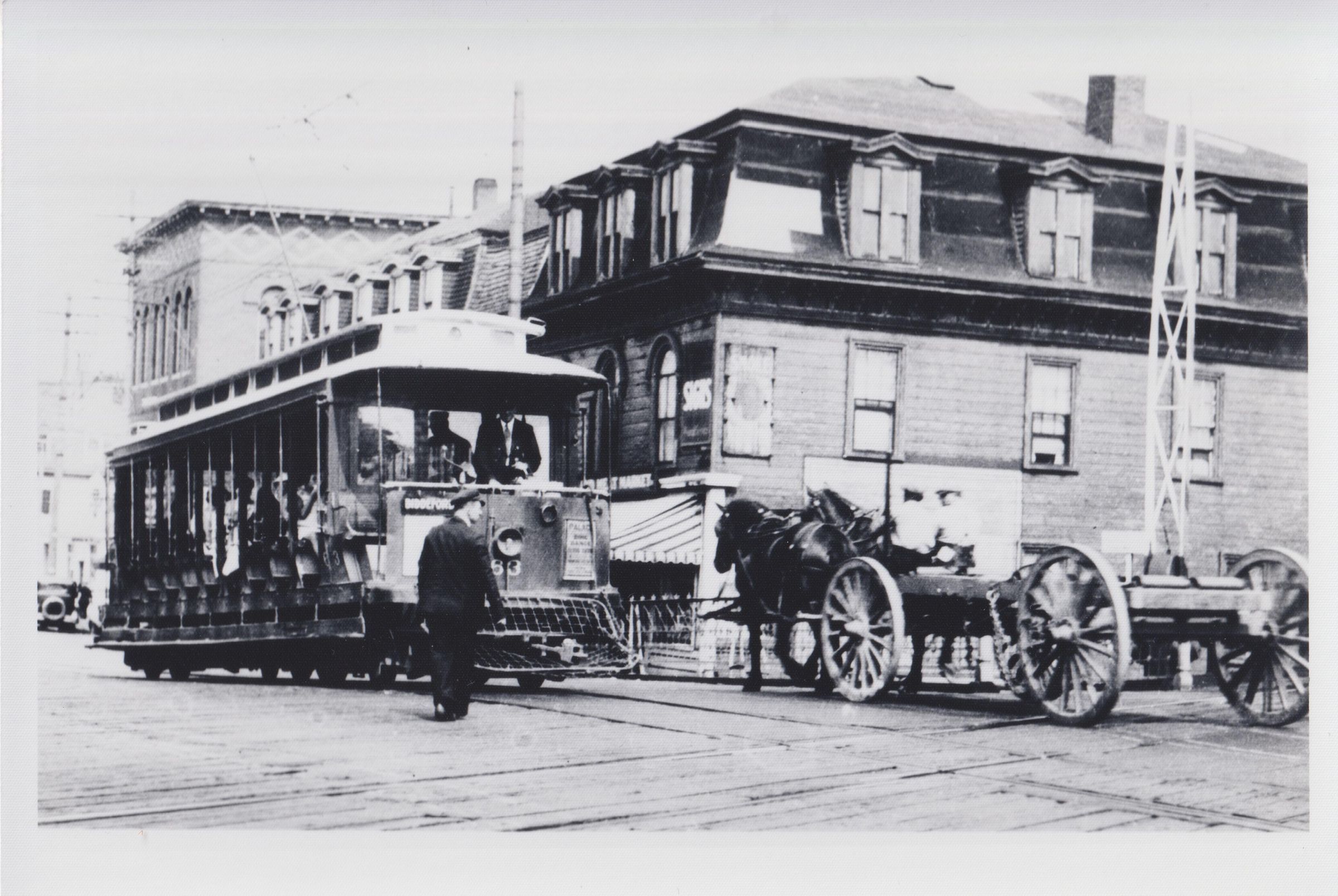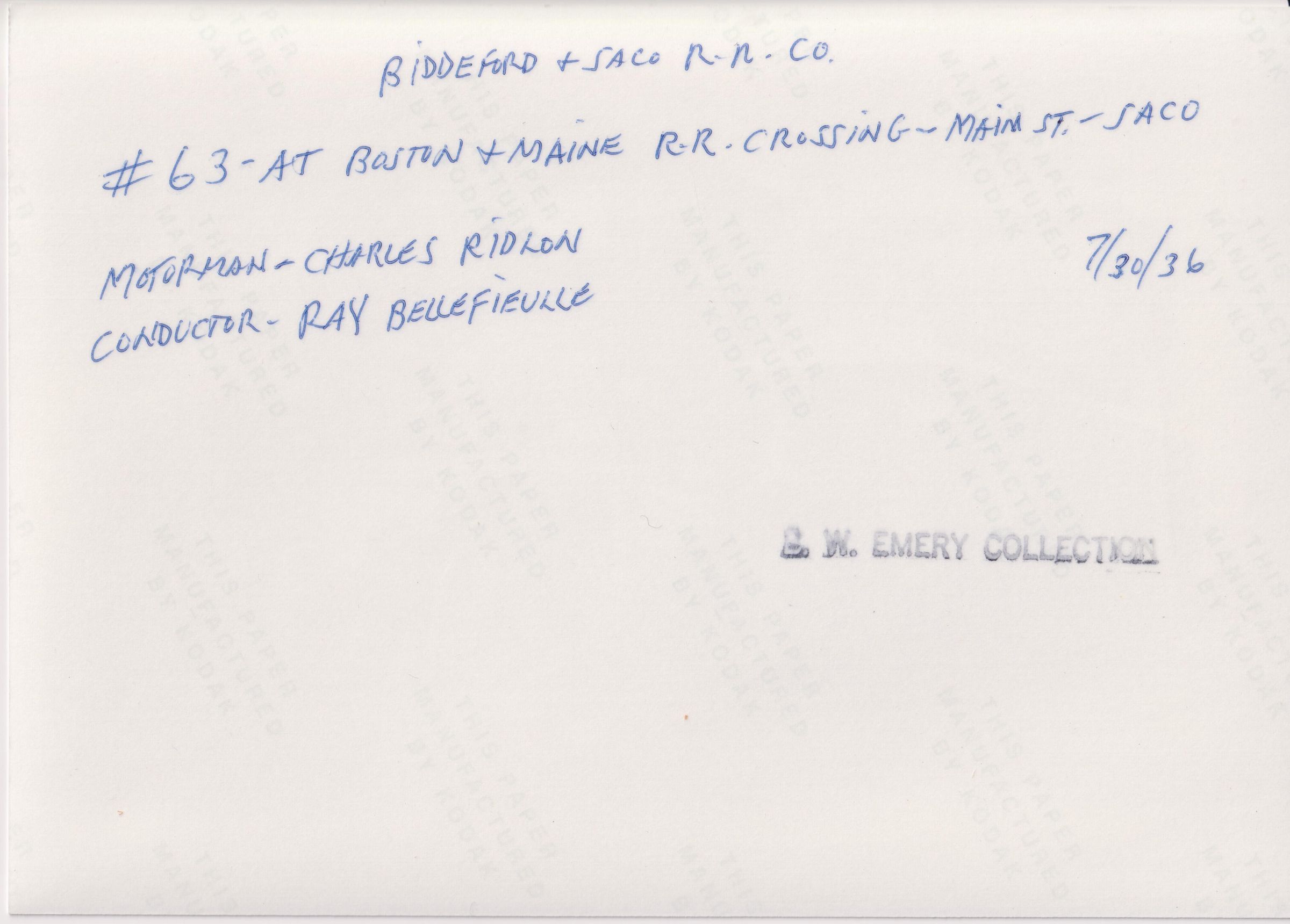 Photograph of a trolley and horse wagon crossing over the Bost & Maine Railroad tracks in Saco on July, 30, 1936. An automobile can be seen in the distance.