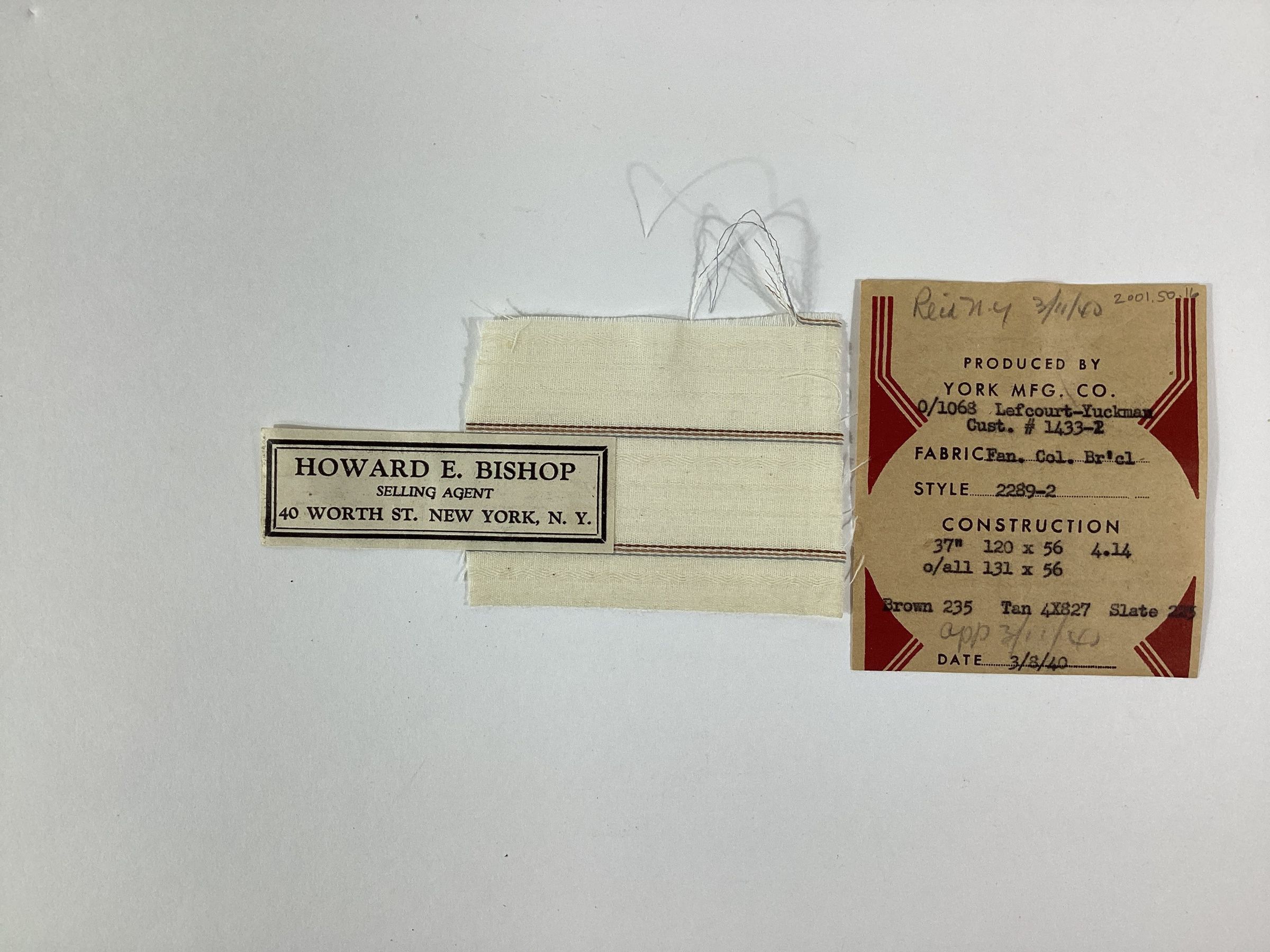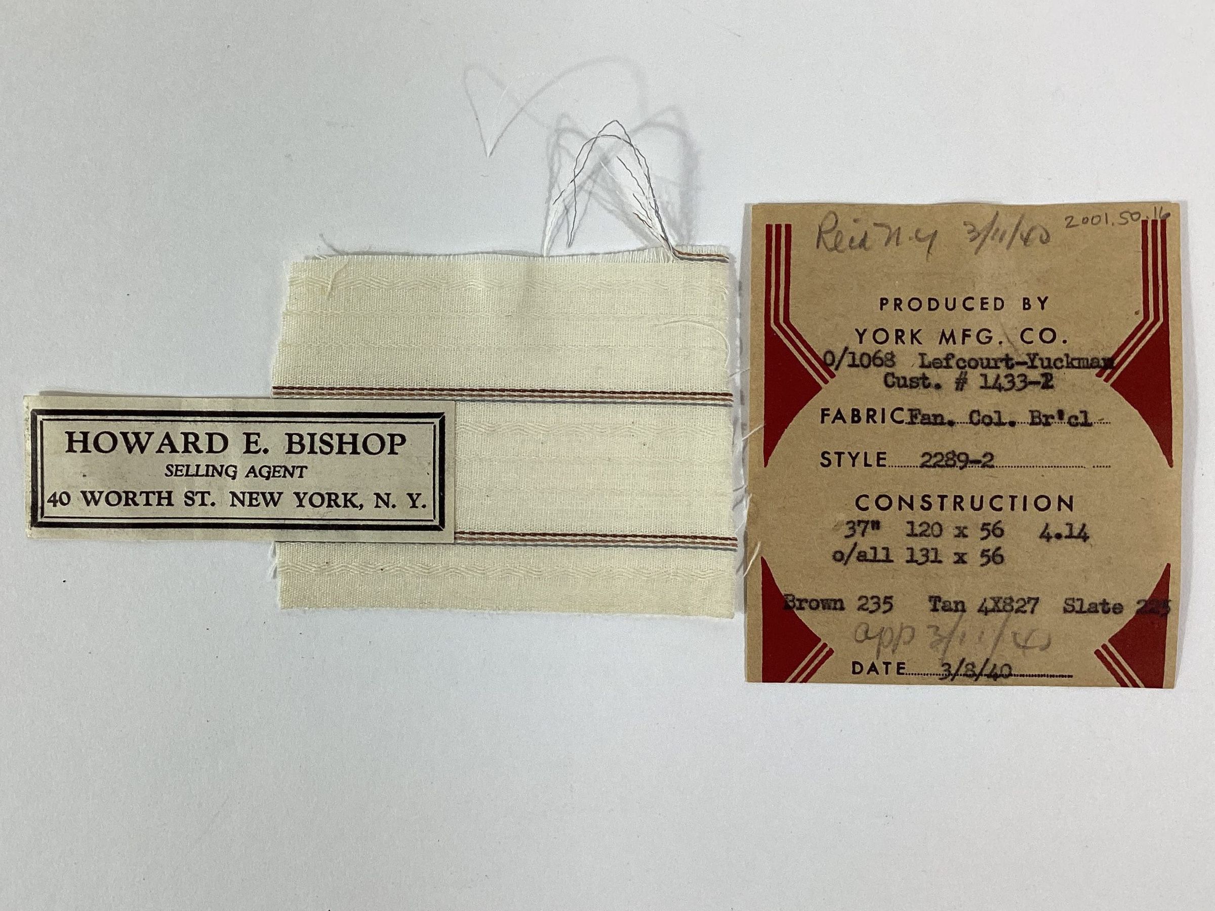 York Manufacturing Company fabric sample of fancy colored broadcloth in brown, tank and slate. The sample has a paper label which lists the customer number and name, style number, width and weight of the fabric, construction, reed size, type of warp and filling yarns, type of fabric, date, and name of the selling agent, Howard E. Bishop of 40 Worth Street, New York, NY.Materials