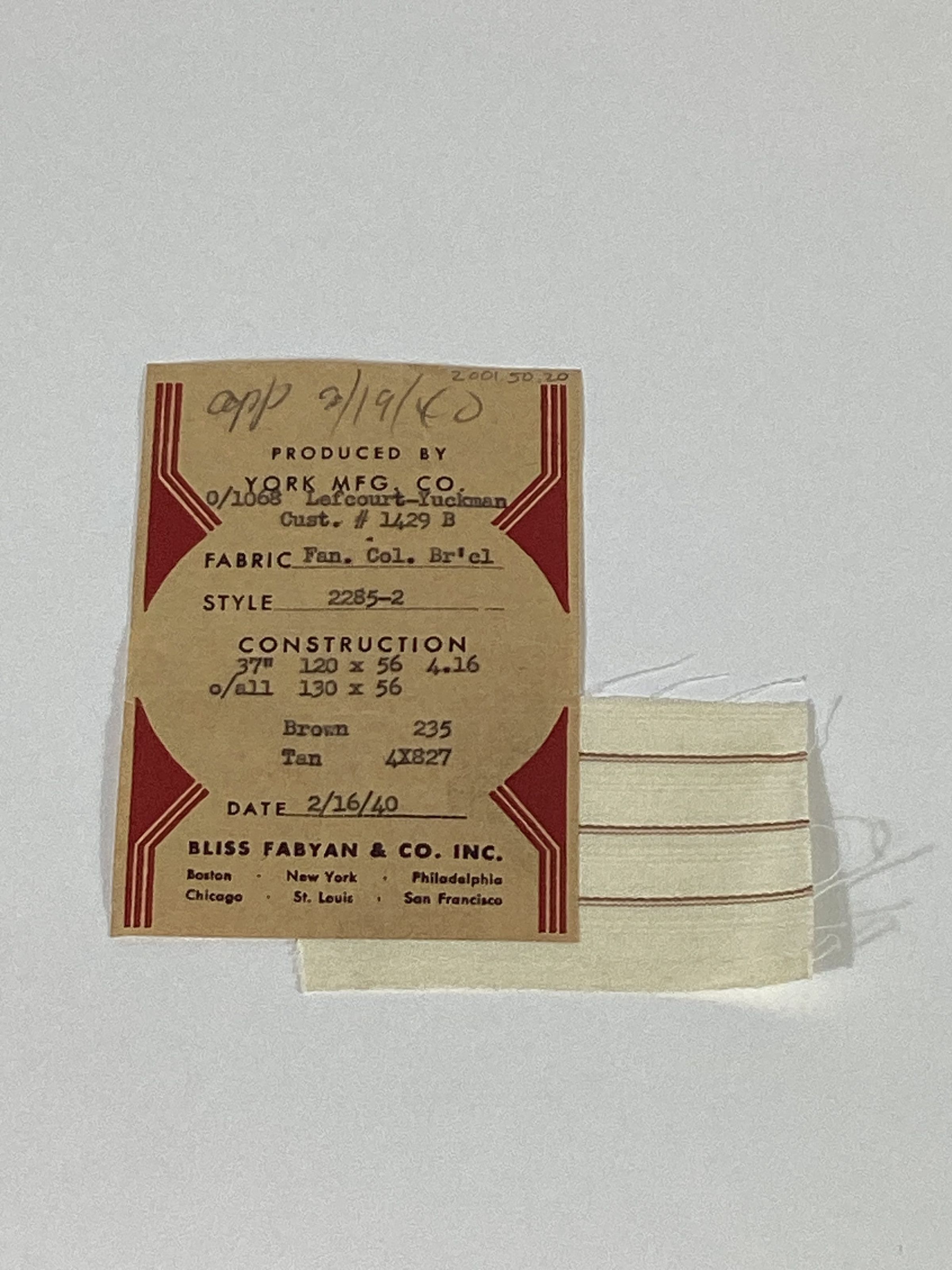 York Manufacturing Company fabric sample of fancy colored broadcloth in brown and tan. The sample has a paper label which lists the customer number and name, style number, width and weight of the fabric, construction, reed size, type of warp and filling yarns, type of fabric, date, and name of the selling agent, Howard E. Bishop of 40 Worth Street, New York, NY.Materials