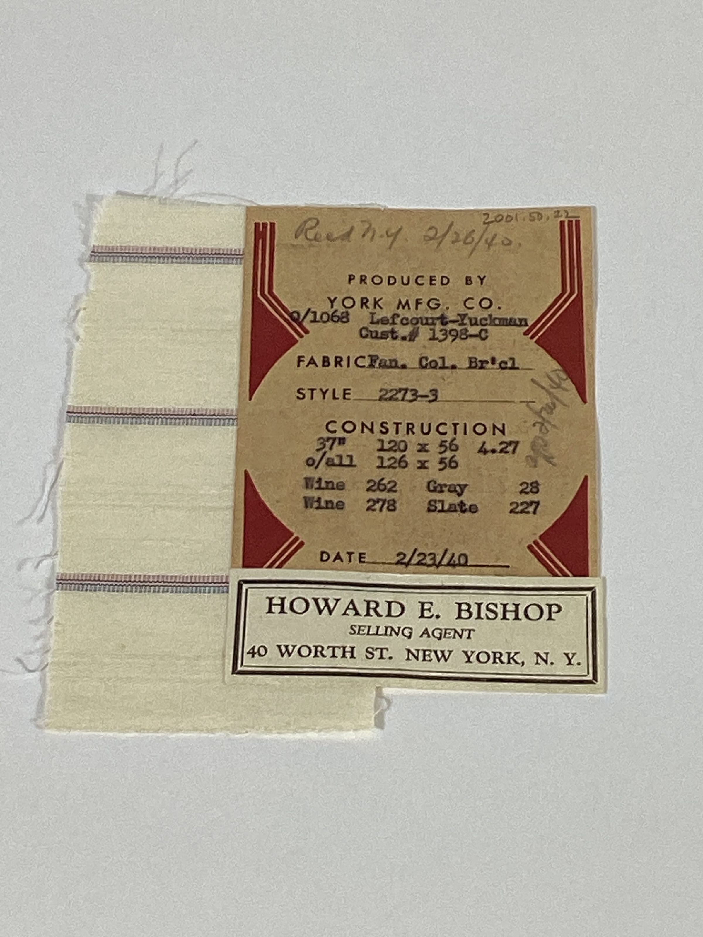 York Manufacturing Company fabric sample of fancy colored broadcloth in wine, gray, wine, and slate. The sample has a paper label which lists the customer number and name, style number, width and weight of the fabric, construction, reed size, type of warp and filling yarns, type of fabric, date, and name of the selling agent, Howard E. Bishop of 40 Worth Street, New York, NY.Materials