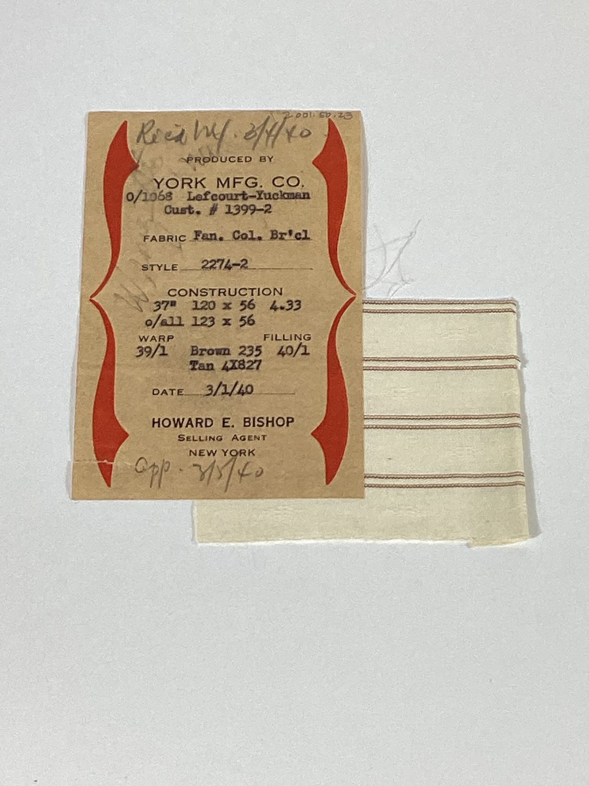 York Manufacturing Company fabric sample of fancy colored broadcloth in brown and tan. The sample has a paper label which lists the customer number and name, style number, width and weight of the fabric, construction, reed size, type of warp and filling yarns, type of fabric, date, and name of the selling agent, Howard E. Bishop of 40 Worth Street, New York, NY.Materials