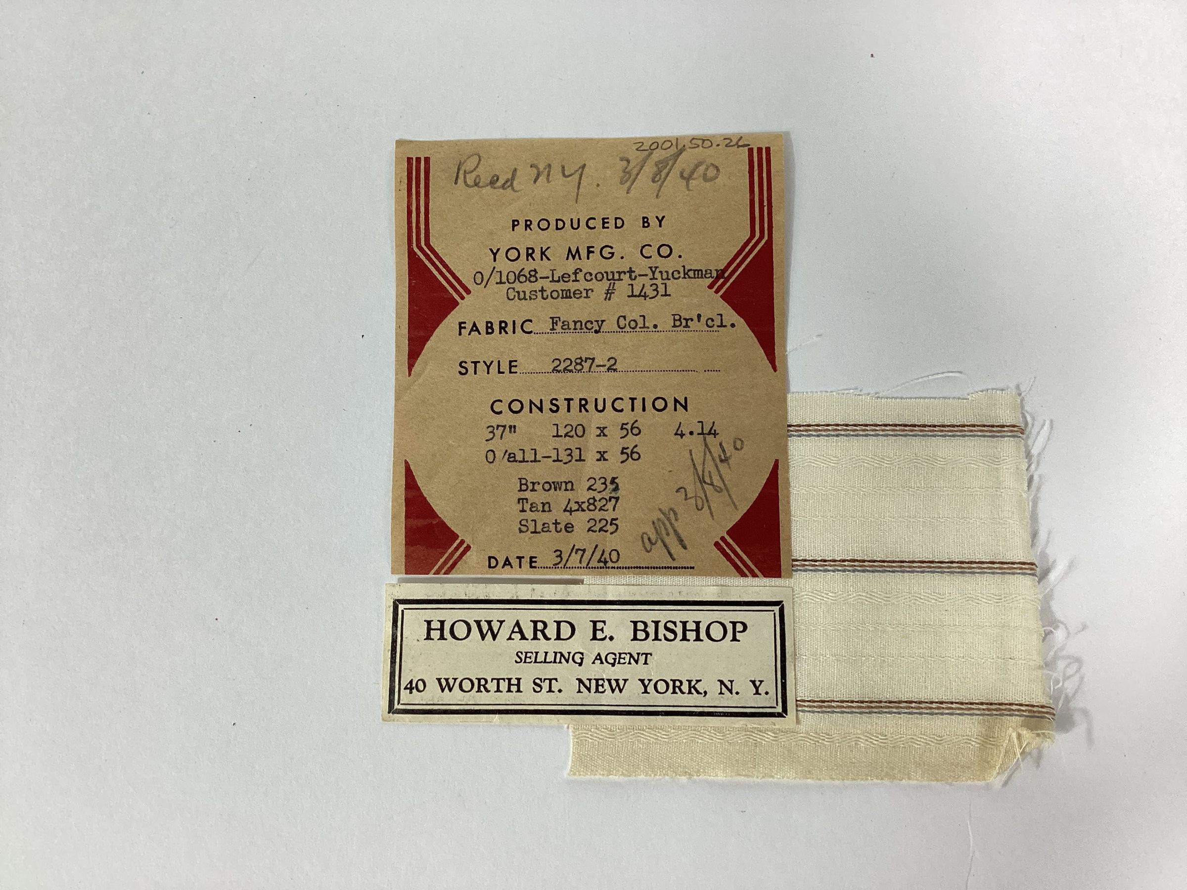 York Manufacturing Company fabric sample of fancy colored broadcloth in brown, tan, and slate. The sample has a paper label which lists the customer number and name, style number, width and weight of the fabric, construction, reed size, type of warp and filling yarns, type of fabric, date, and name of the selling agent, Howard E. Bishop of 40 Worth Street, New York, NY.Materials