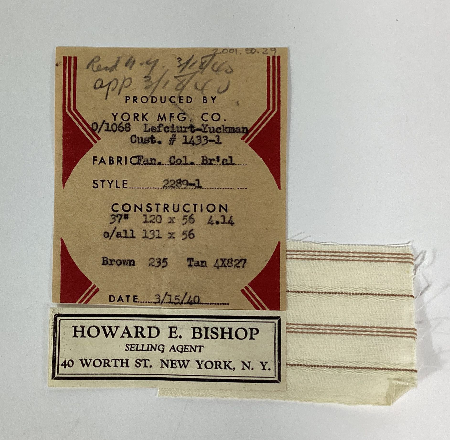 York Manufacturing Company fabric sample of fancy colored broadcloth in brown and tan. The sample has a paper label which lists the customer number and name, style number, width and weight of the fabric, construction, reed size, type of warp and filling yarns, type of fabric, date, and name of the selling agent, Howard E. Bishop of 40 Worth Street, New York, NY.Materials
