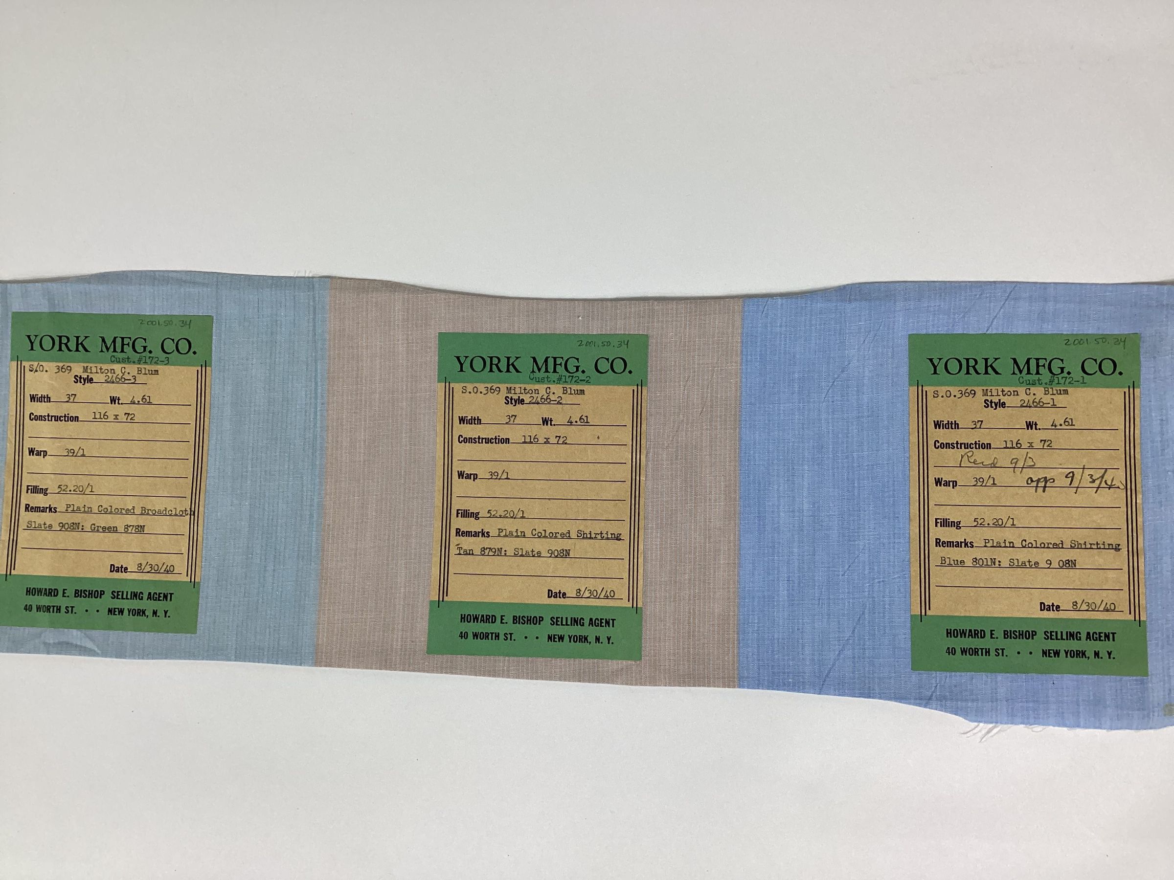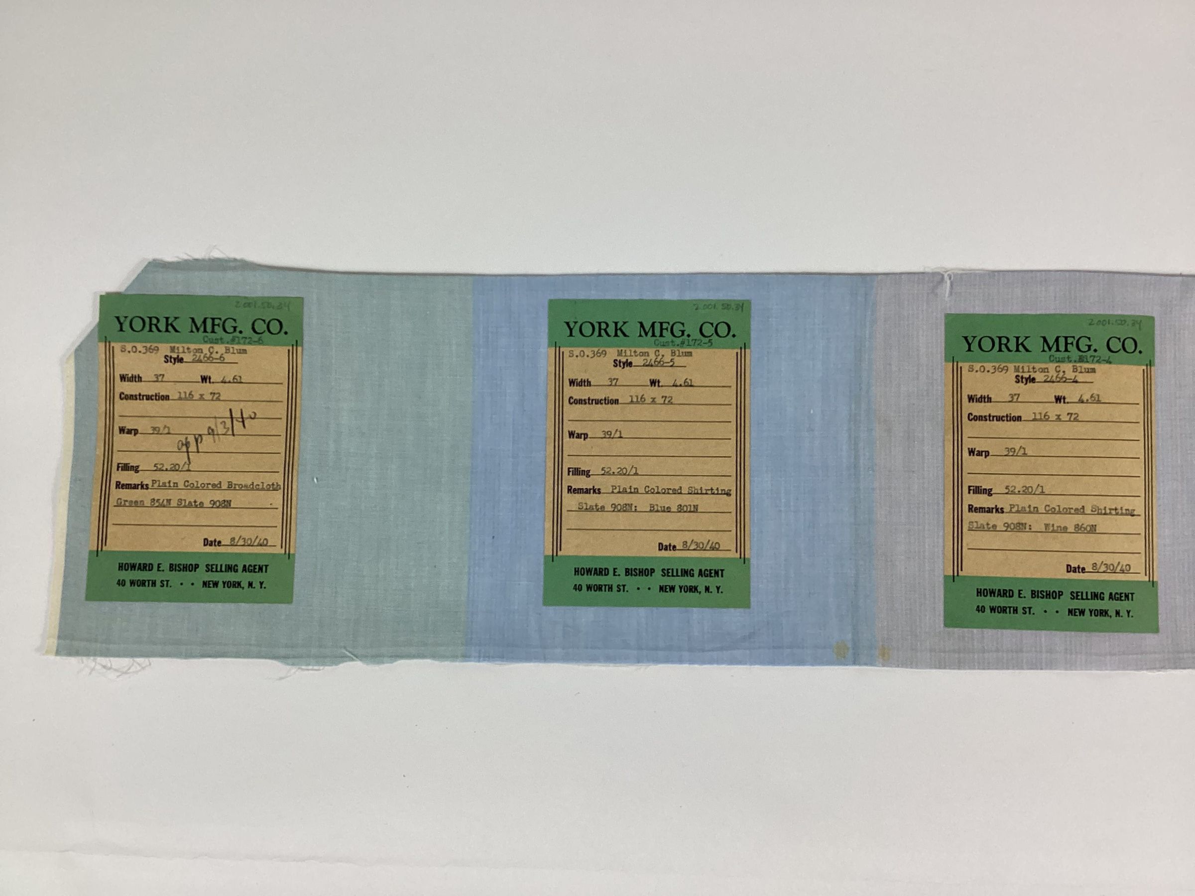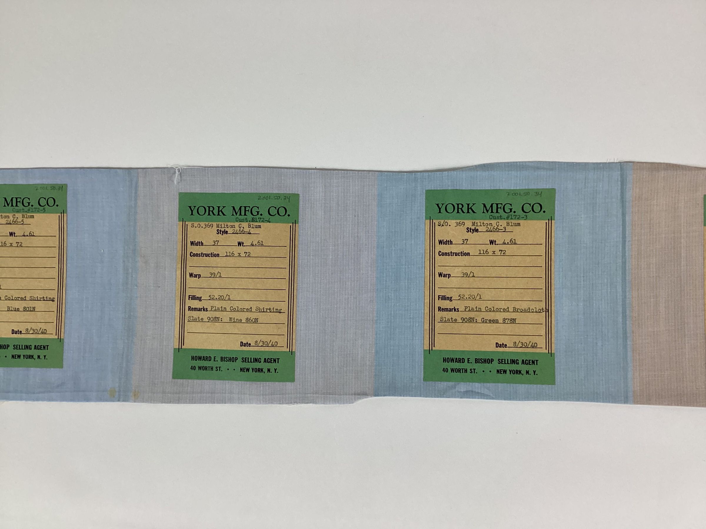 York Manufacturing Company fabric sample of fancy colored shirting in a range of colors. Each colorway has a paper label which lists the customer number and name, style number, width and weight of the fabric, construction, reed size, type of warp and filling yarns, type of fabric, date, and name of the selling agent, Howard E. Bishop of 40 Worth Street, New York, NY.Materials