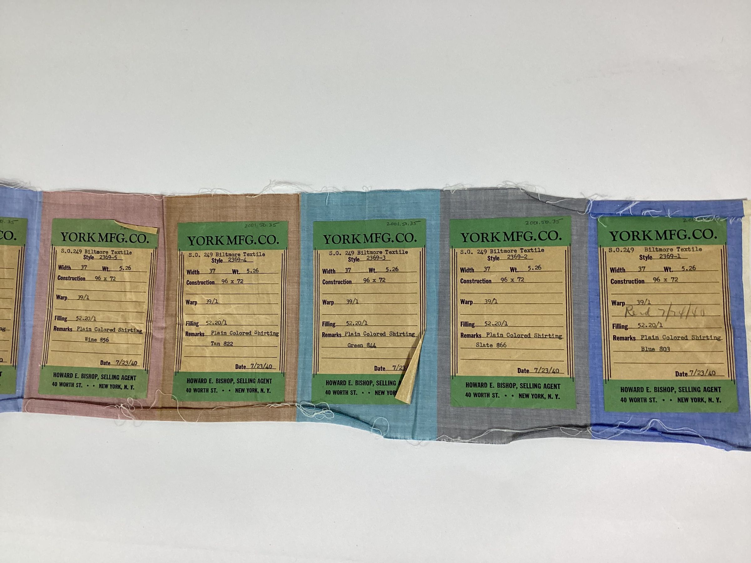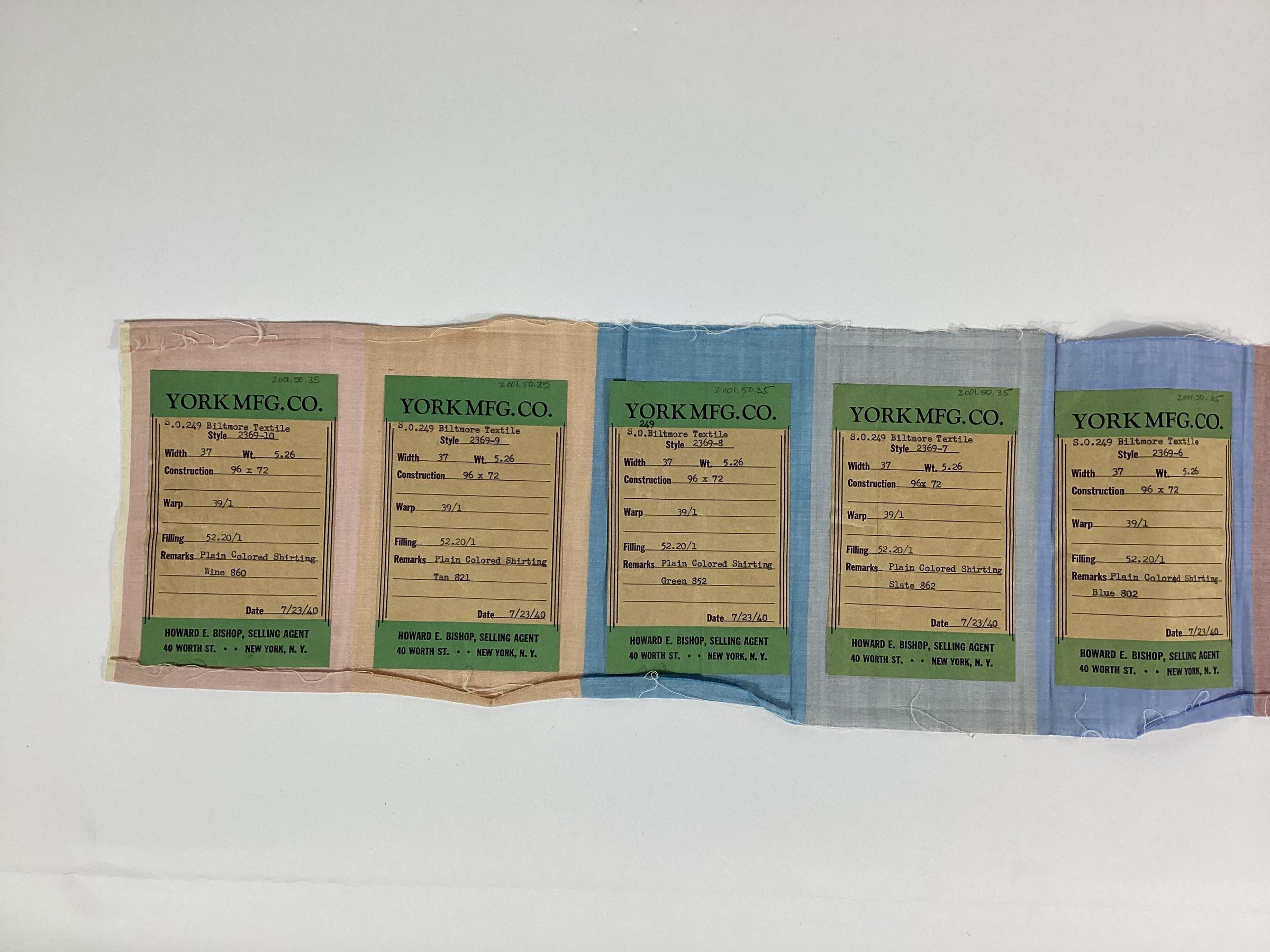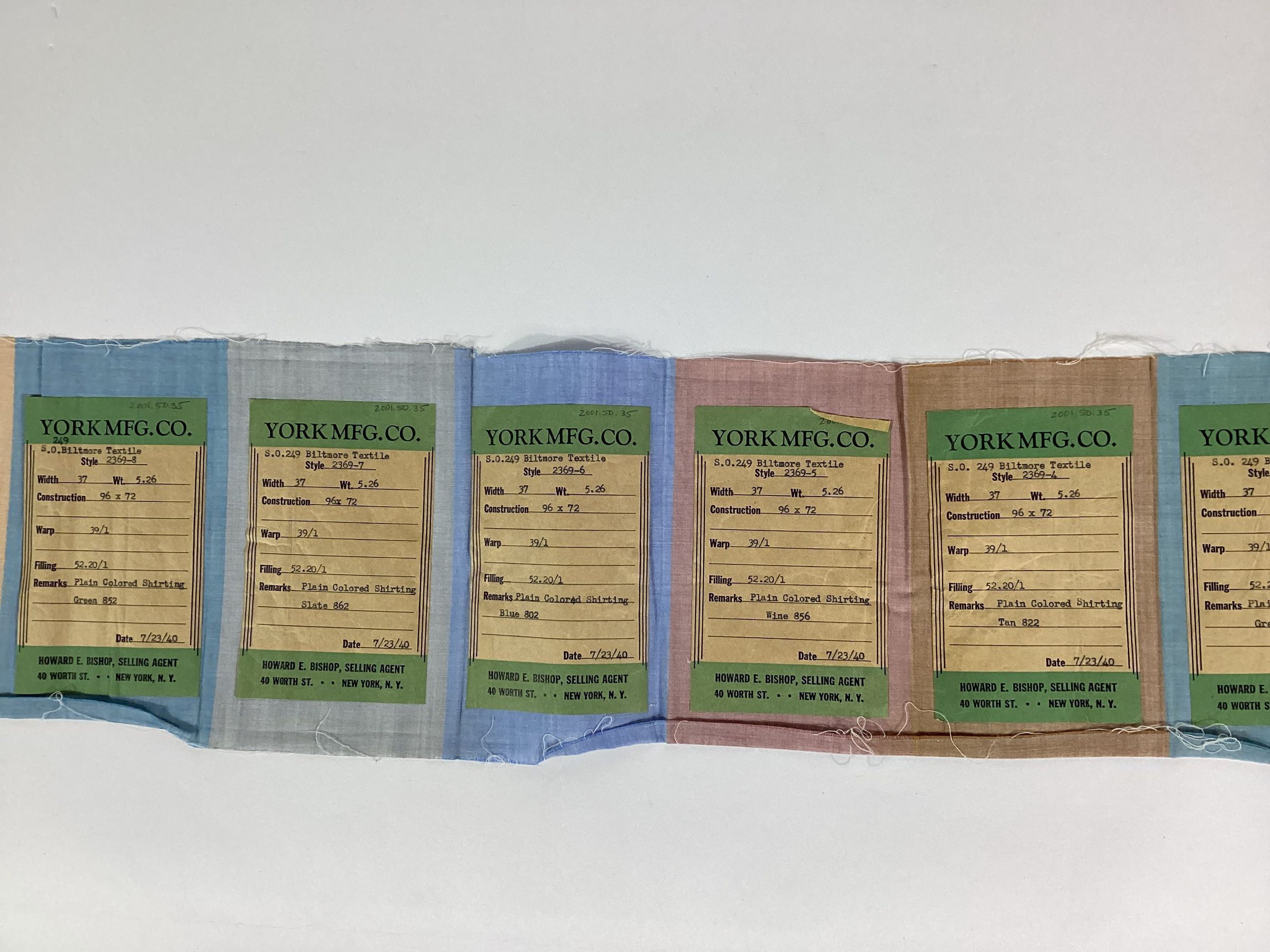 York Manufacturing Company fabric sample of fancy colored shirting in a range of colors. Each colorway sample has a paper label which lists the customer number and name, style number, width and weight of the fabric, construction, reed size, type of warp and filling yarns, type of fabric, date, and name of the selling agent, Howard E. Bishop of 40 Worth Street, New York, NY.Materials