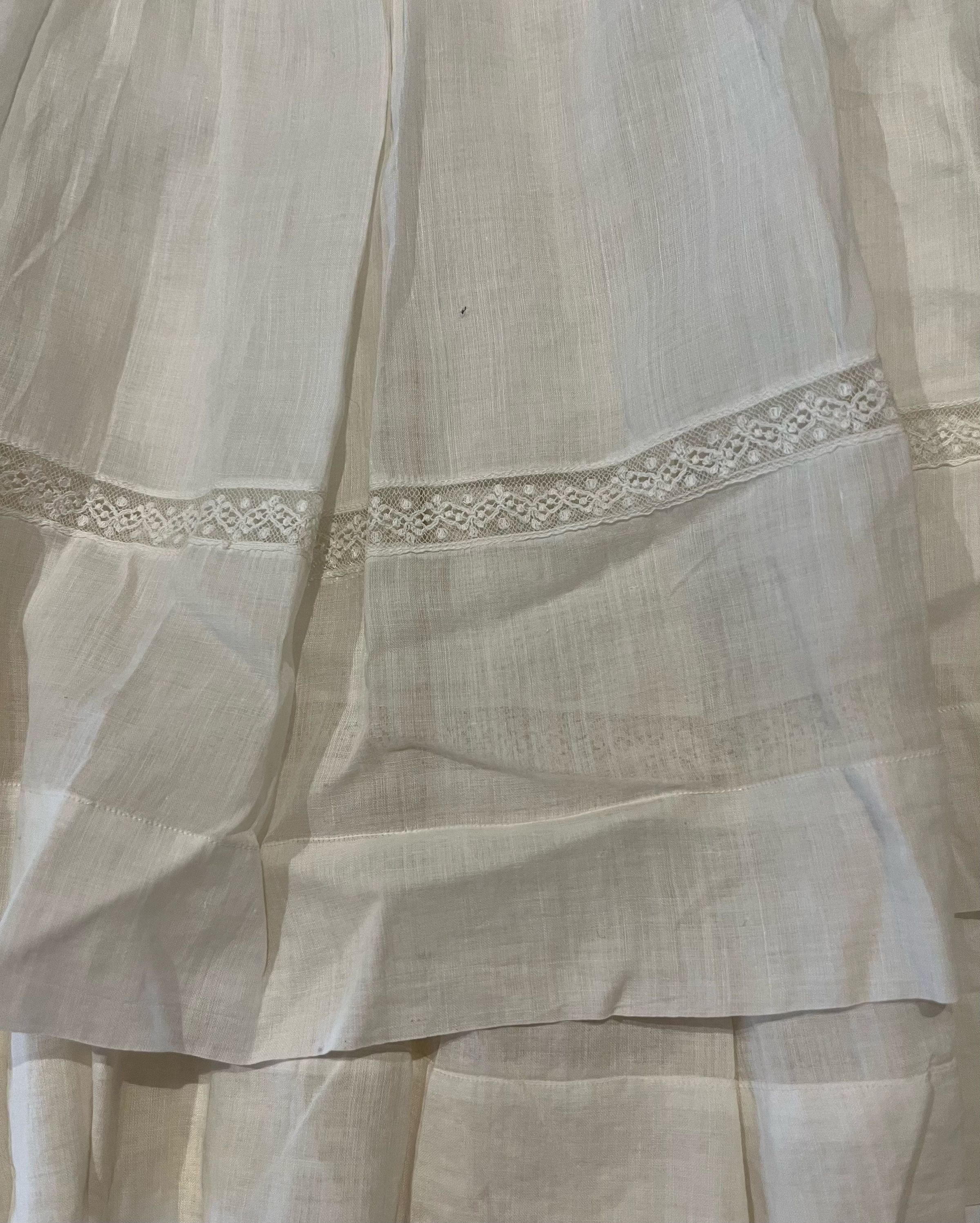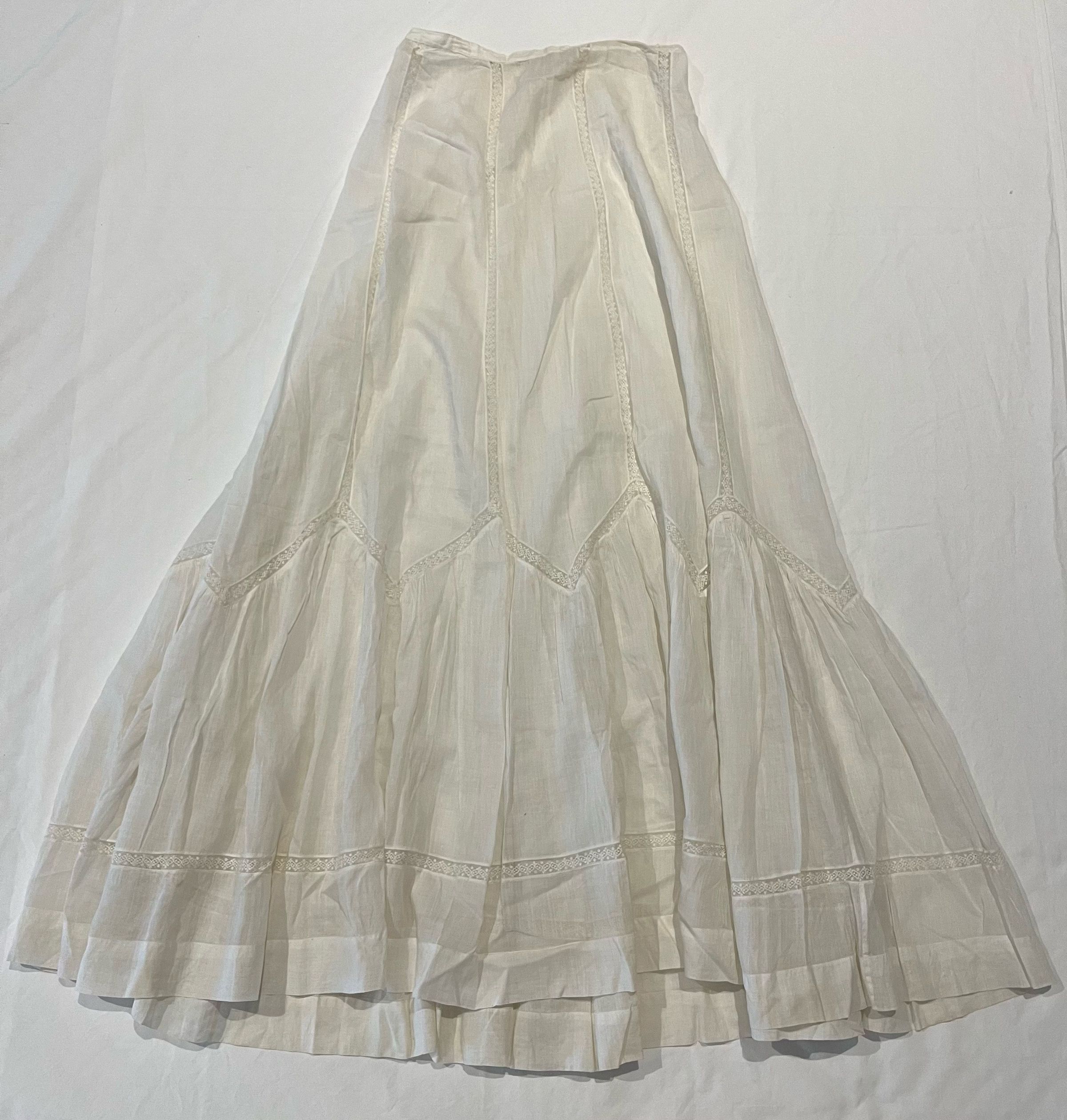 Fine white cotton petticoat with vertical lace inserts attaching to horizontal zig-zags. A flounce attaches to the zig-zag lace pattern. The flounce has a horizontal band of the same lace above the hem. Applied waistband closes in the back with two hooks and eyes and three snaps.Dimensions
