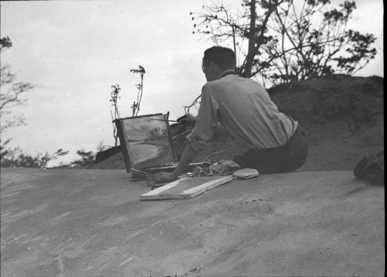 Glass lantern slide of an unidentified man painting a landscape. "The Artist" is written on the "Essex Camera Club, Newark, NJ" label. This photo appears in the book, "Images of America: Saco Revisited" (2009) by Dyer Library and Saco Museum (pg. 32) and describes the artist as painting the "Saco River," however like all of Moody's photos with the Essex Camera label, this was likely taken in the Newark, NJ area.