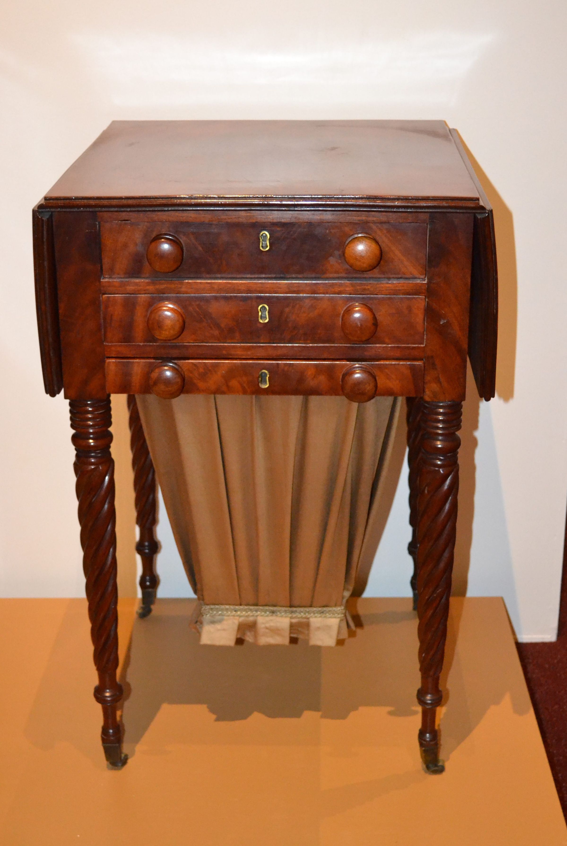 In his 1803 Cabinet Dictionary, Sheraton described what he called a "pouch" table as a "Table with a Bag, used by the Ladies to work at, in which bag they deposit their fancy needlework." That term was rarely used in America, however, and such tables were known here as “work tables.” A work table's storage capacity was at least as important as the size of its working surface. Such tables often included a writing drawer, occasionally a chessboard or looking glass, and often a bag for storing needlework. Since work tables were emblems of their owner's accomplishments, much like embroidered samplers, they were often placed in parlors and sitting rooms where visitors and suitors could see and admire them. Moses Mellen probably made this table early in his career. He operated a furniture warehouse in Boston from 1821 until his retirement in 1853. Boston city directories record his warehouse 2 Dock Square in 1821 and on Brattle Street from 1822 to 1825. By 1825, he had moved to Union Street, where he worked in partnership with Charles Hopkins from 1837 to 1846.