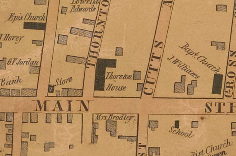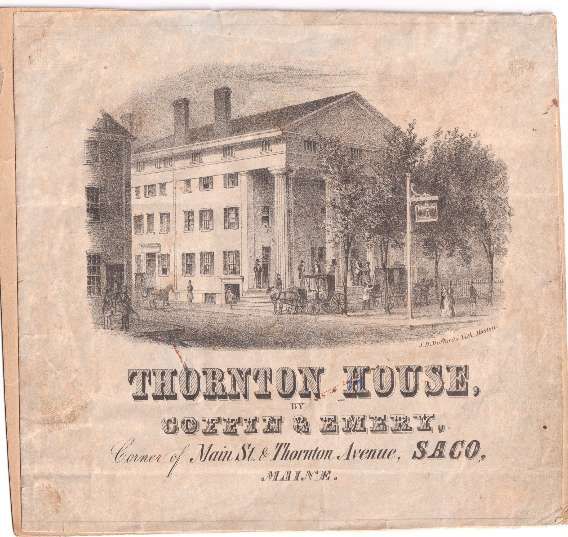 A lithograph print of "Thornton House by Coffin & Emery, Corner of Main St. & Thornton Avenue, Saco, Maine" On the back is written, "Thornton House. Built in 1810. Destroyed by Fire in 1851." According to John Haley, the house was originally built for Foxwell Cutts in 1810, but he had to sell it when he was financially ruined during the War of 1812. It was sold to his brother-in-law, Dr. Thomas G. Thornton, US Marshall. When Dr. Thornton died in 1824, the house passed to his widowed wife, Sarah Cutts Thornton (Foxwell's sister), until she died in 1845. The house was transformed into a hotel. Haley dates the fire to 1850, but the property appears in the 1851 map, "Map of the Villages of Saco and Biddeford York County, Maine from Original Surveys" by O. Harkness and Henry Francis Walling.