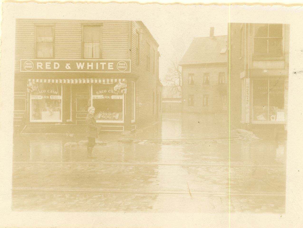 Black and white print photograph of Main Street in Saco, Maine from Saco River flooding. From the Sawyer House Collection.