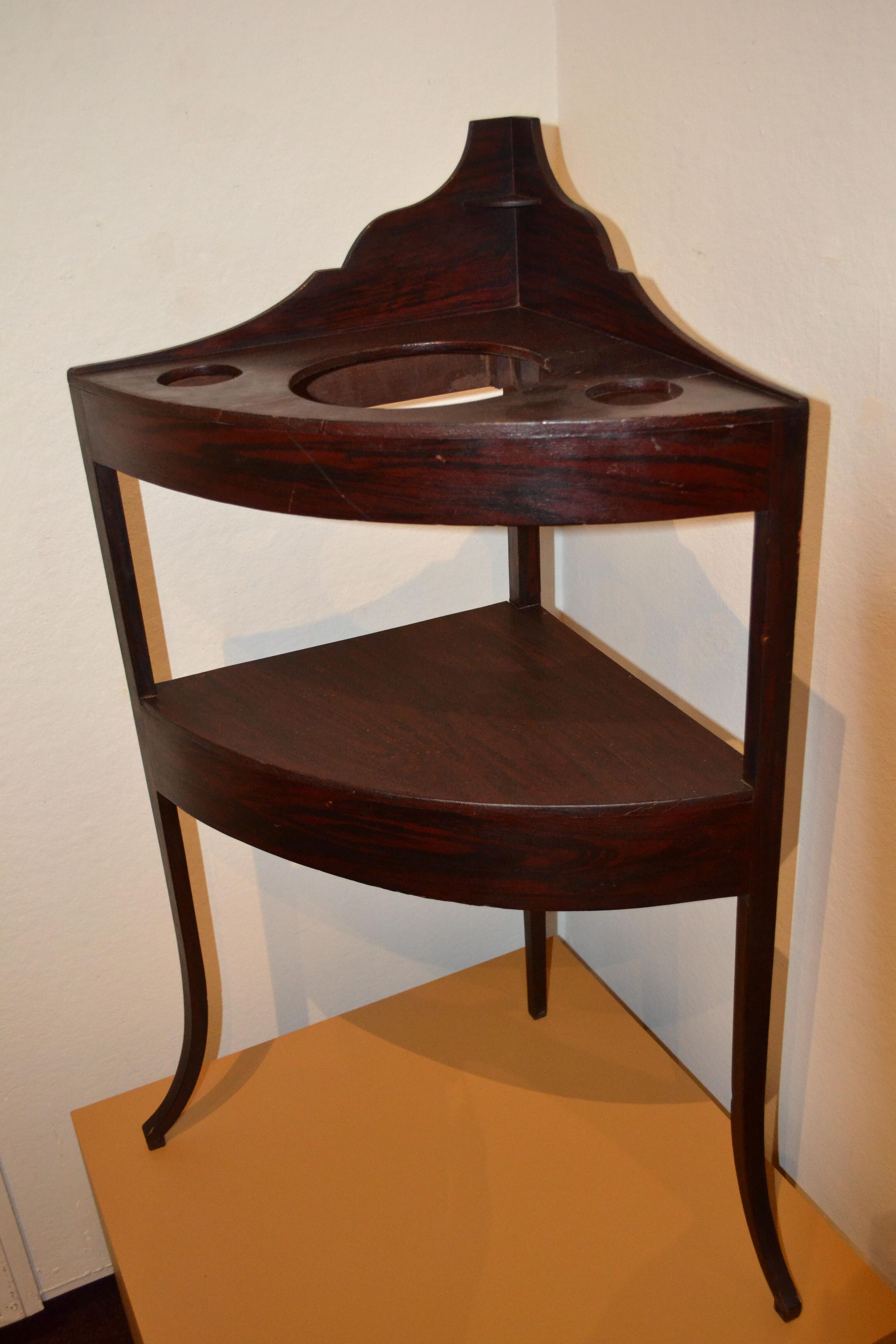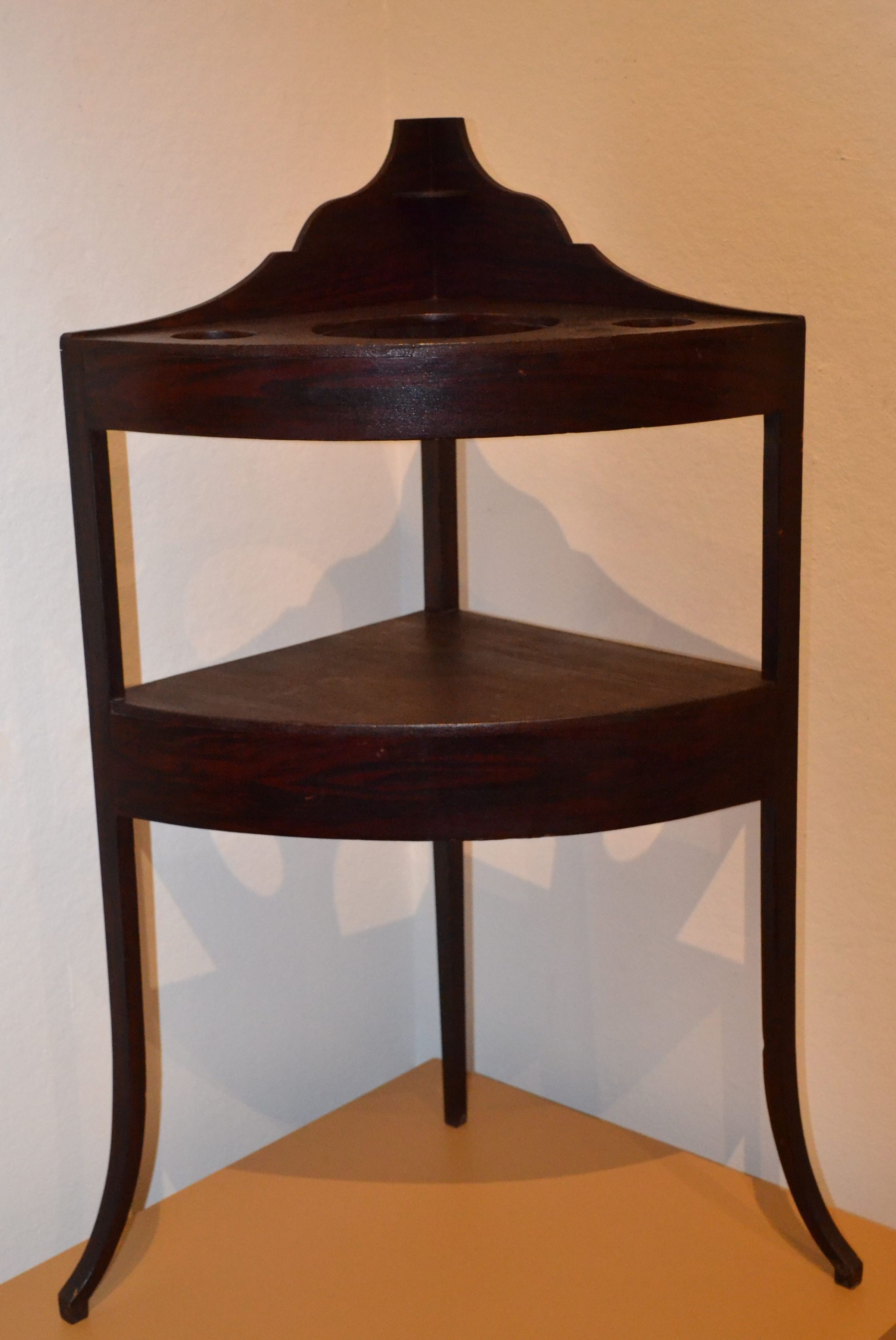 George Hepplewhite commented in his Cabinet Maker and Upholsterer's Guide (1794) that the corner stand was "a very useful shape, as it stands in a corner out of the way." In his 1803 Cabinet Dictionary, Thomas Sheraton further advised that the front legs of corner basin stands such as this should "spring forward, to keep … [the stand] from tumbling over." The use of pine that has been grain painted makes this basin stand a more affordable alternative to one of expensive imported mahogany. The top has a large opening for a washbasin and two smaller ones for tumblers; the small shelf above would have held a candlestick.