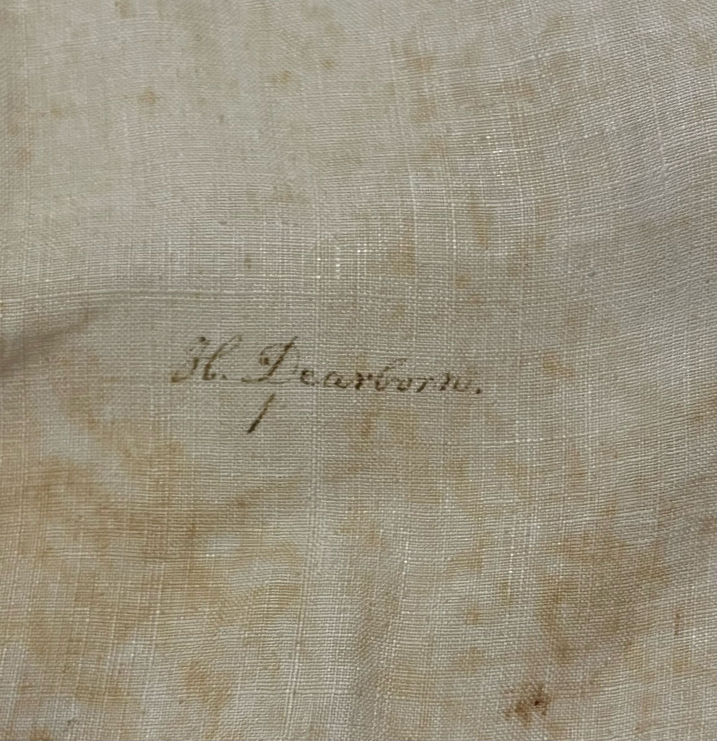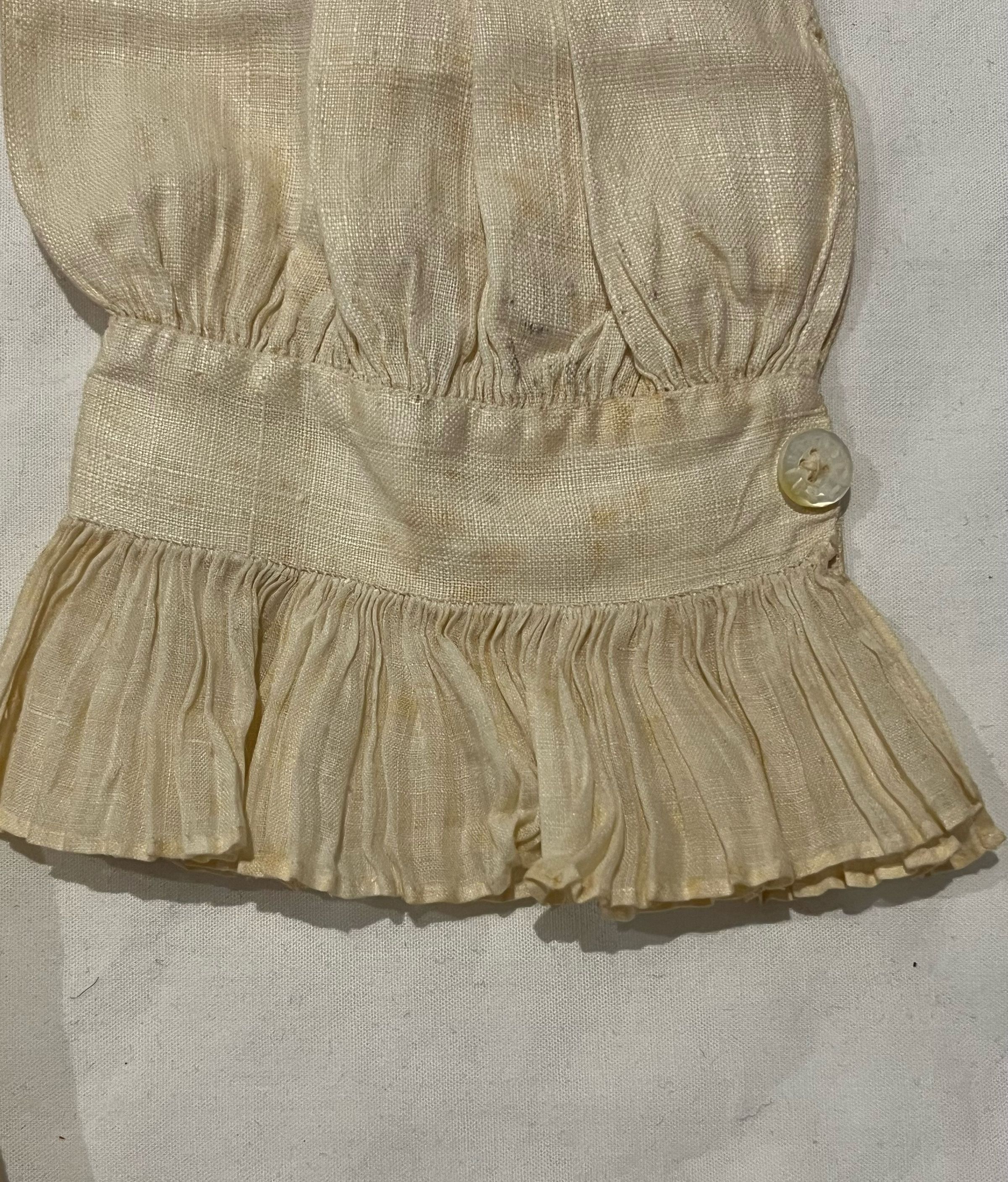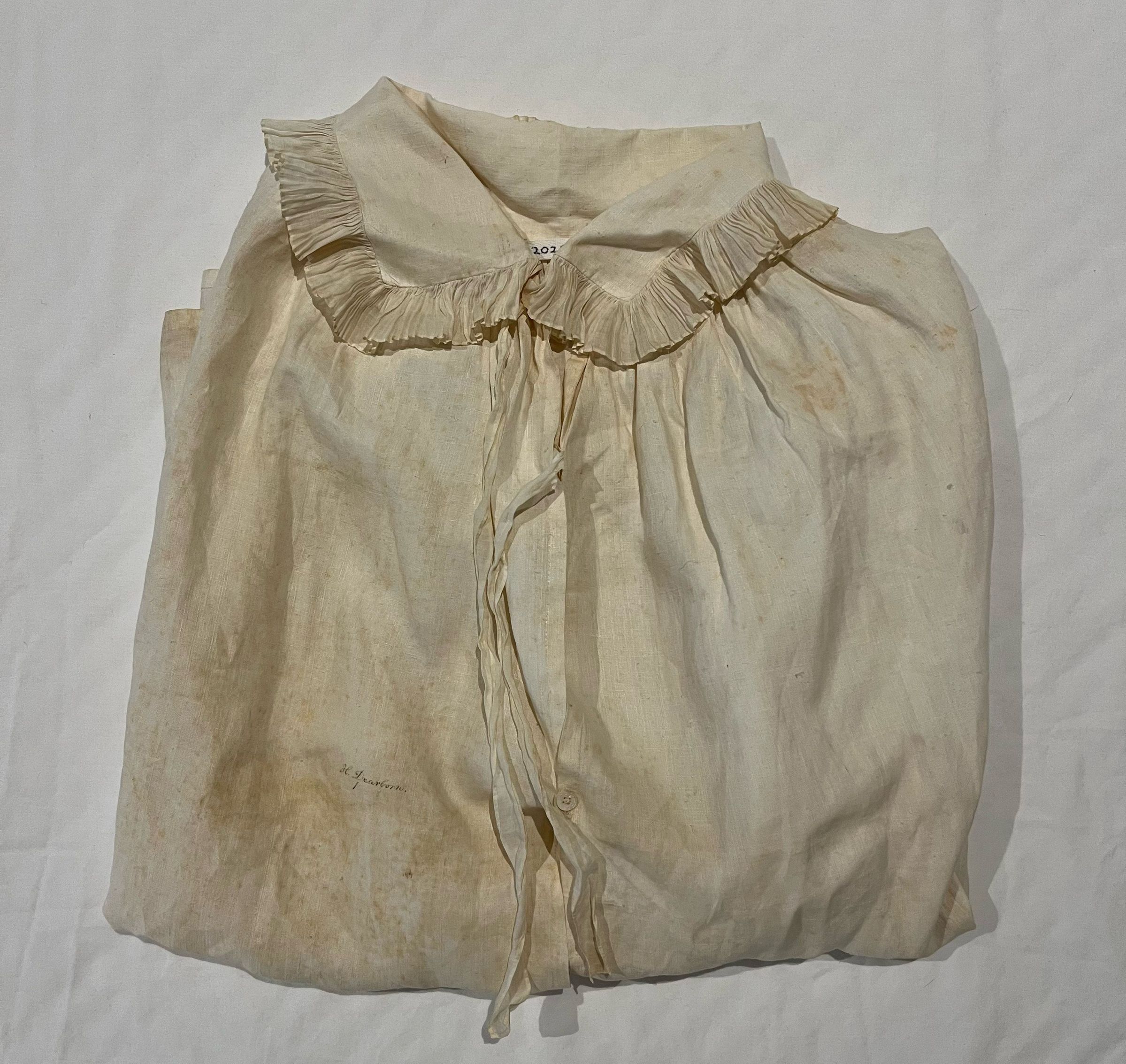 Linen shirt with a wide ruffled falling collar. Open at the front. Closes at the collar with a narrow tie of fine cotton muslin; midway down the front is a small button and buttonhole. The collar ruffle is of fine muslin as are the ruffles on the sleeve cuffs. The sleeves are gathered at the should and into the narrow 1" cuffs; they retain their ironed in pleats. There are gussets on the shoulder seams where the collar attaches and a gusset under each armhole. There are no reinforcing patches at the shoulder or along the sleeve opening. The hem along the front of the shirt and the bottom hem are rather large for the period--3/8". The side seams are very narrow and felled.Dimensions