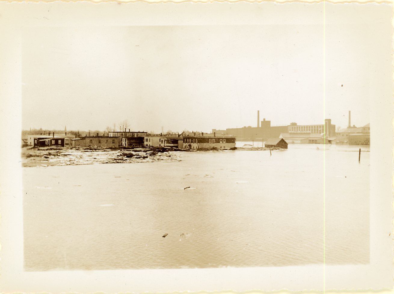Black and white print photograph of Saco River flooding, Saco-Lowell Shop in background. From the Sawyer House Collection.