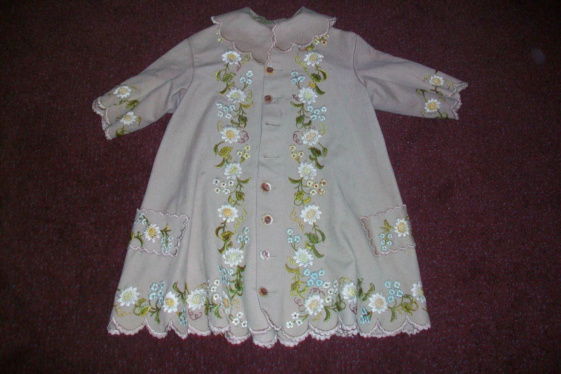 Child's handmade coat of beige wool, hand-embroidered with yellow and white daisies and green leaves. The hems of the collar, sleeves, and bottom are scalloped with embroidered edges, as are the edges of the two patch pockets on the front. Closes with nine buttons down the front.Dimensions