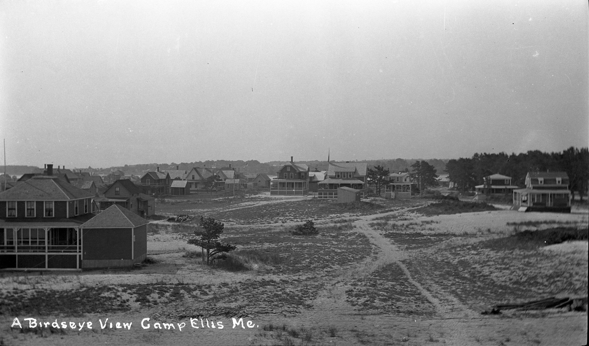 Negative print photo of a bird's eye view of Camp Ellis, ME.