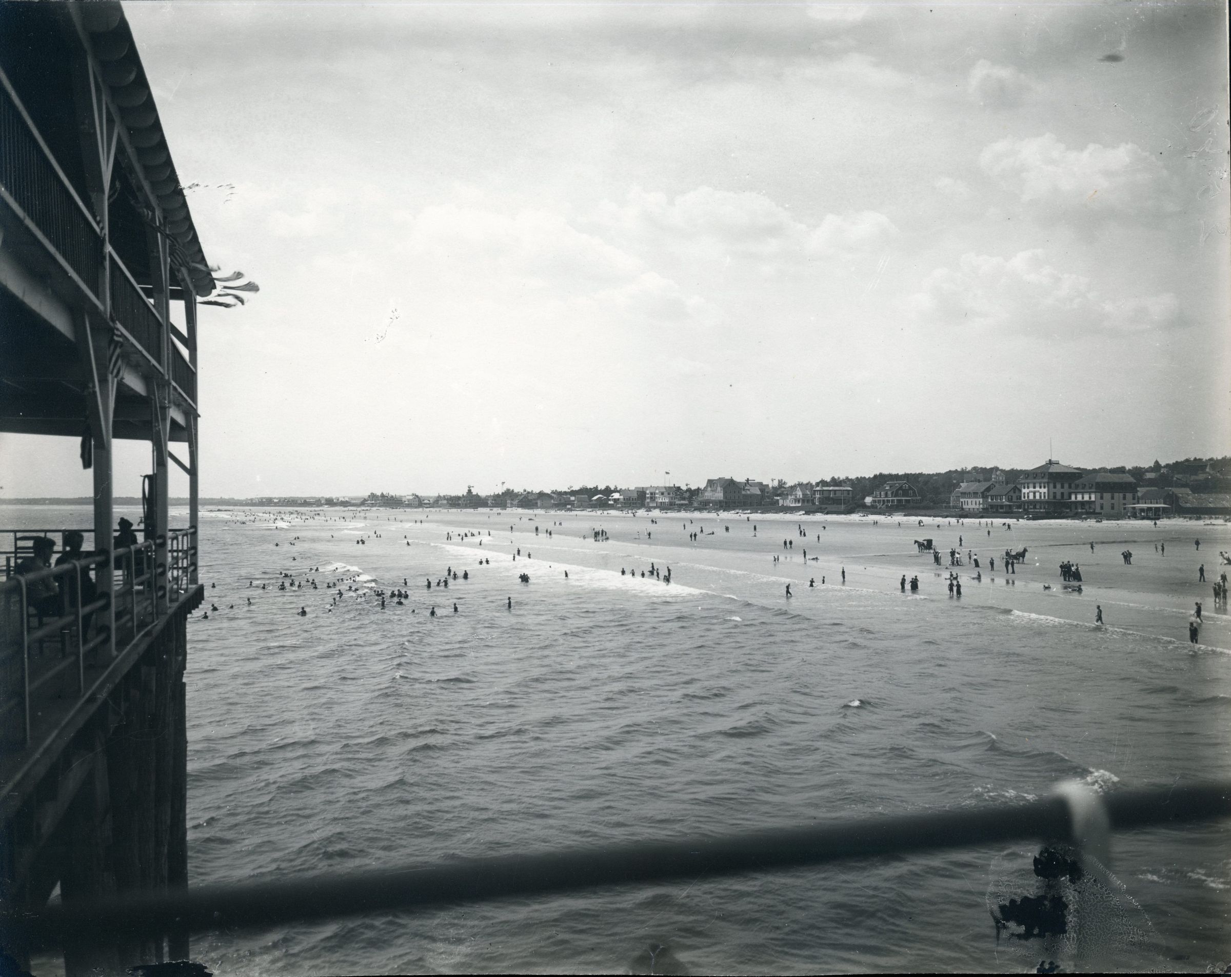 Print photograph (from a glass plate negative) of the south side of the Old Orchard Pier in Old Orchard Beach, taken from the end of the Pier.
