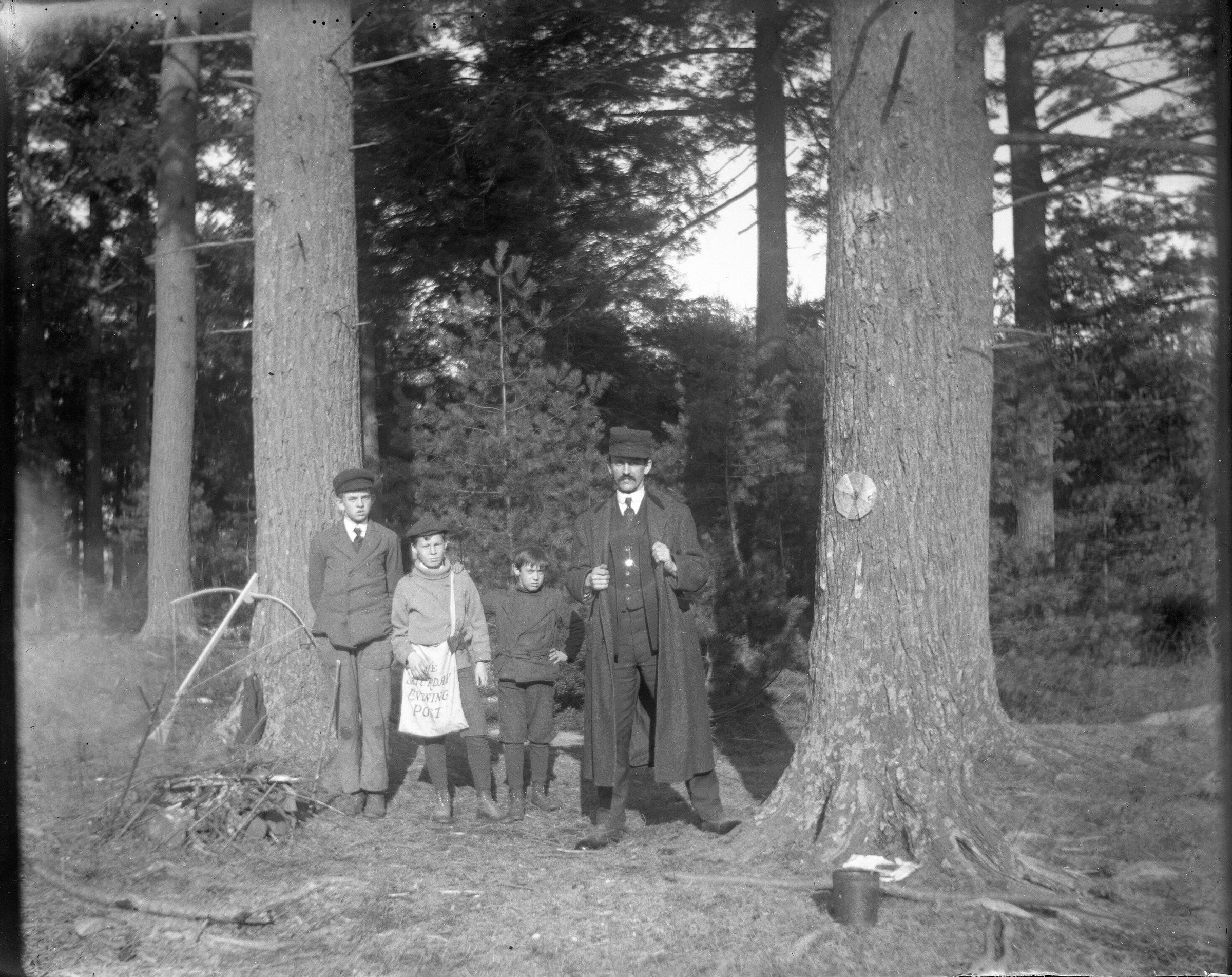 Glass plate negative photo of Rufus Milton Hobbs (1877-1940) with three unidentified boys. One of the boys is carrying a delivery bag for the Saturday Evening Post.