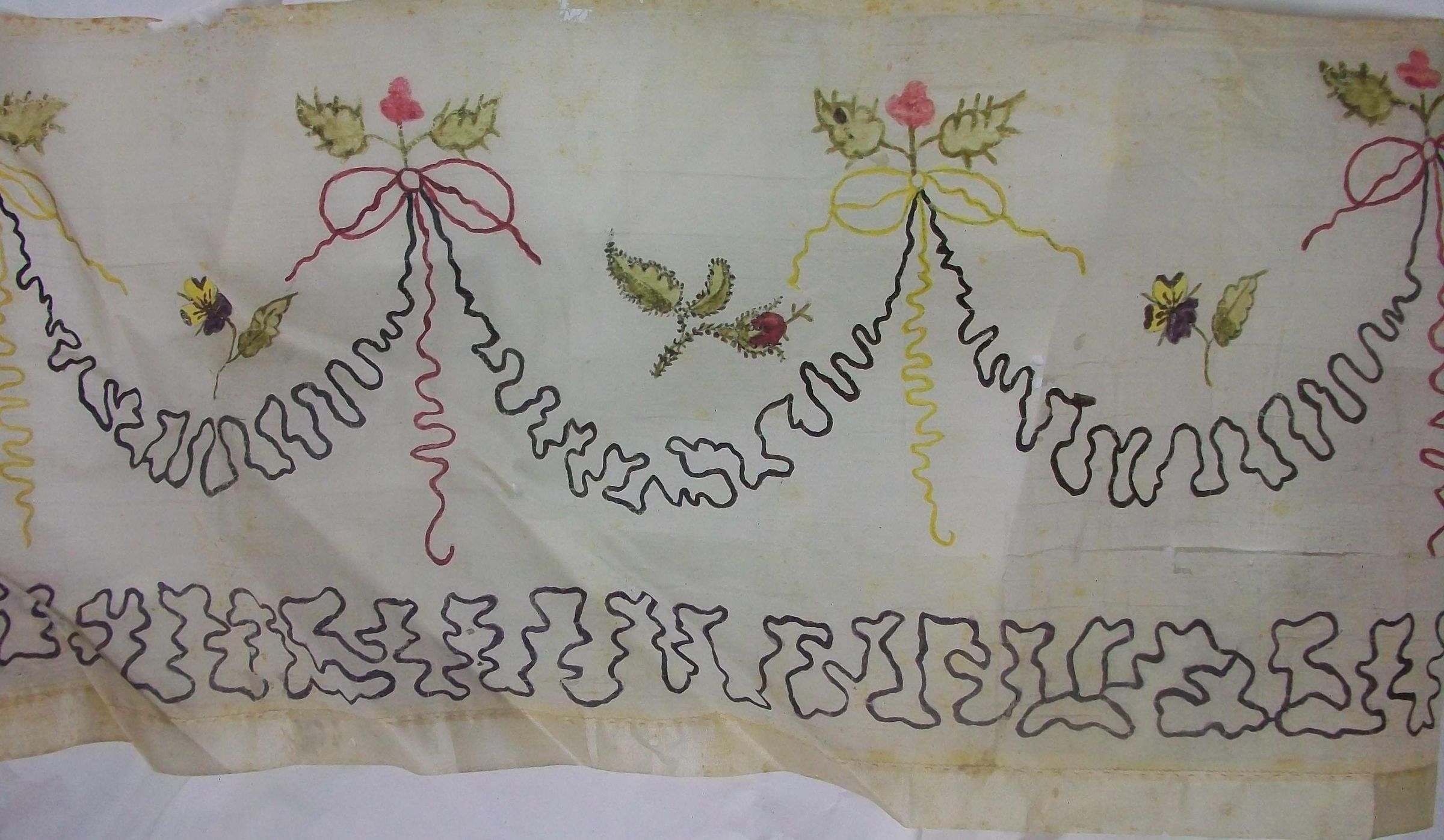 Hand-painted silk tiffany border or flounce. Painted in watercolors with bow knots, floral sprigs, and vermiculated swags and border motifs. A tape is sewn on to the bottom edge and the selvage edge is along the top.Dimensions