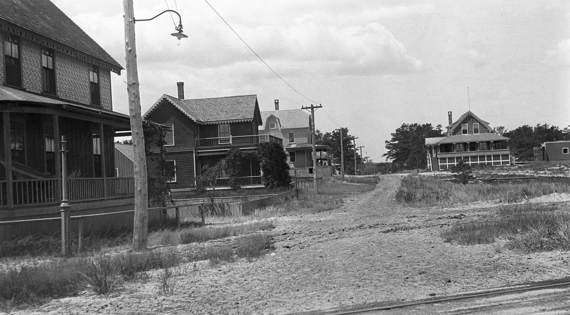 Negative print photo of Camp Ellis, ME. The tracks for the Dummy Railroad can be seen in the foreground.Made/Created