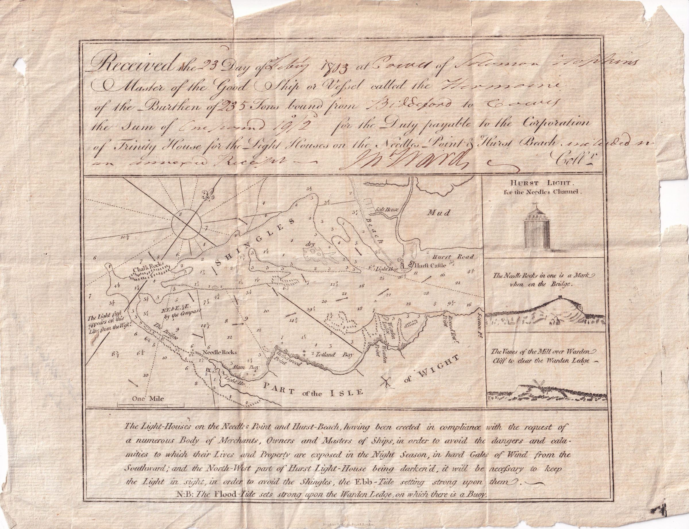 In February 1803, Solomon Hopkins, master of the ship Hermoine, approached the Isle of Wight, off the southern coast of England. He was bound from Biddeford to Cowy, a port on the north side of the island. In order to reach that port he had to sail through the treacherous waters around the Needles on the island's westernmost point. Only a narrow channel was navigable between the Shingles bank of the southern coast of England and the Needles rocks, a narrow chalky peninsula that rises from jagged rocks to 120-meter high cliffs. The map on this document shows the location of Needle Rocks, the Shingles, the location of the Needles lighthouse, as well as indicating the route a vessel should take to pass safely through the area. This receipt also notes that Hopkins paid one pound, nineteen shillings, and two pence to the Corporation of Trinity House, the organization responsible for constructing and maintaining the local lighthouses.