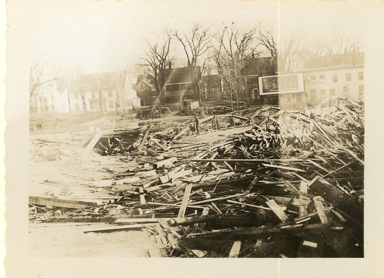 Black and white print photograph of Saco River flood damage. Workers gather and look at damage. From the Sawyer House Collection.