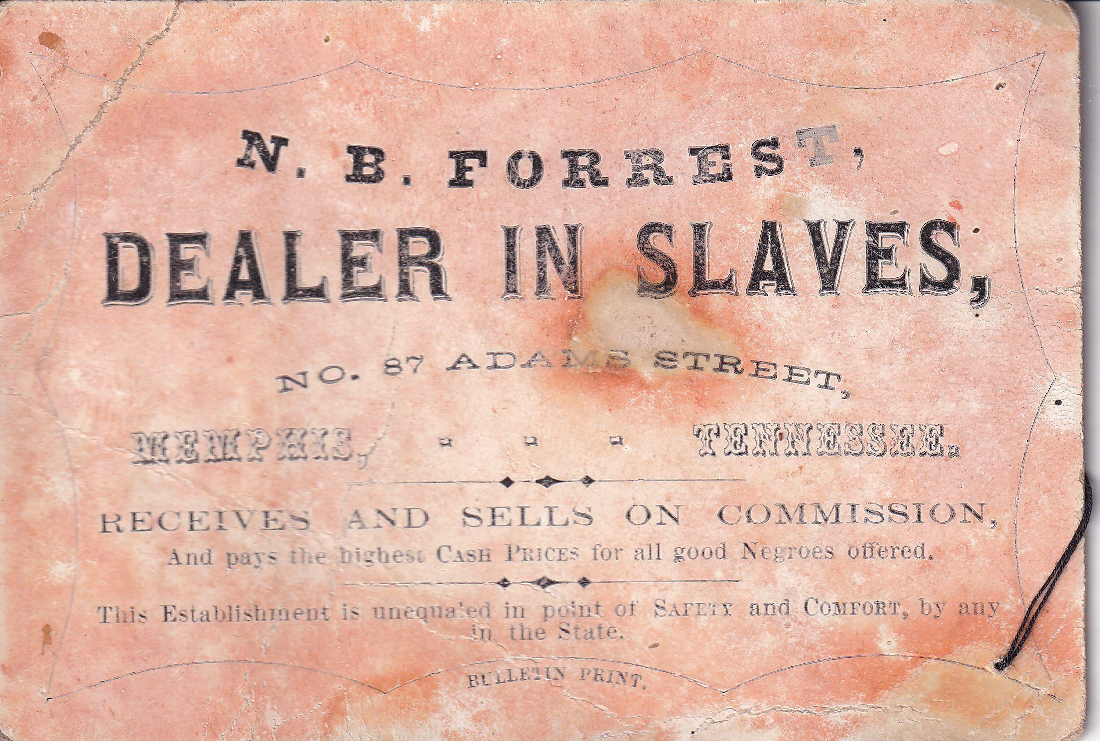 It is a mystery as to why a slave dealer's business card came to be attached to this 1817 Farmer's Almanac. The card belonged to Nathan Bedford Forrest, who operated his slave-trading site at 87 Adams Street, the center for the slave trade in Memphis; he lived next door at 85 Adams. In the mid-1850s, Memphis emerged as a regional hub for the southern slave trade. Most of the enslaved people purchased there ended up on plantations in the Mississippi Delta or farther south. Forrest appears to have been unique among Memphis traders in his willingness to engage in the smuggling of Africans into the United States, in clear violation of federal law. In 1859, he sold seven Africans "direct from the Congo" at his yard.