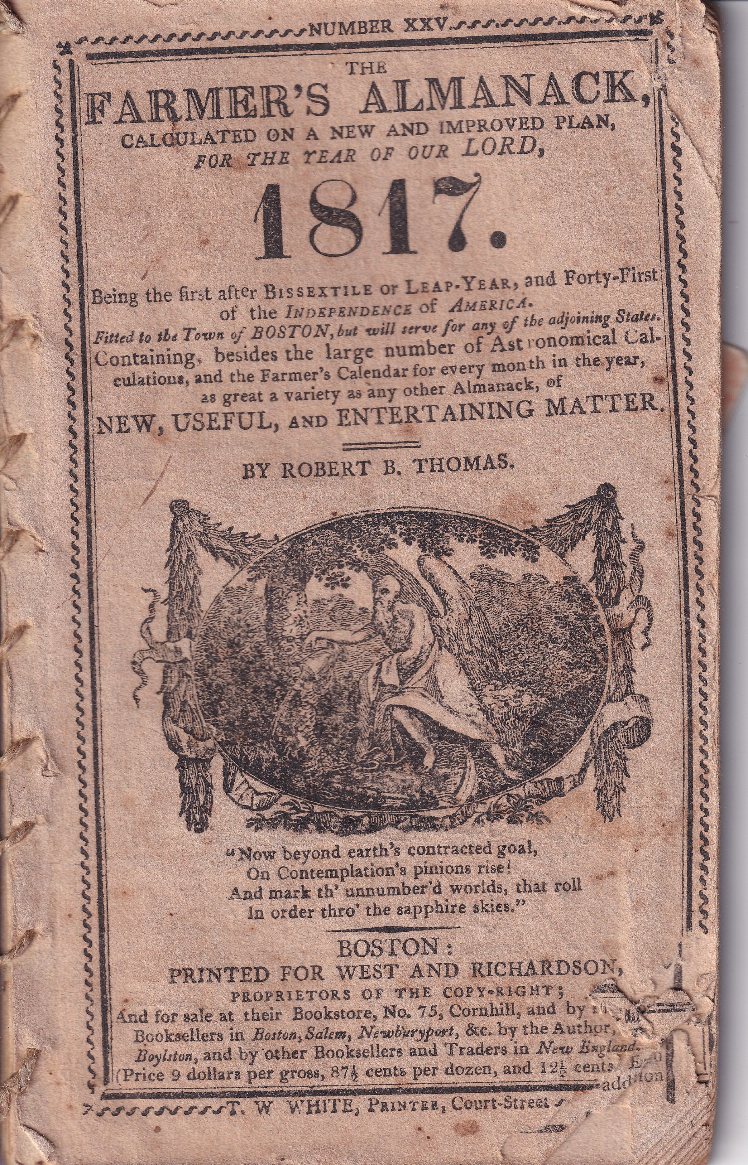 "The Farmer's Almanack, Calculated on a New and Improved Plan, For the Year of our Lord, 1817," Number XXV, by Robert B. Thomas, Printed in Boston for West and Richards. Attached to the almanack by a thread loop is a business card for Nathan Bedford Forrest, "Dealer in Slaves," No. 87 Adams Street, Memphis, Tennessee. On the reverse of the card is "George E. Tuxbury / Union / S.C. /1866"Dimensions