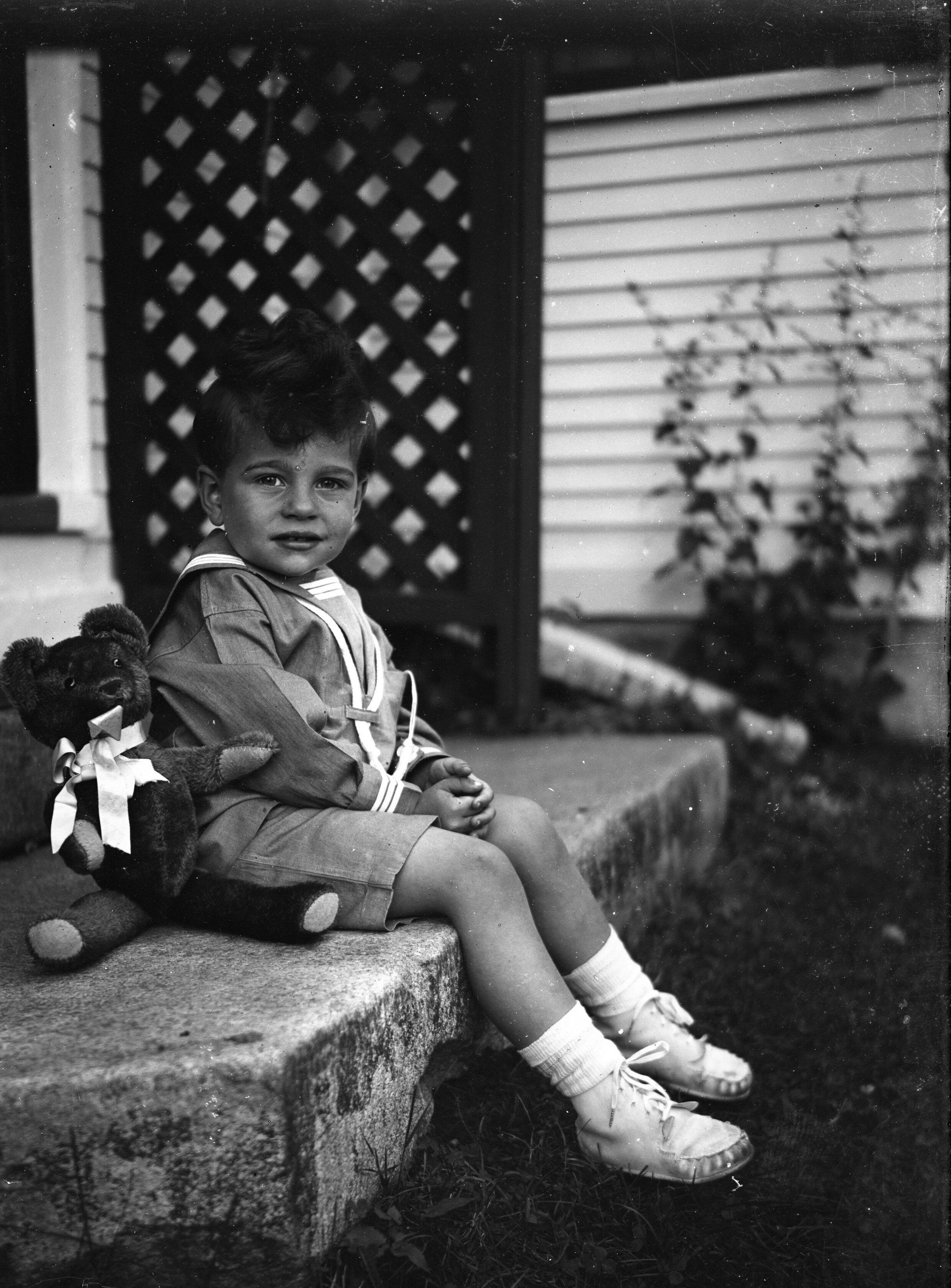 Glass plate negative photo of an unidentified boy sitting with a teddy bear. (The same boy appears in 1993.21.380, .391, .392, .393, and .420)Made/Created