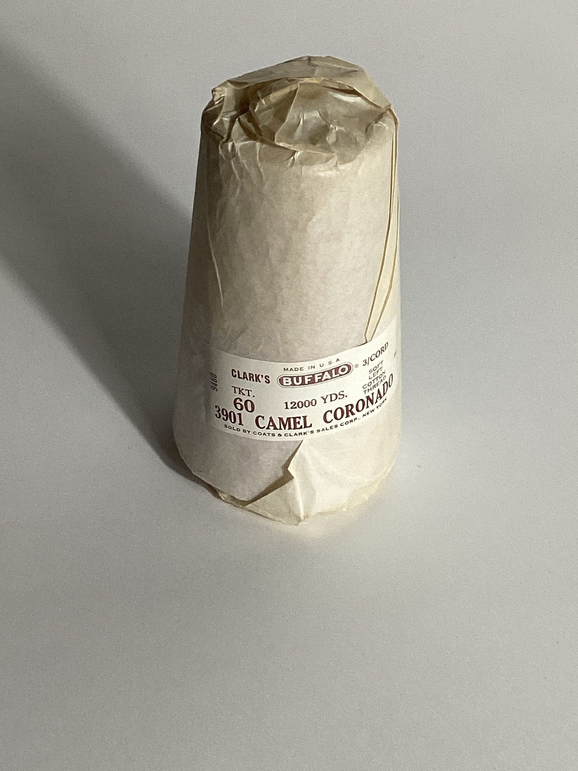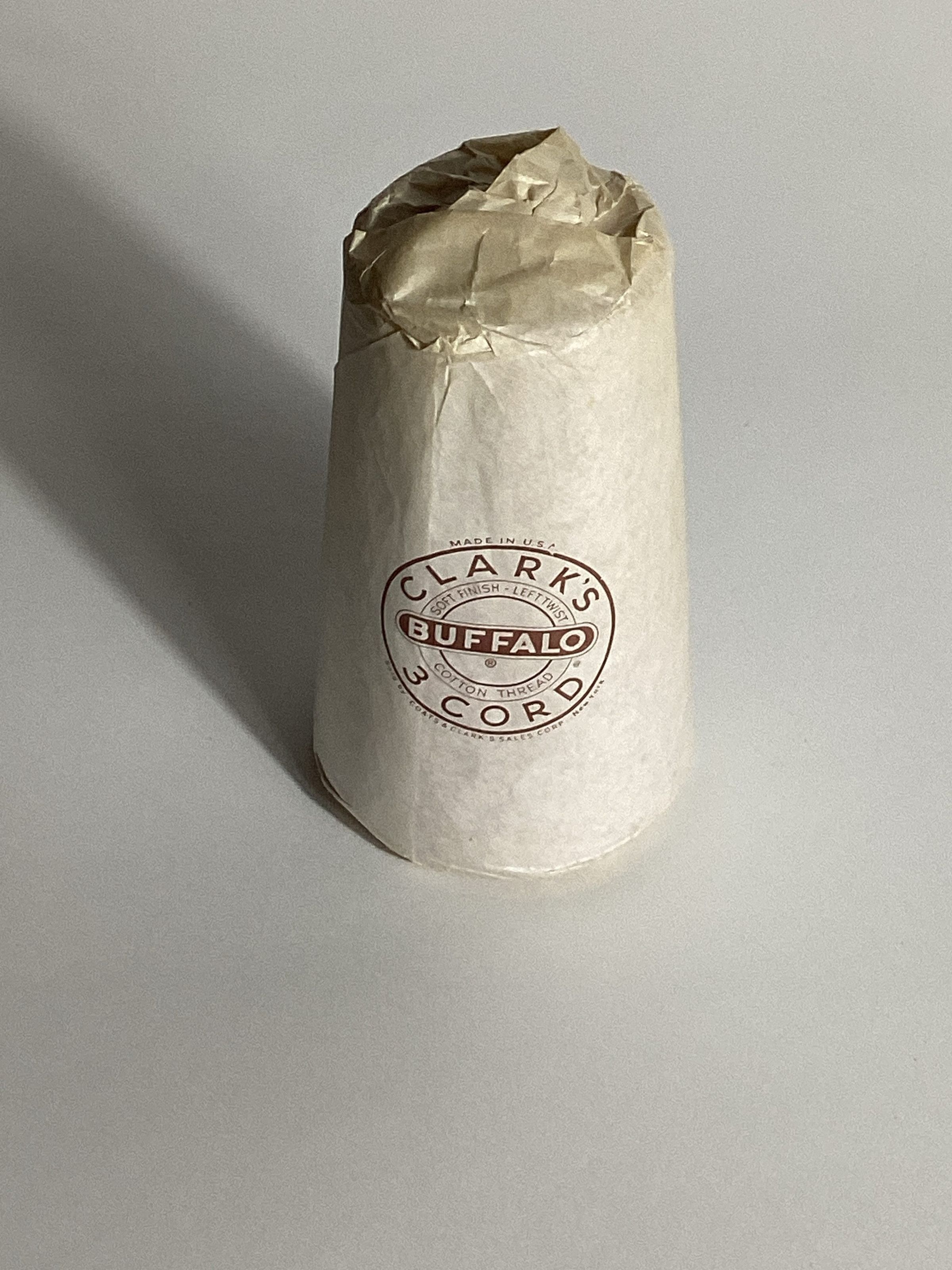 Paper wrapped cone of Clark's Buffalo cotton cord used to hem blankets or other bedding at the Pepperell Manufacturing Company.