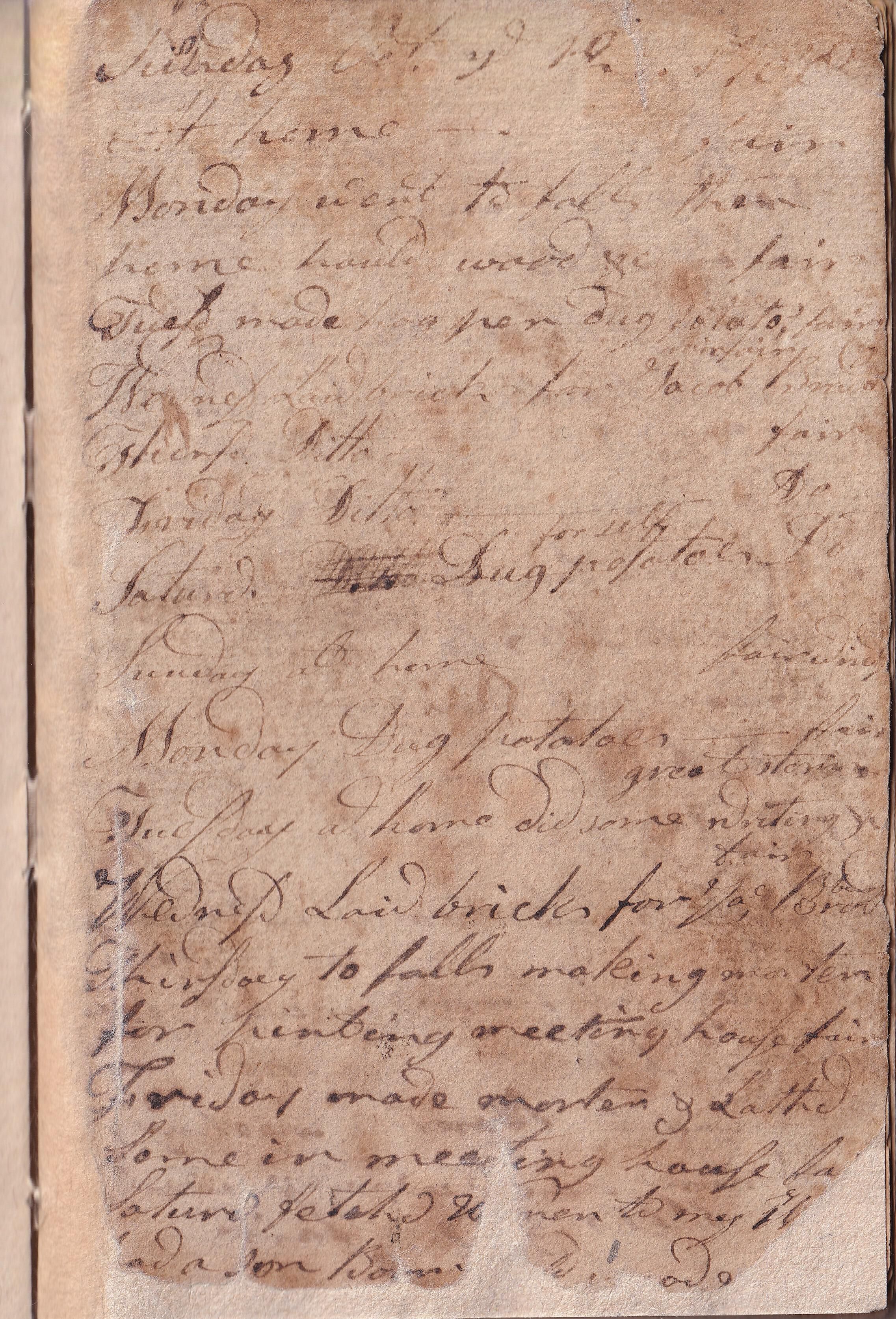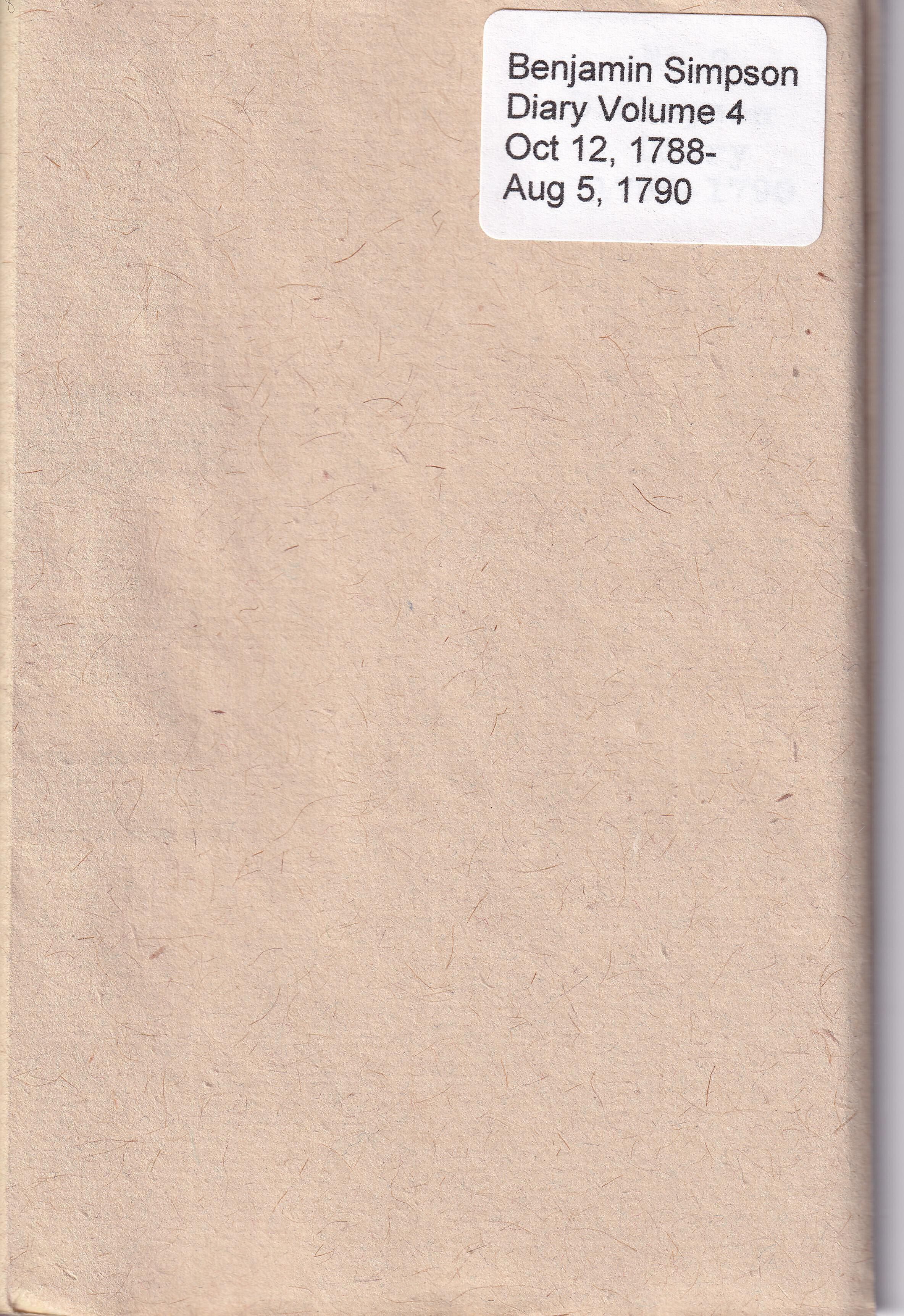 Fourth volume of the diary of Benjamin Simpson of Saco, 1781-1849. This volume covers the period October 12, 1788 through August 5, 1790. It is handwritten in ink on rag paper with a handsewn binding; it is now housed in a modern paper cover. Most of the entries are a single line. The date is listed at the top of each page, with individual entries (without dates) listed below. Simpson noted his major task of the day and the weather. His entries reflect the seasonal nature of the work of a man who owned a farm but also was a skilled mason. There is an overlap of dates in volume 3 (1874.150.31) and volume 4. Volume 4 begins with October 12, 1788. Volume 3 ends with March 31, 1789. The overlapping entries in each book are the same. Simpson may have continued this practice of using small notebooks to record daily events before transcribing them into large volumes, or he may have discontinued the practice at some point later in his life.