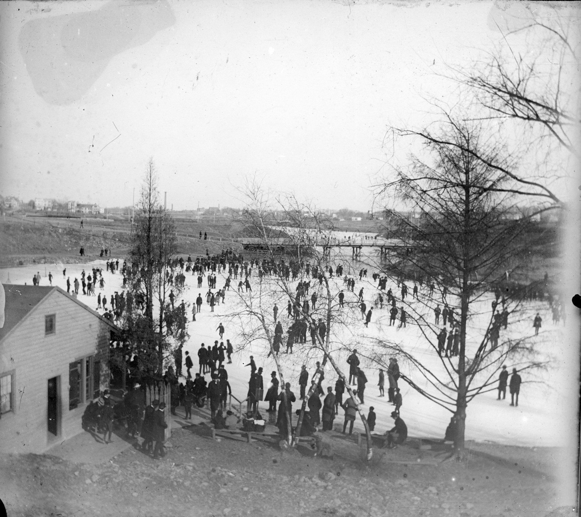 Glass lantern slide of an ice skating park. The location is unidentified, but it is likely Branch Brook Park in Newark, NJ.