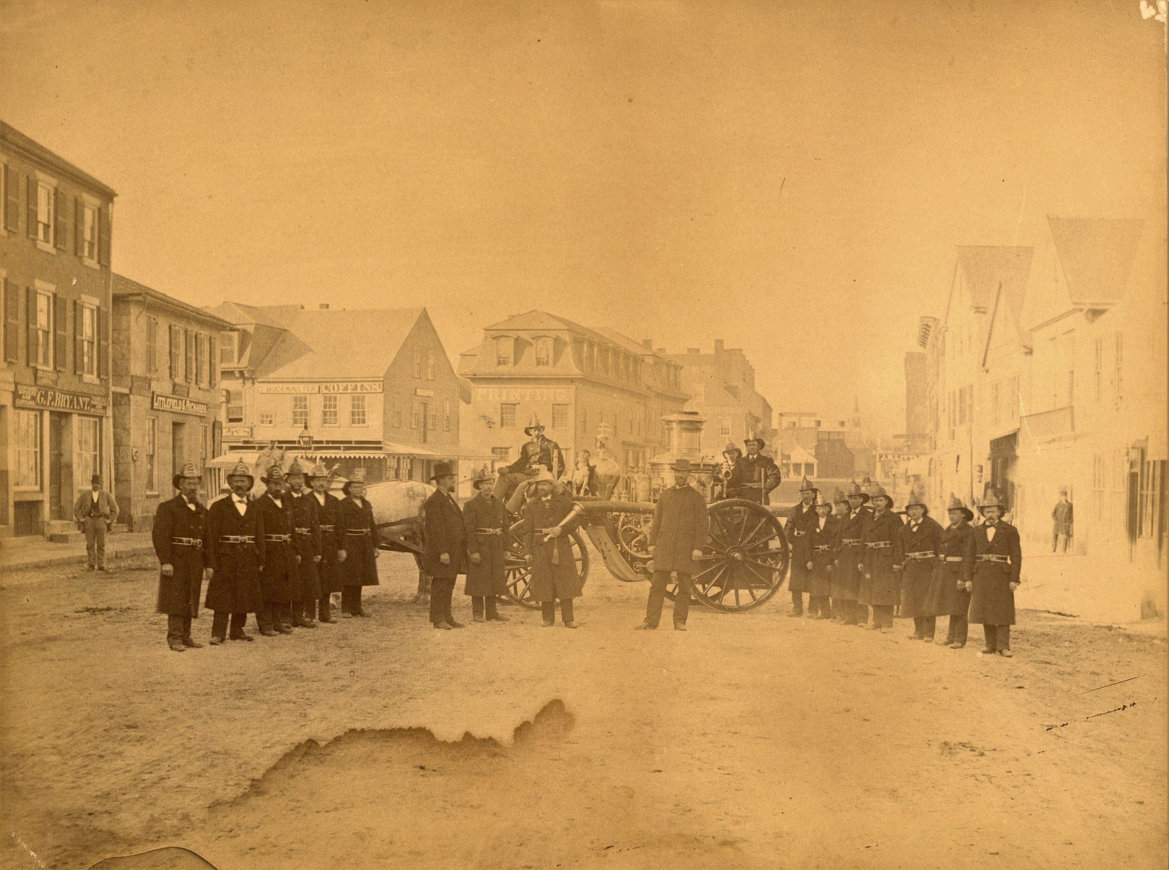 Photograph of the Saco Fire Brigade posing for a group photo on Main Street, Saco, circa 1872-1874. The same picture appears on both sides of this card. Several business names can be seen on the left, including G. F. Bryant (paints, oils, and glass store), Littlefield & Richards (grocery), T. Buckminster Coffins and "Printing" (William S. Noyes & Son - The York County Independent Newspaper). A sign for J.W. Littlefield (hats, caps and gent's furnishings) can be seen in the distance on the right. According to the businesses listed in the Saco & Biddeford Directories, this photo was taken sometime between 1872 and 1874.Made/Created