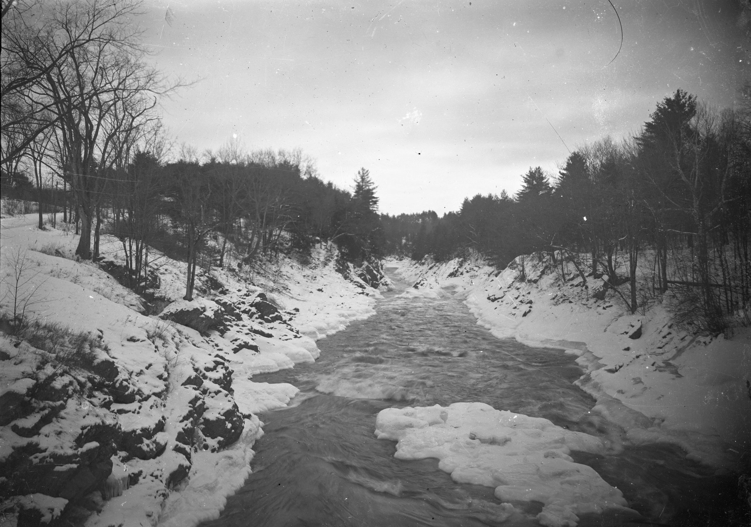 Glass plate negative photo of the Saco River, likely in the Buxton-Hollis area, during winter. A section of postcard is attached.Made/Created
