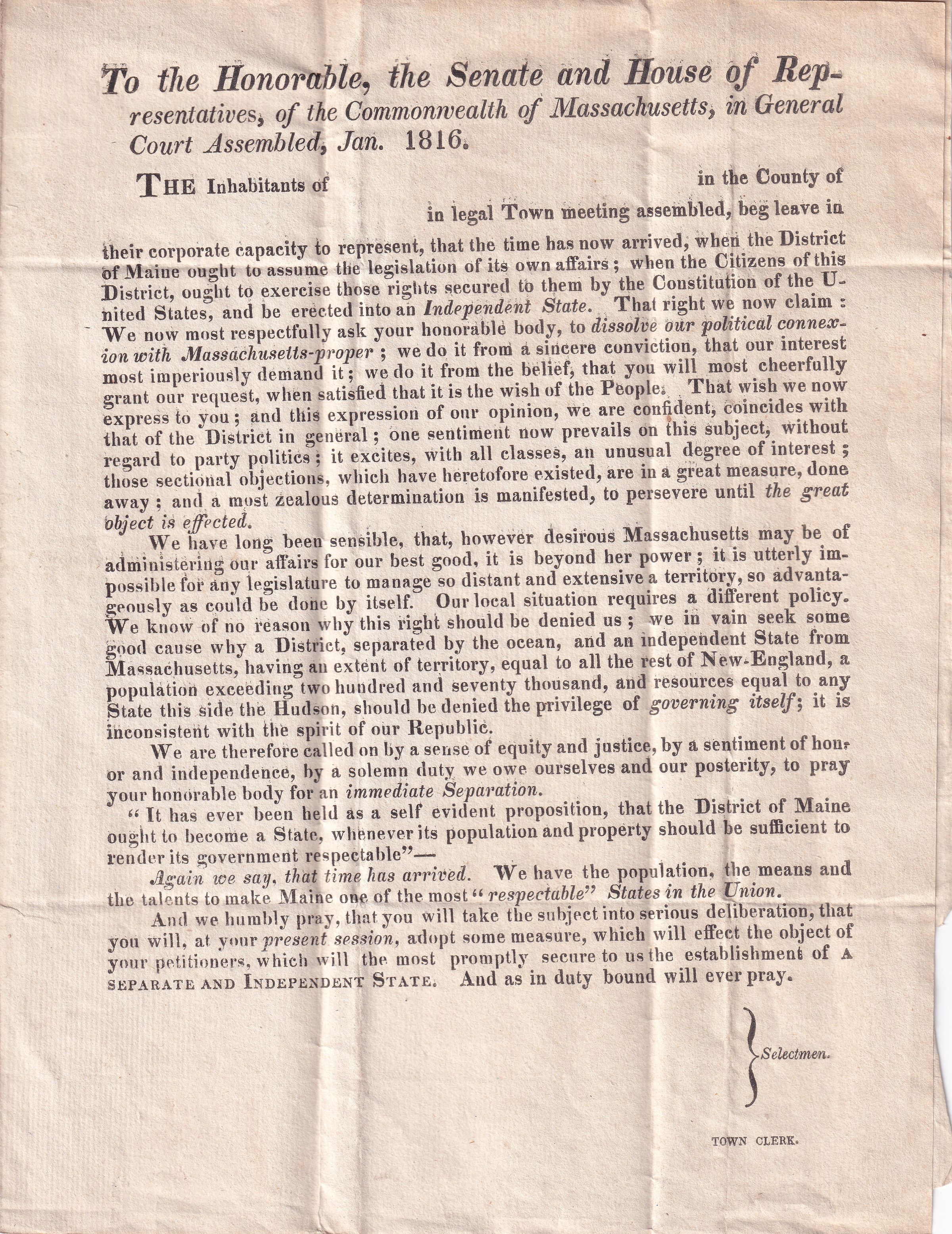 On the first Monday in September 1816, voters across Maine gathered at town meetings to vote on separation from Massachusetts. The selectmen of each town were to fill out this form with the results and send it on to a convention to be held in Brunswick at the end of the month. In order for the separation to happen, Maine residents had to vote for the measure by a five-to-four majority. Samuel Merrill recorded in his diary that the vote was unsuccessful in Biddeford: 43 for separation and 88 against. In the end, most inland towns voted for separation but most coastal towns did not. The final vote was 11,969 in favor and 10,347 opposed. While a majority, it was not sufficient to pass.