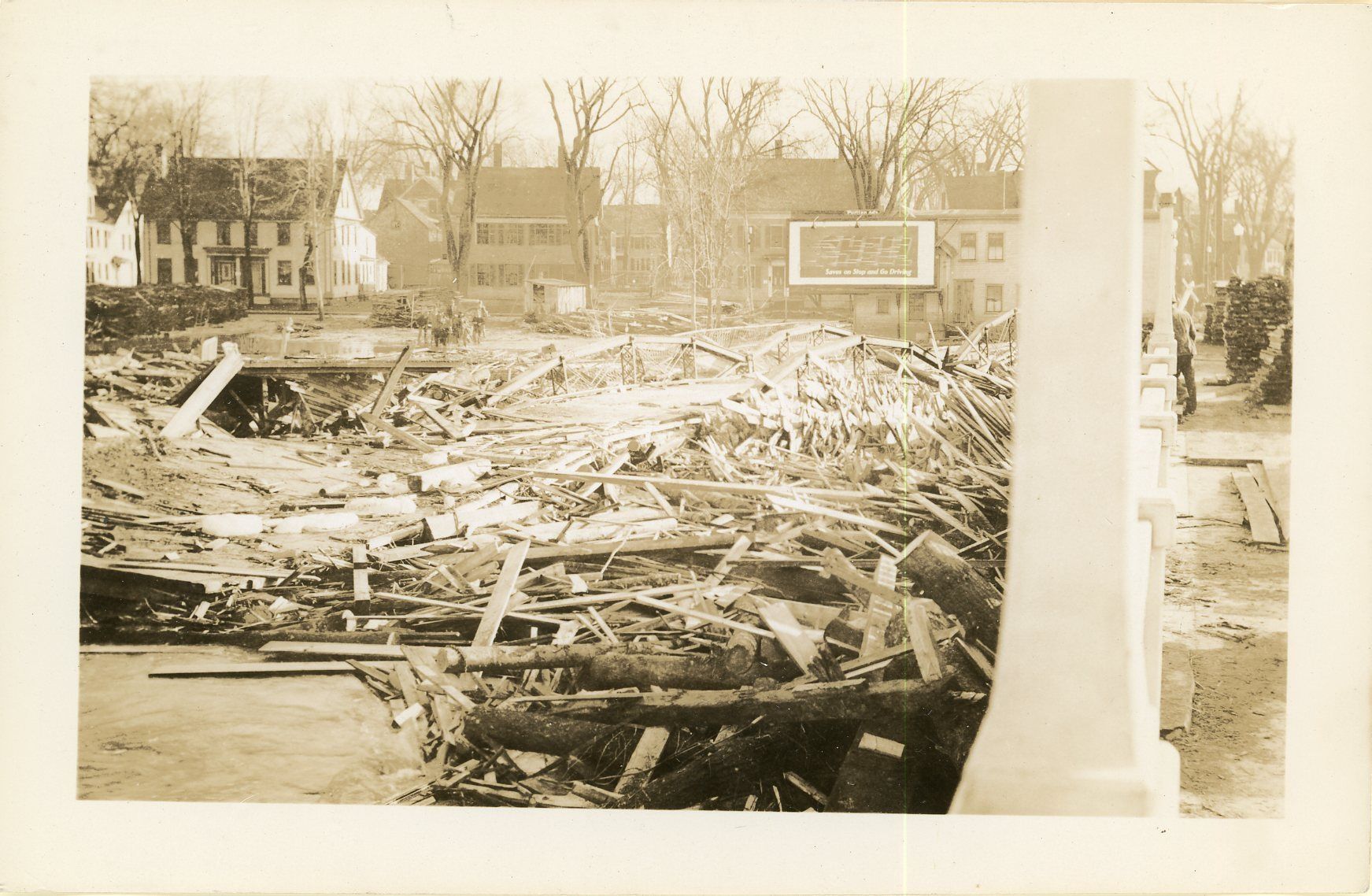 Black and white print photograph of Saco River flood damage in Saco, Maine depicting workers observing damage. From the Sawyer House Collection.Dimensions
