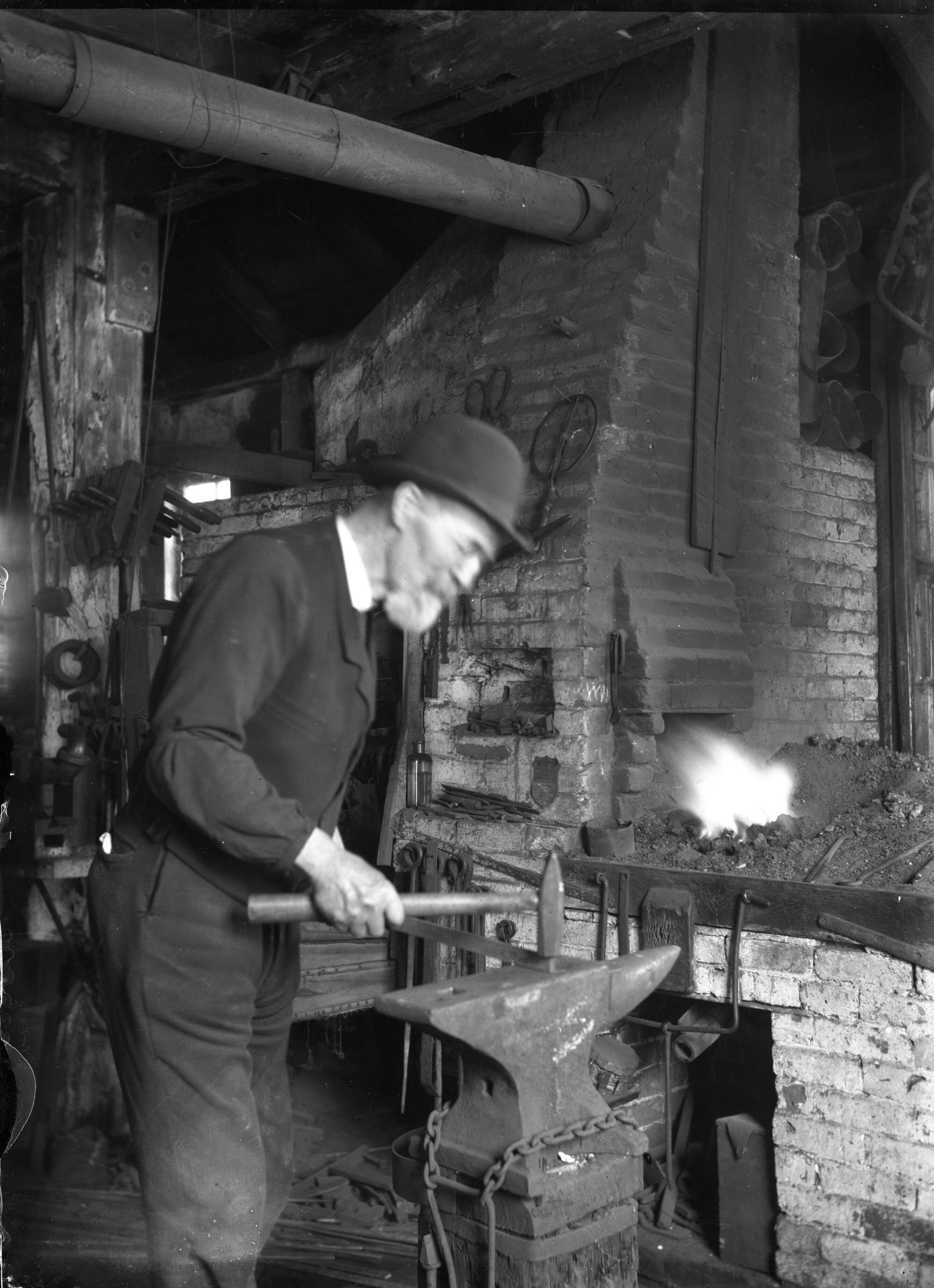 Glass plate negative photo of a blacksmith working with anvil and hammer.
