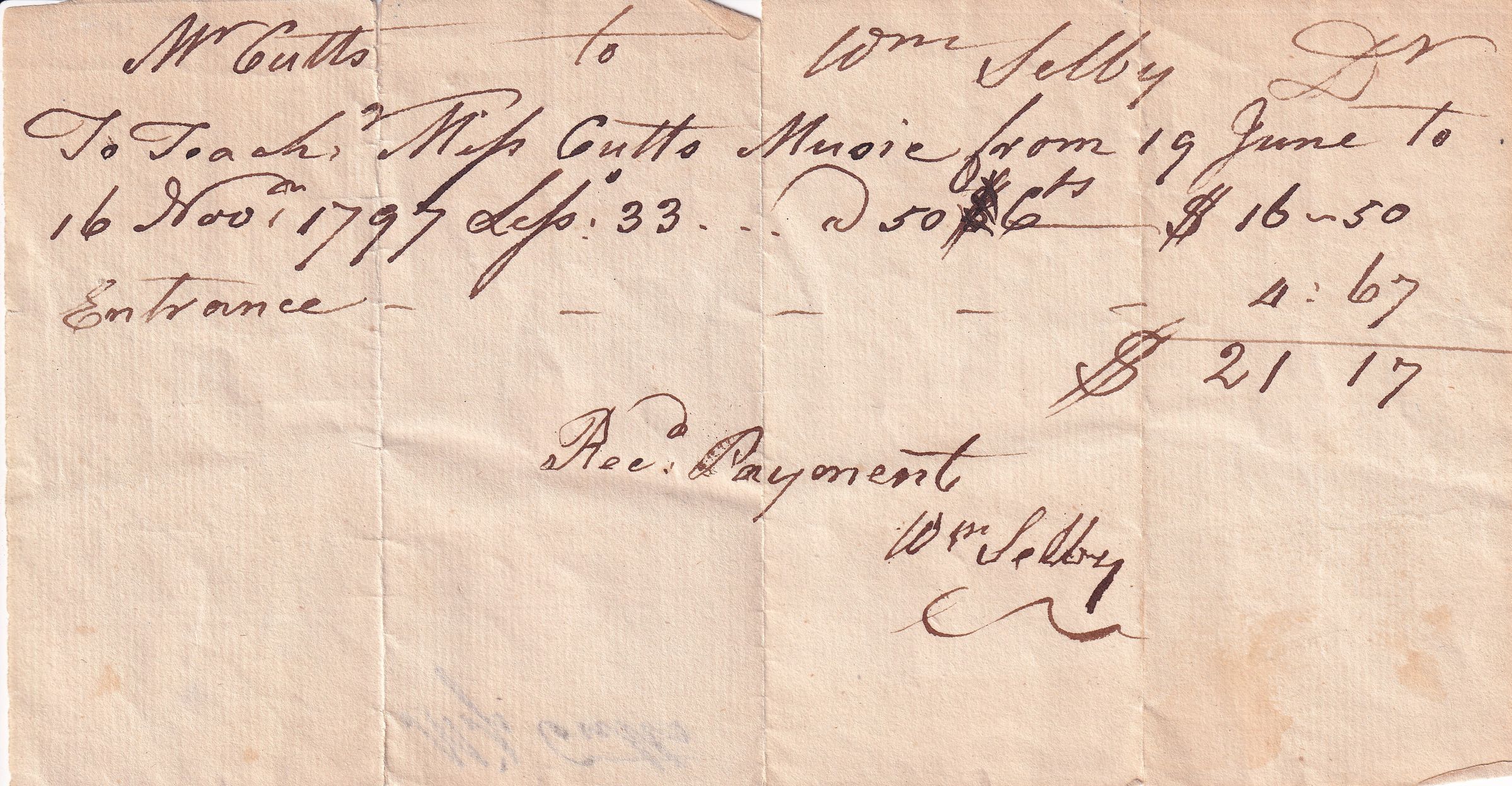 Receipt for William Selby ackowledging that he had received payment from Thomas Cutts for $21.17 for teaching his daughter Eunice music from June 19 to Nov. 16, 1797. Eunice was attending school in Boston at the time.Dimensions