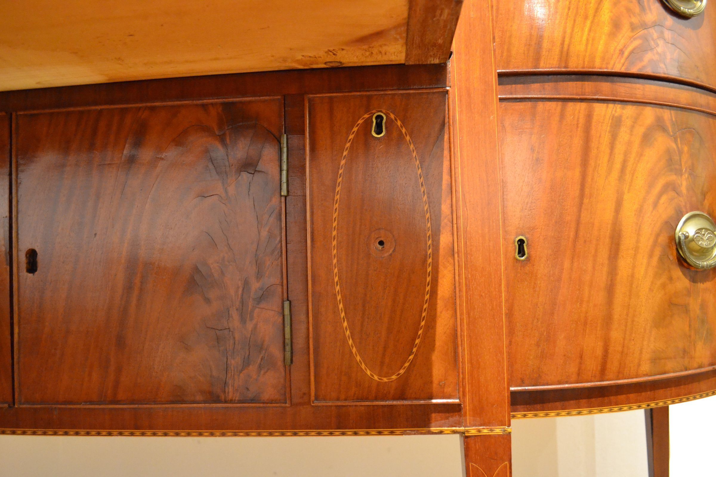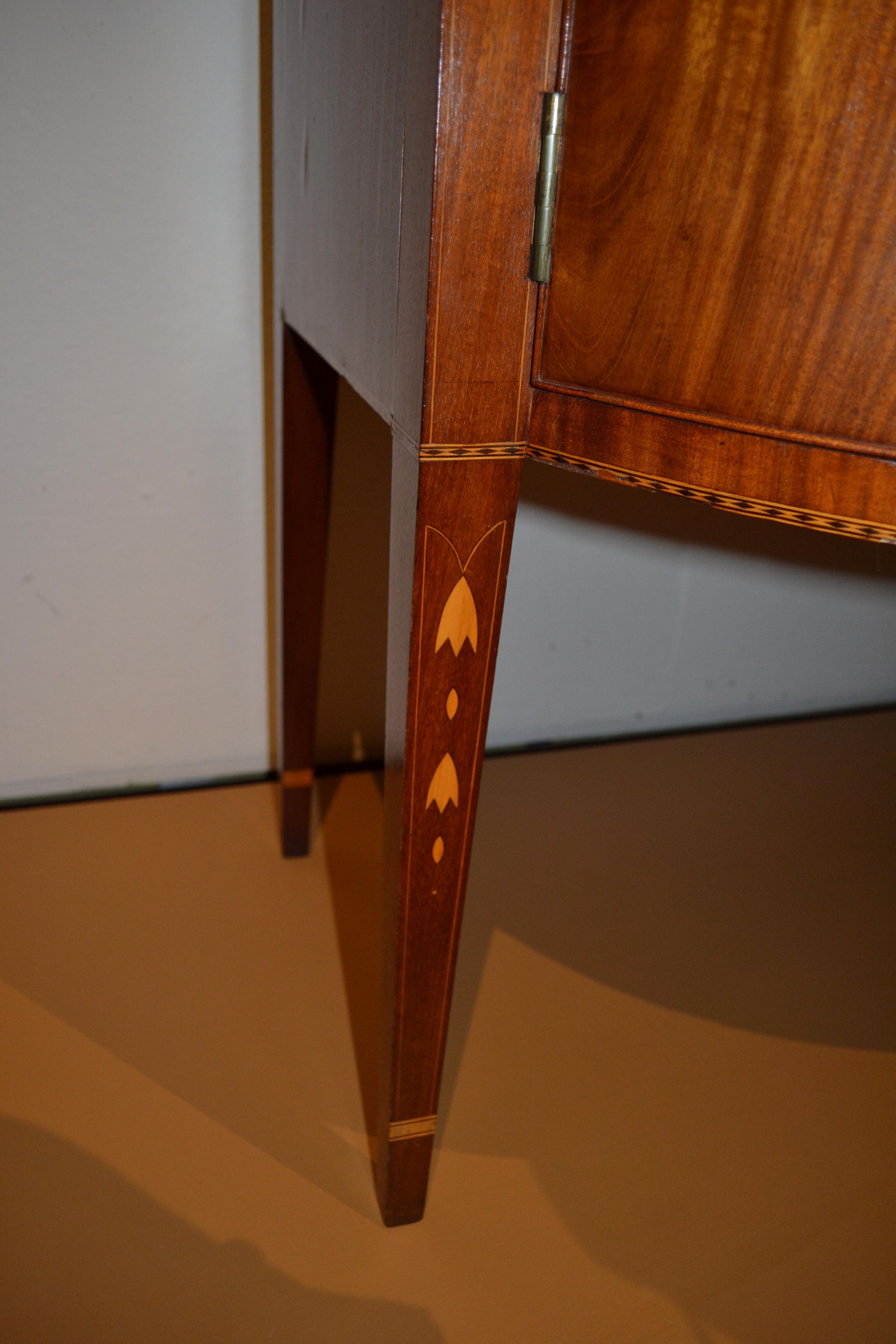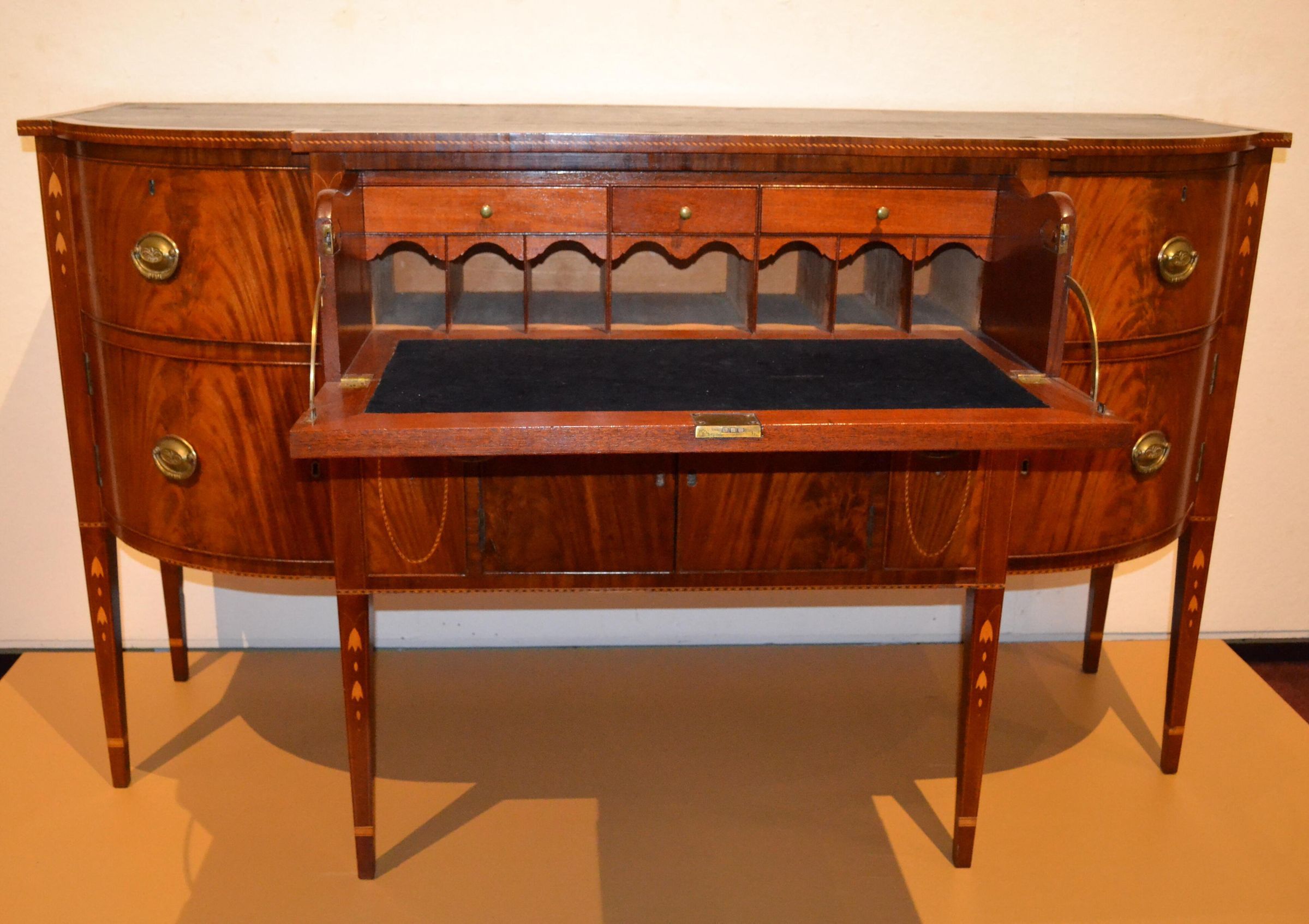 Sideboards were designed for the display and storage of glassware and silver for dining. However, this sideboard had an additional purpose: it also served as a desk. The "secretary drawer" was a new feature introduced into furniture design in the last quarter of the 18th century. According to Hepplewhite, a writing surface was created "by the face of the upper drawer falling down by means of a spring and quadrant, which produces the same usefulness as the flap to a desk." The narrow, deep drawers below the writing surface are "cellerette" or bottle drawers for the storage of liquors. The black oilcloth covering on the top is original and was a practical way to protect against spills. This sideboard belonged to Colonel Thomas Cutts of Saco, who had two sideboards recorded in his 1821 probate inventory. One in the “lower west room” was valued at $30 and the other in the in the “north lower room or parlour” was worth $20.
