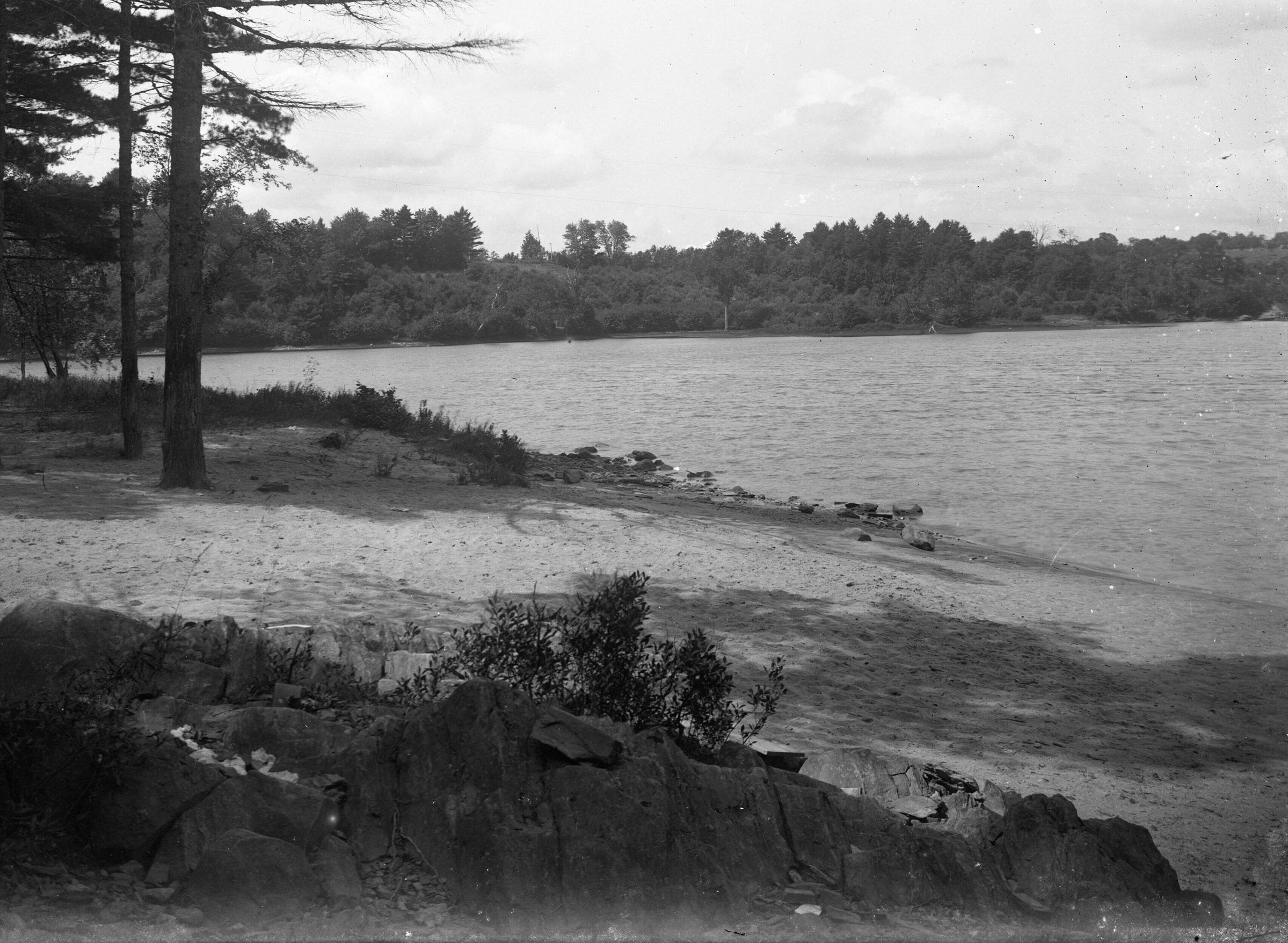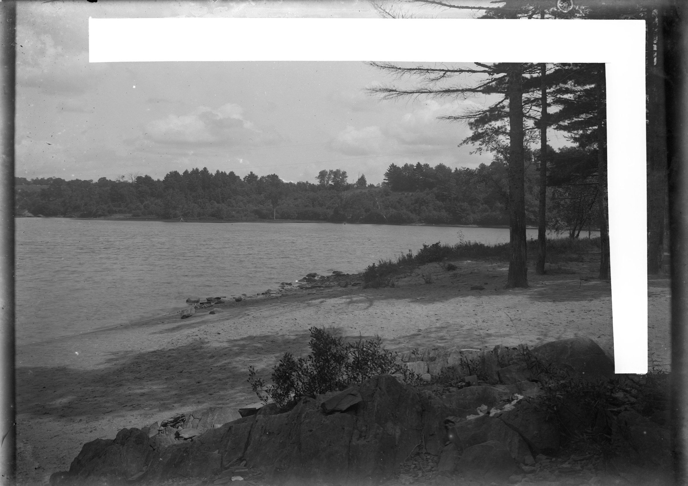 Glass plate negative photo of the Saco River, likely in the Buxton-Hollis area. A section of a postcard is attached on the back with "Aug. 17, 1929" written in pencil.Made/Created