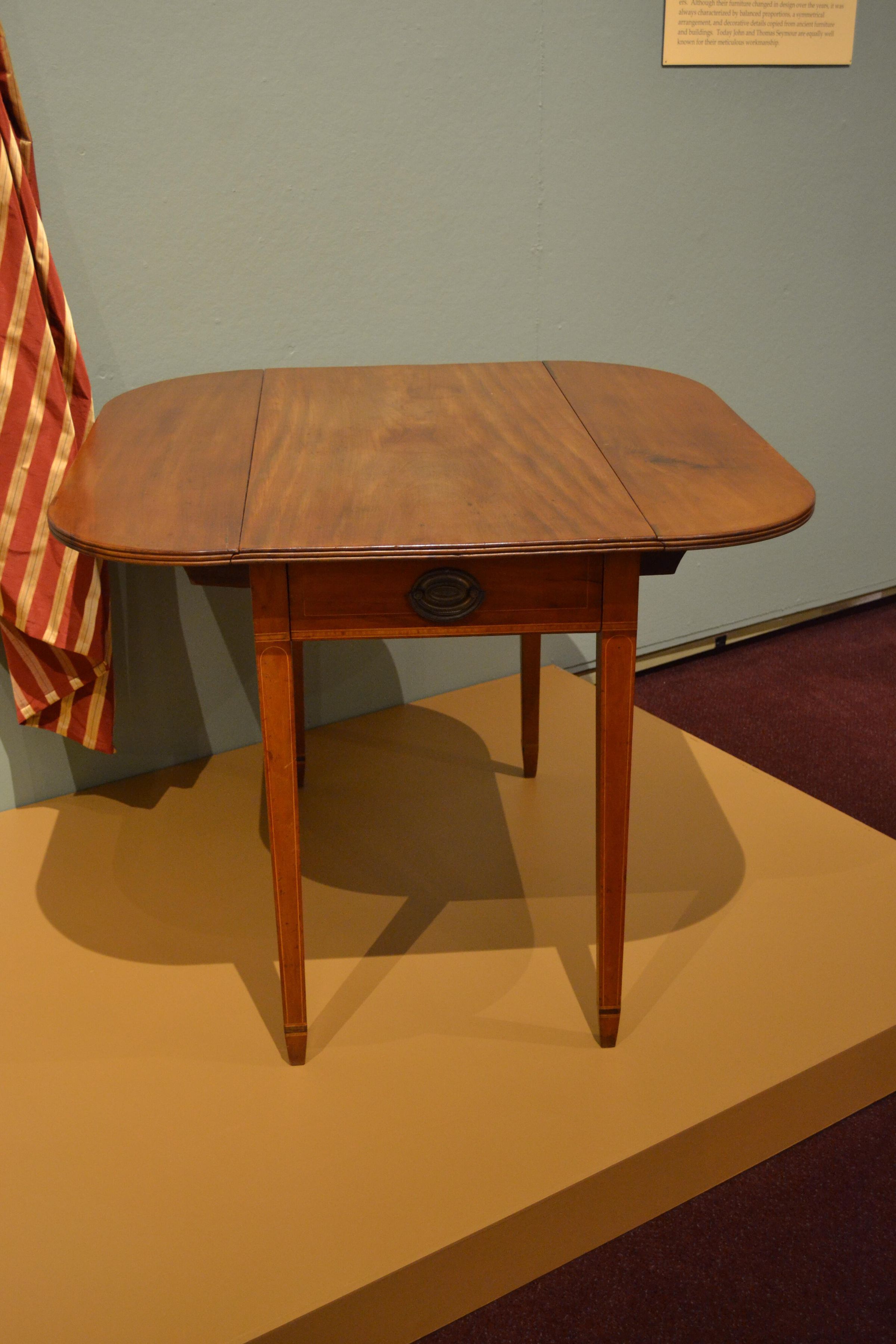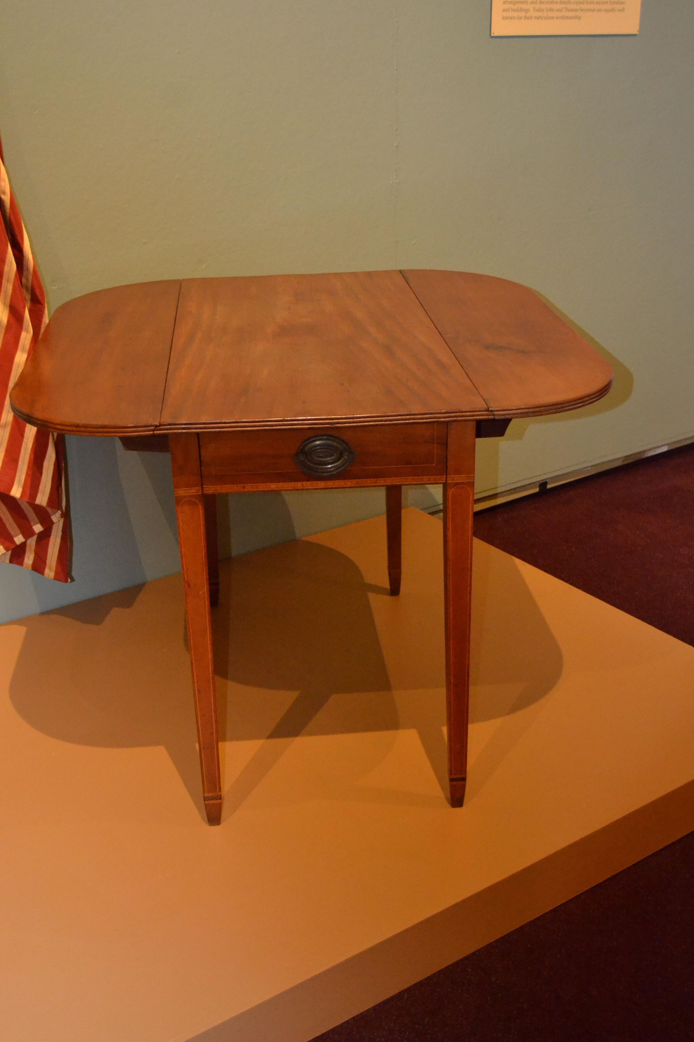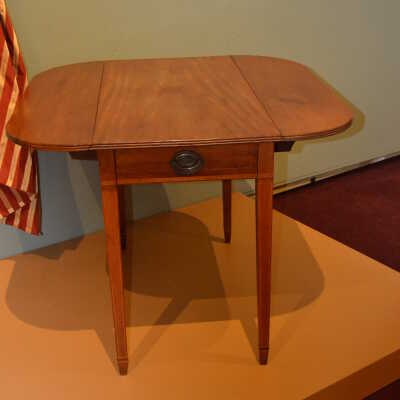 Pembroke tables, often spelled "Pembrook," appear frequently in probate inventories and auction listings in Boston and Portland during the Federal period. Small and lightweight, they were easily moved around. With the leaves extended, they provided a good surface for tea drinking or card playing, writing, or serving light meals. Because they were often used for dining, they also were frequently referred to as “breakfast” tables. This is one of the few Pembroke tables that can be firmly attributed to John and Thomas Seymour. It is also one of the few pieces attributed to them that were probably made during the decade they worked in Portland. Double-tapered legs, like the ones on this table, were often used by the Seymours in their earlier years. The table originally belonged to Colonel Thomas Cutts. His 1821 probate inventory lists "1 small leafed table $5" in the lower west room.