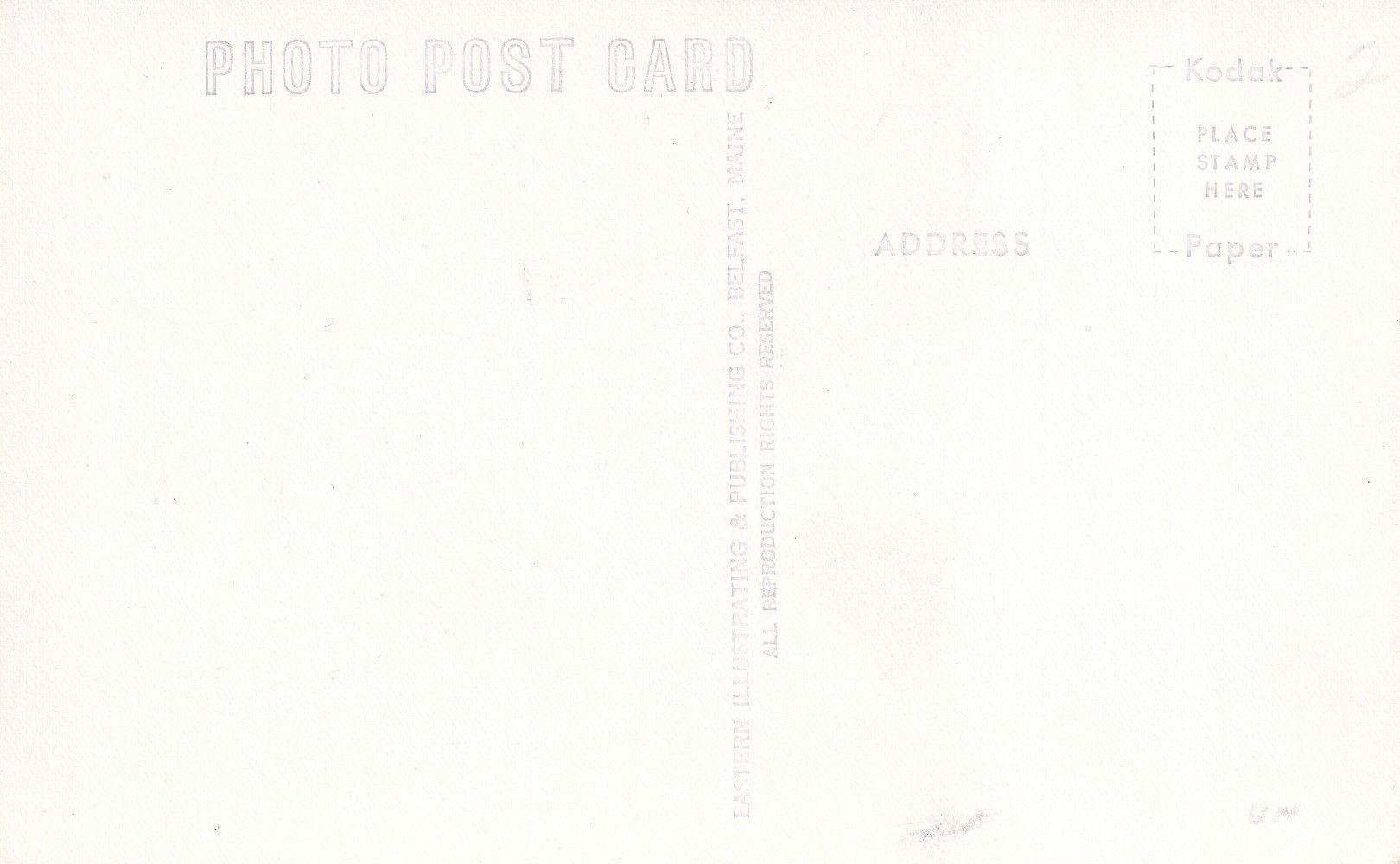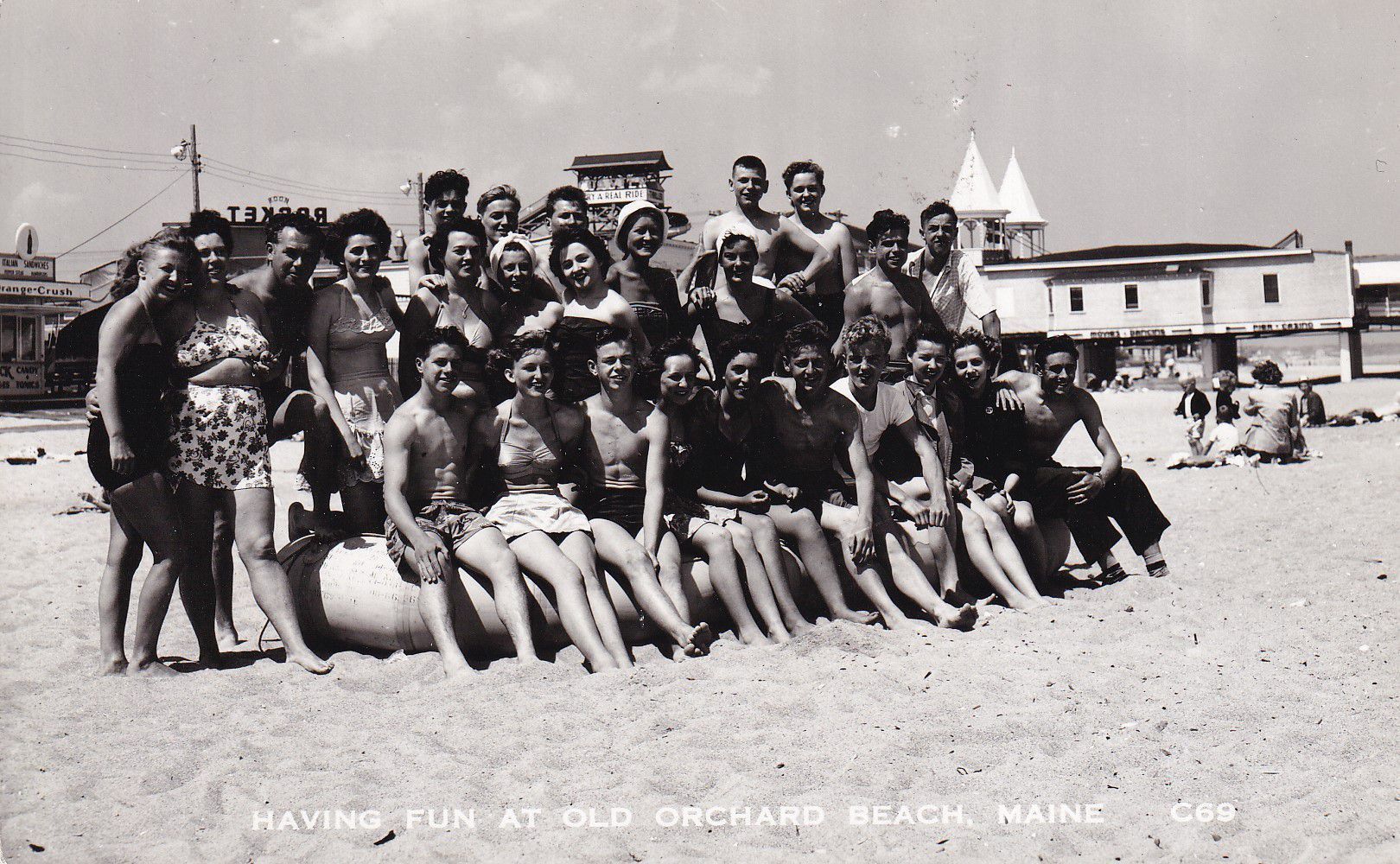 A postcard bearing a black and white photograph of a group photo of 26 people on the beach with attractions in the background.